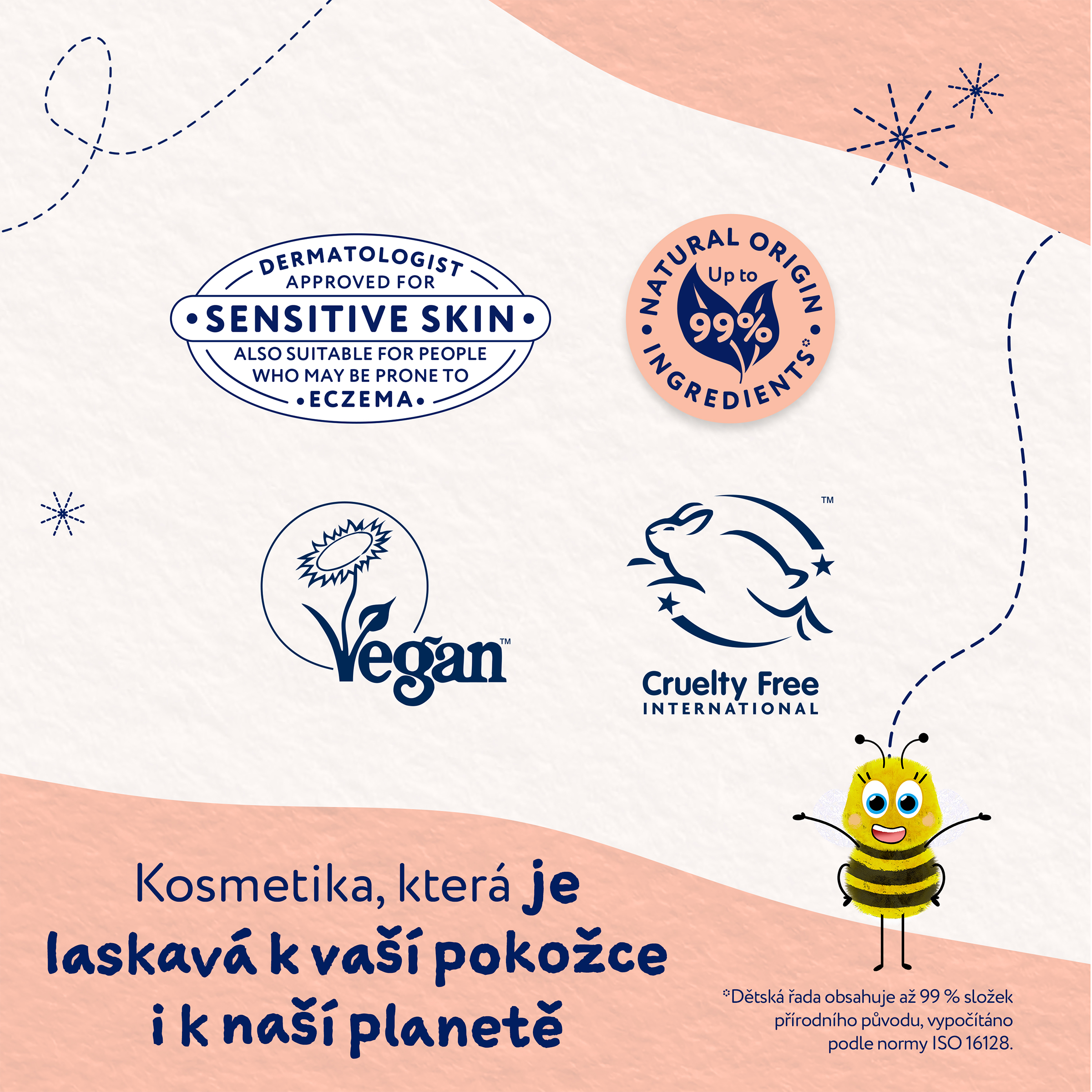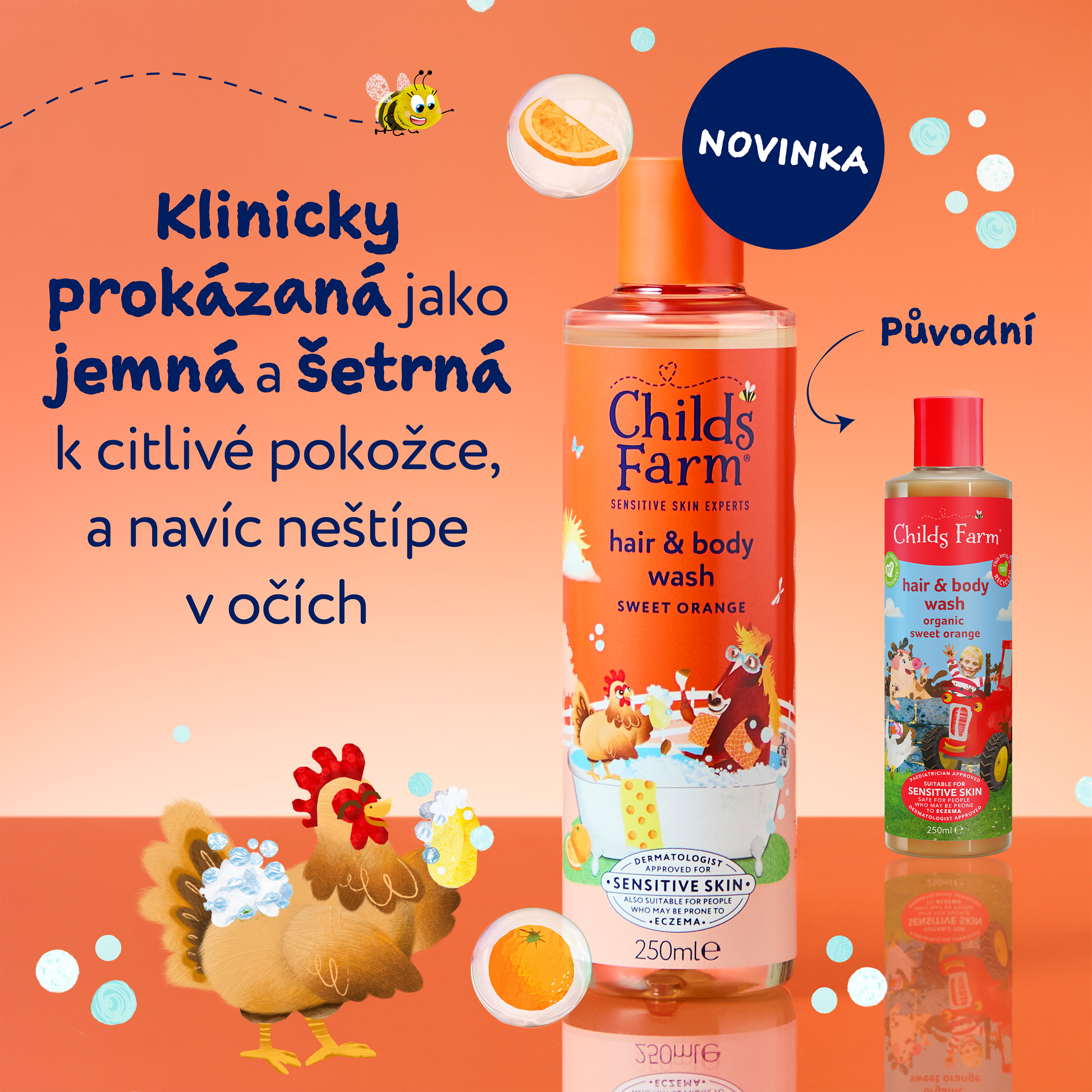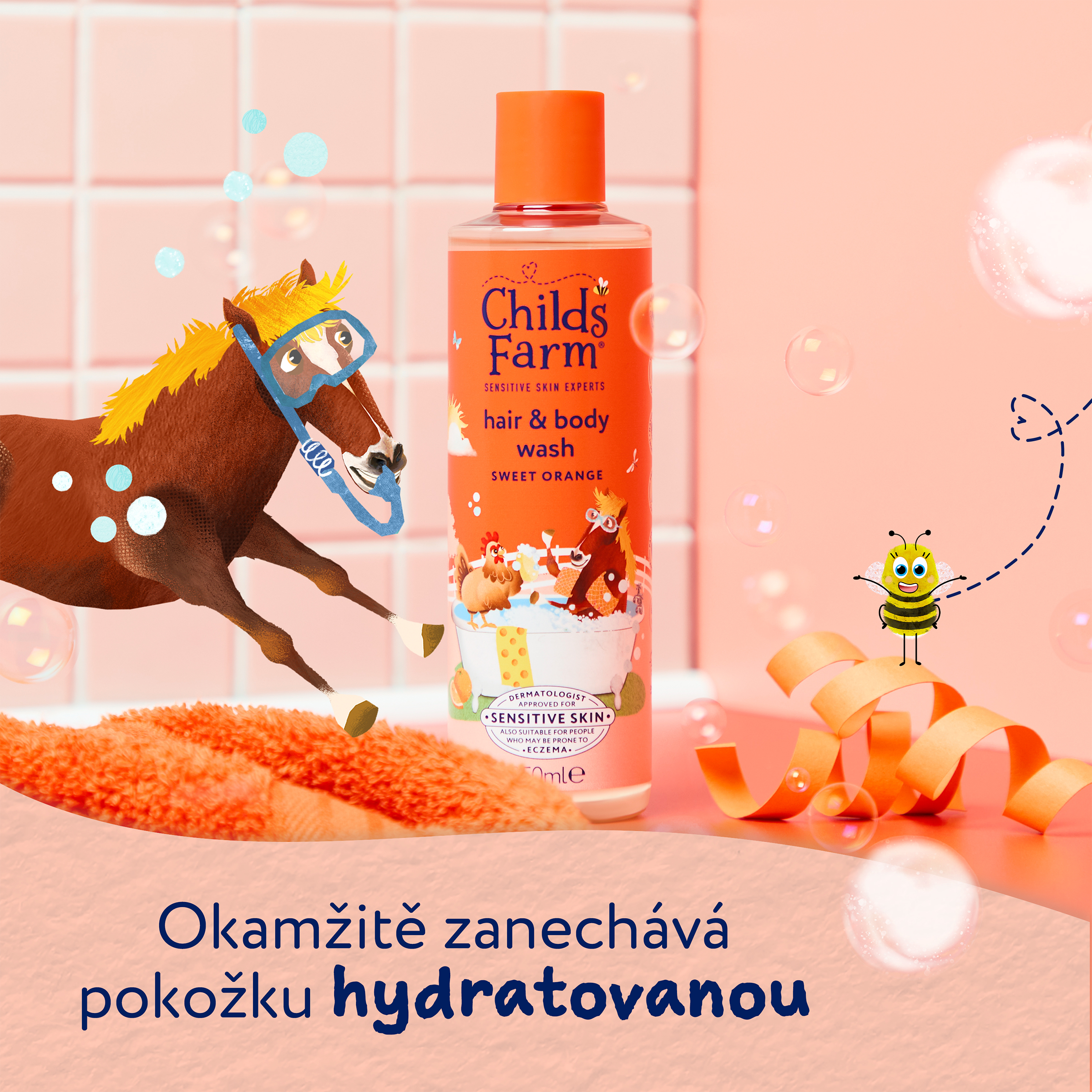 Dětská mycí emulze na vlasy a tělo s dlouhotrvající vůní sladkého pomeranče obsahuje glycerin a jemné čisticí složky z kukuřice a kokosu, které zanechávají pokožku i vlásky hydratované a vyživené. Mycí emulze je vhodná již od narození, pro všechny typy pokožky, a to včetně té citlivé a se sklonem k ekzémům, a navíc neštípe v očích. Produkty Childs Farm jsou schválené dermatology i pediatry a nesou označení vegan a cruelty free.