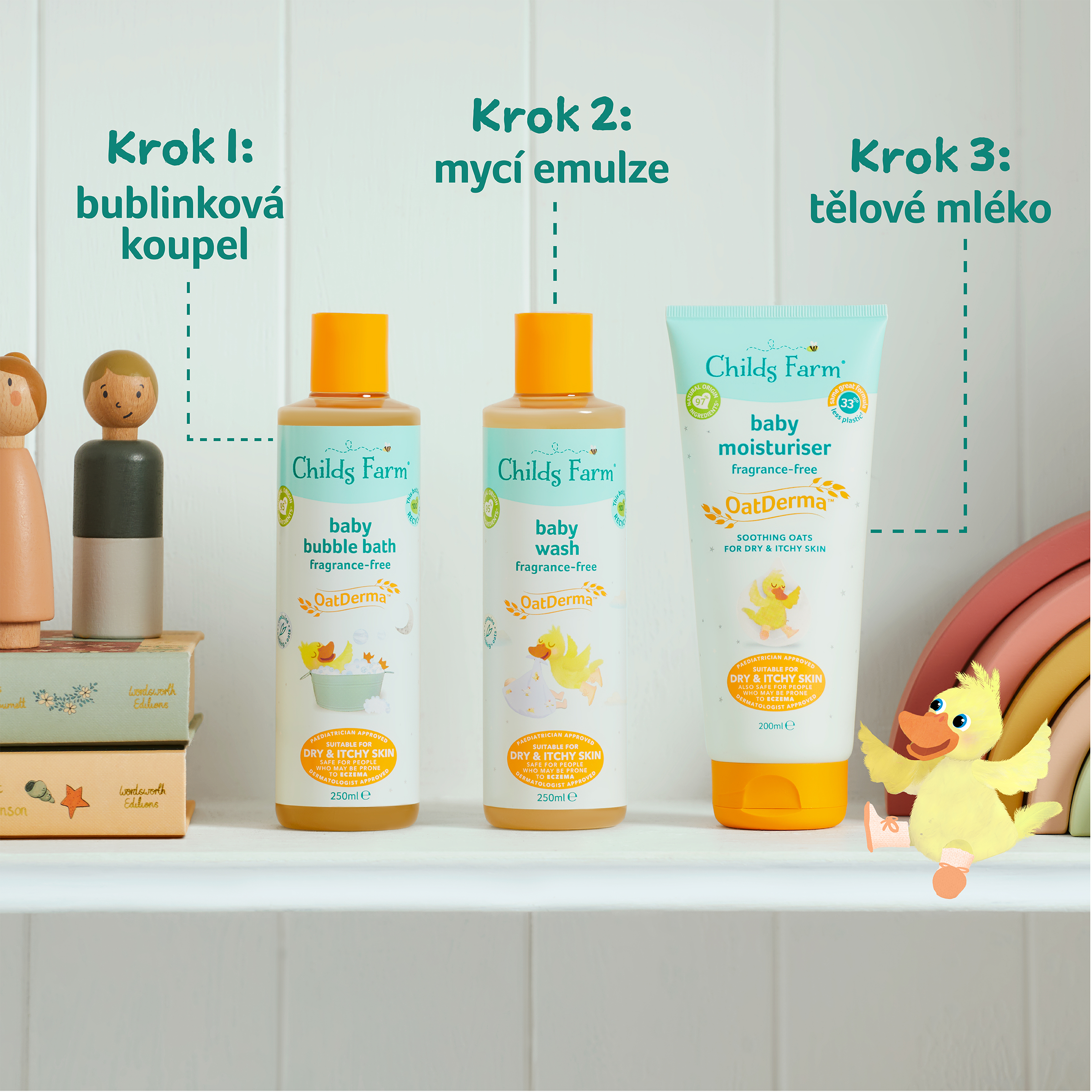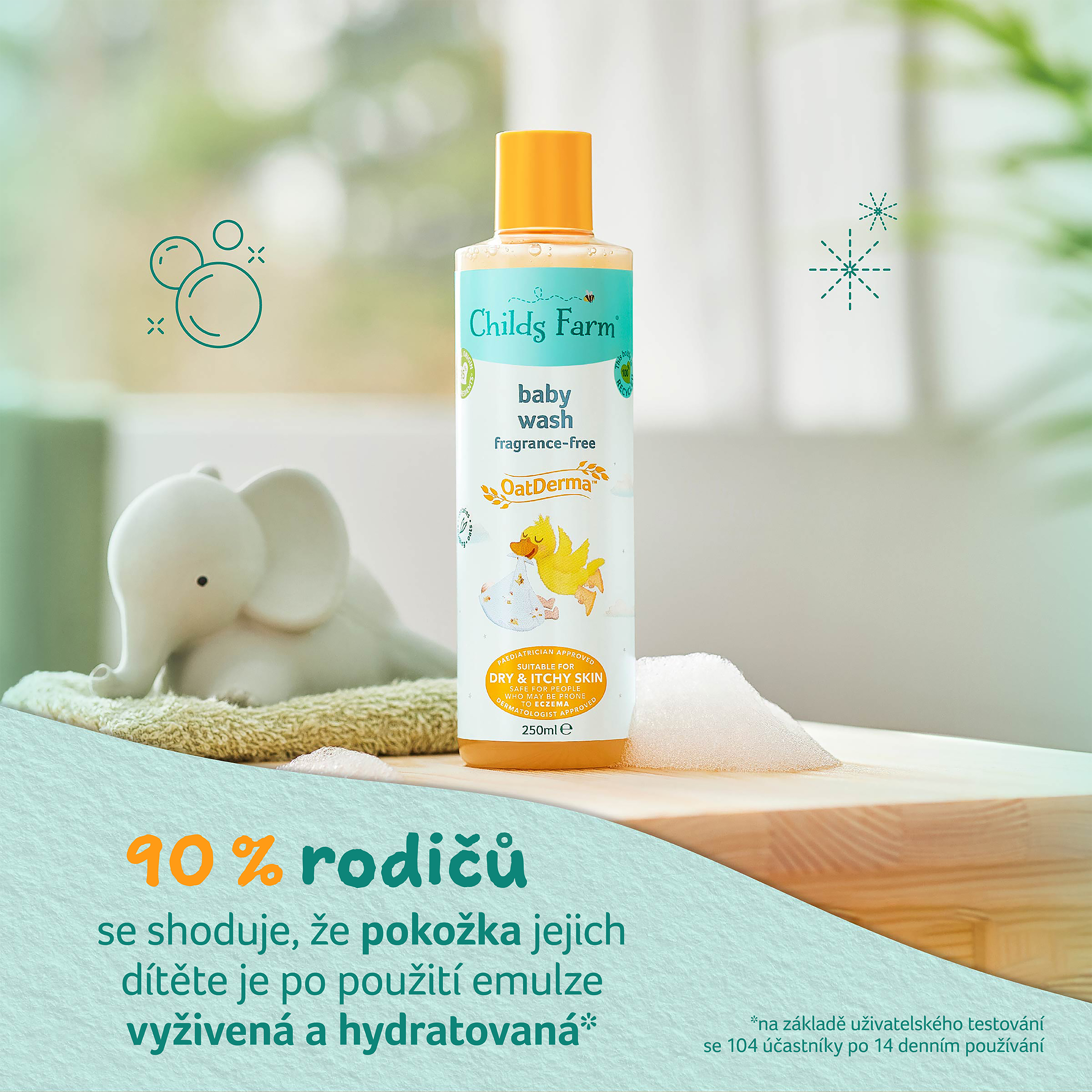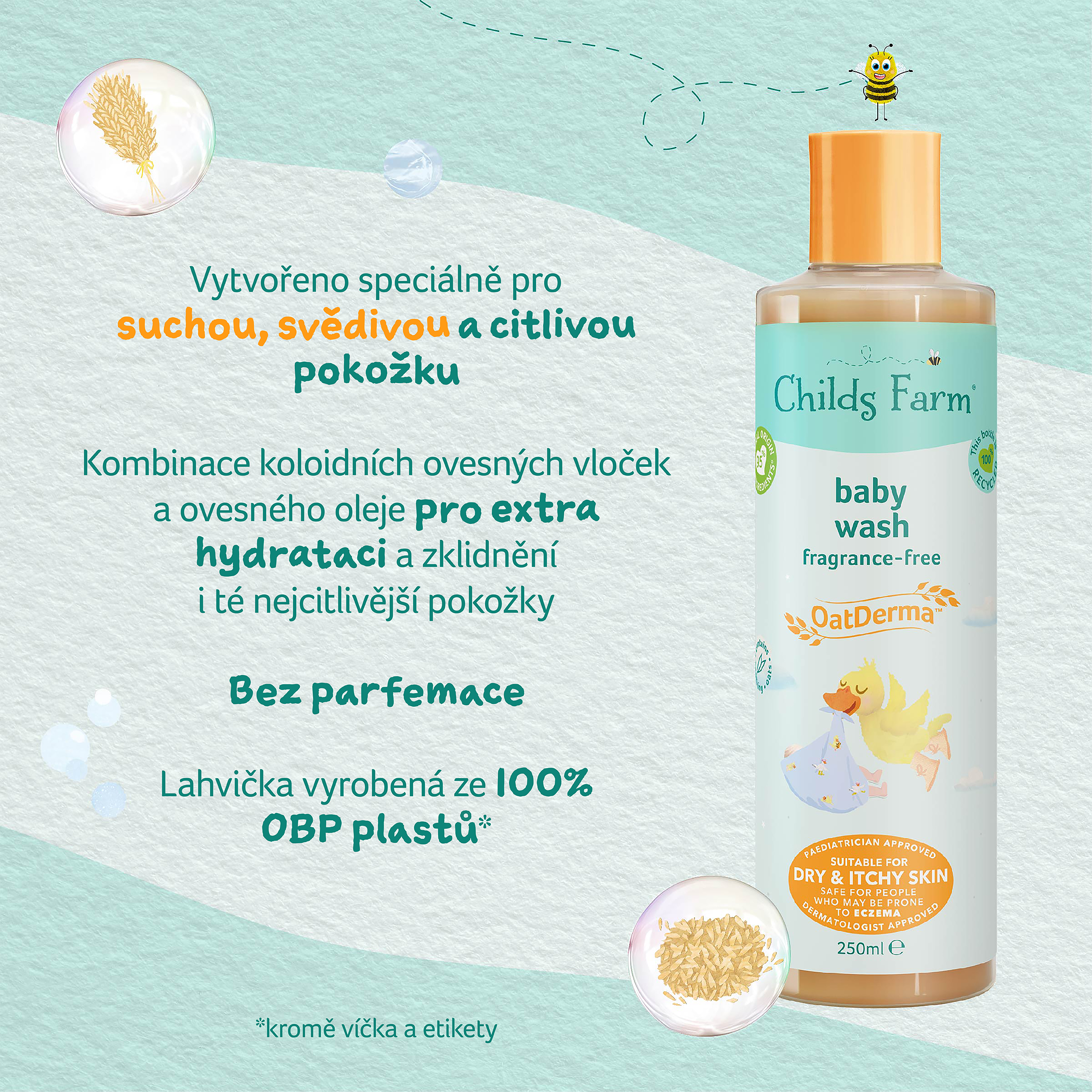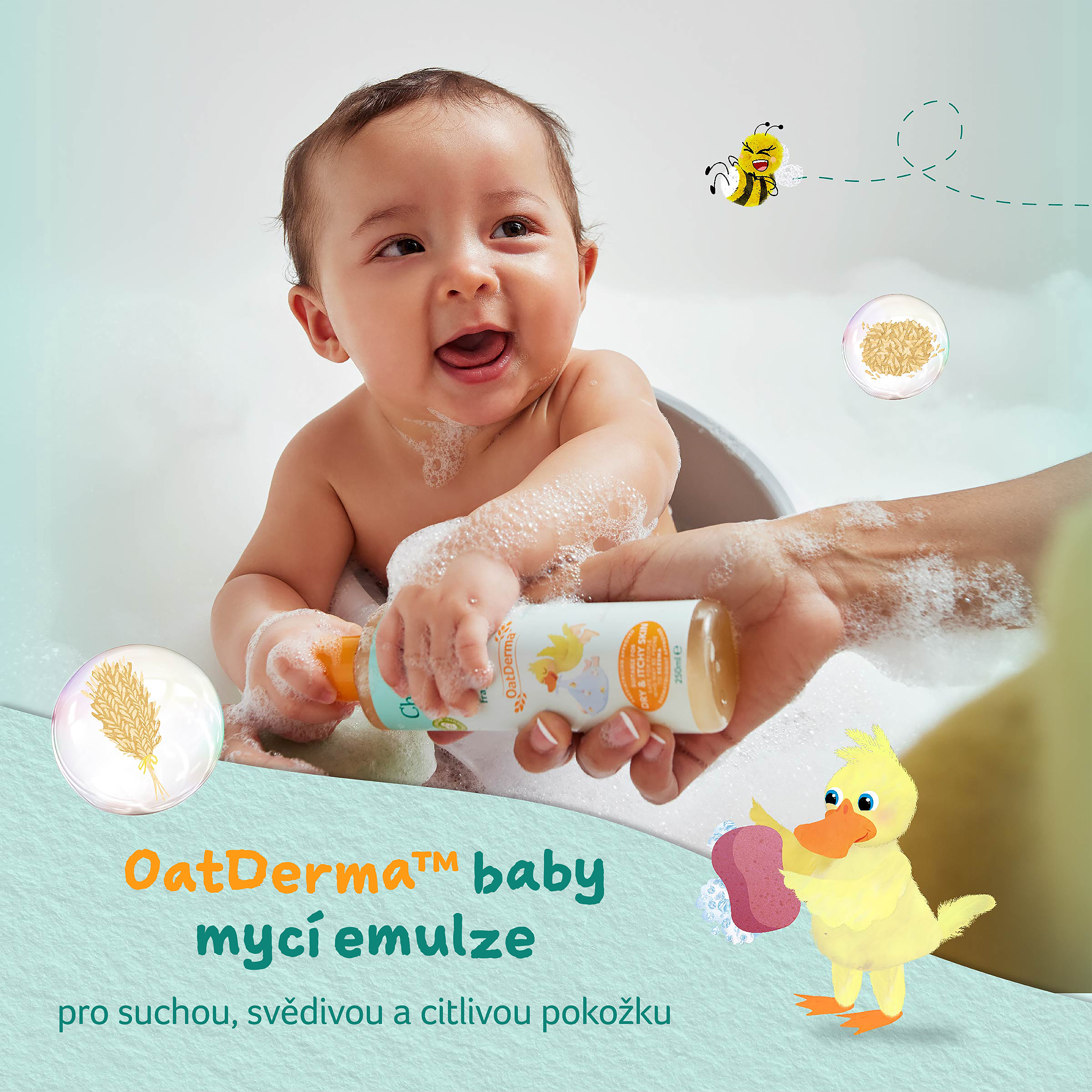 OatDerma™ je řada produktů pro miminka, která byla vytvořena speciálně pro suchou svědivou pokožku a je vhodná i pro pokožku se sklony k ekzému. Produkty obsahují koloidní ovesné vločky bohaté na betaglukany a avenanthramidy, které klinicky prokazatelně zklidňují a jemně vyživují citlivou pokožku a ovesný olej bohatý na ceramidy, které pokožce napomáhají se vstřebáním a udržováním vlhkosti. Produkty jsou bez parfemace, jsou schválené dermatology i pediatry a nesou označení vegan a cruelty free. Mycí emulze jemně pění a snadno s ní tak omyjete pokožku miminka, bez toho aniž by ji vysušovala a narušovala její ochrannou bariéru. Po koupeli je důležité vlhkost uzamknout v pokožce, proto vyzkoušejte i Tělové mléko z řady OatDerma™.