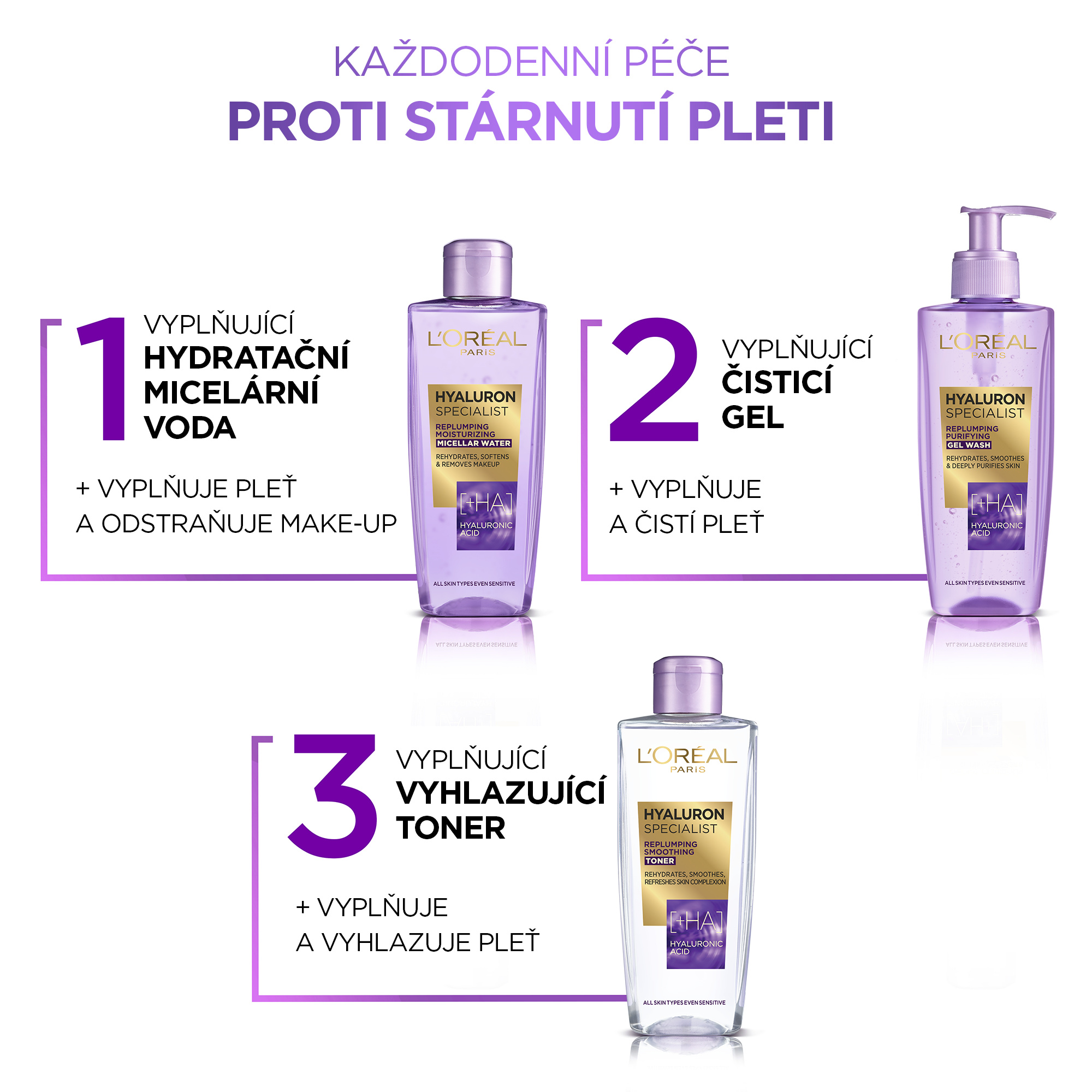 Čistící gel s kyselinou hyaluronovou, které pleť nejen vyčistí, ale také vyplní. Kyselina hyaluronová pomáhá vyplnit, vyhladit a intenzivně hydratovat pleť.