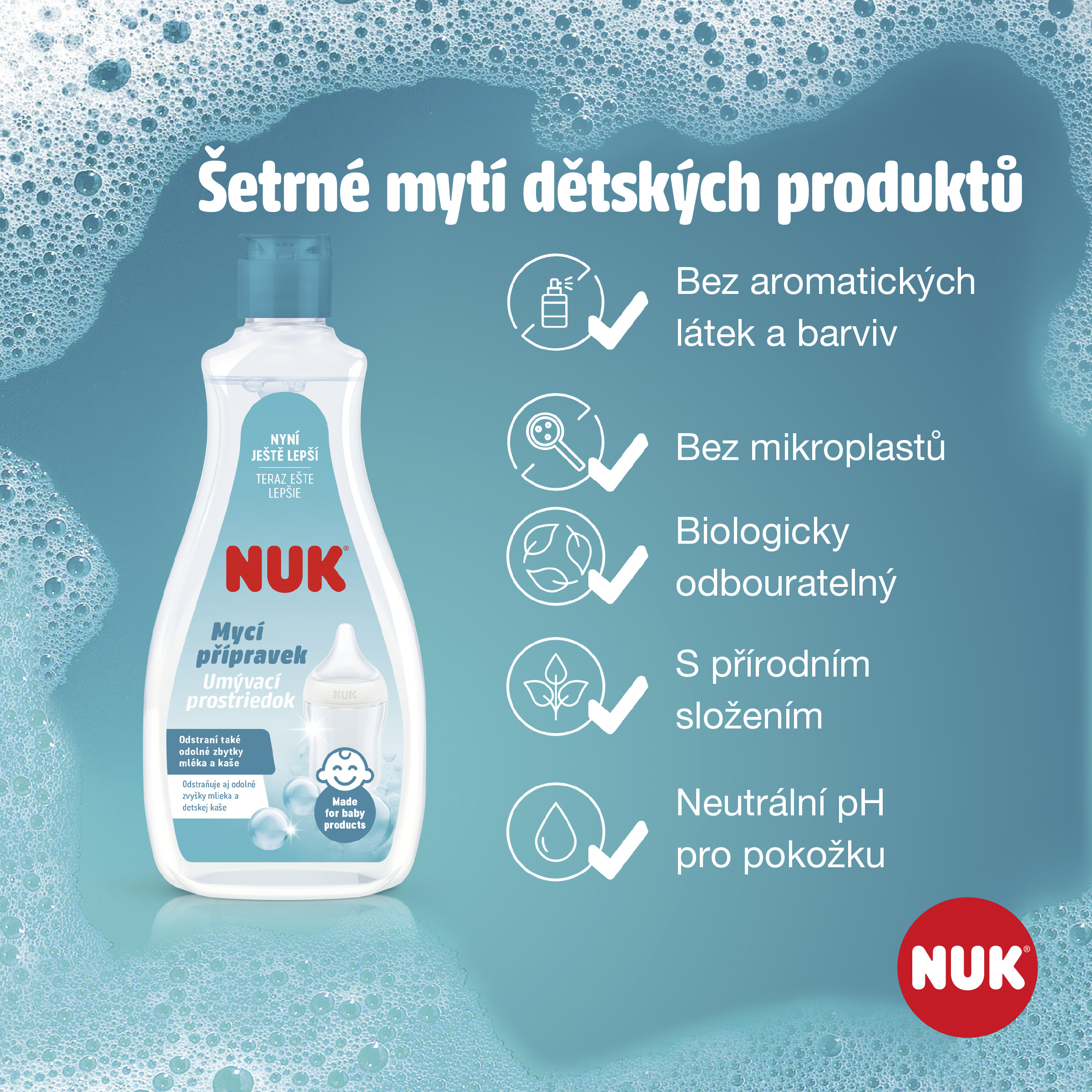 Jak mycí prostředek na láhve a savičky funguje? V prvních měsících života miminka je jeho hlavním jídlem především mléko a kaše. Po krmení zůstávají na kojeneckém nádobí zbytky a mohou se tam hromadit bakterie a vznikat zápach. Abychom tyto zbytky šetrně odstranili, vyvinuli jsme mycí prostředek na láhve a savičky NUK. Veškeré složky, které nejsou pro mytí nezbytné, byly vynechány. Místo toho mycí prostředek na láhve a savičky NUK obsahuje enzymy, které jsou obzvláště účinné při odstraňování zbytků mléka a kaší.