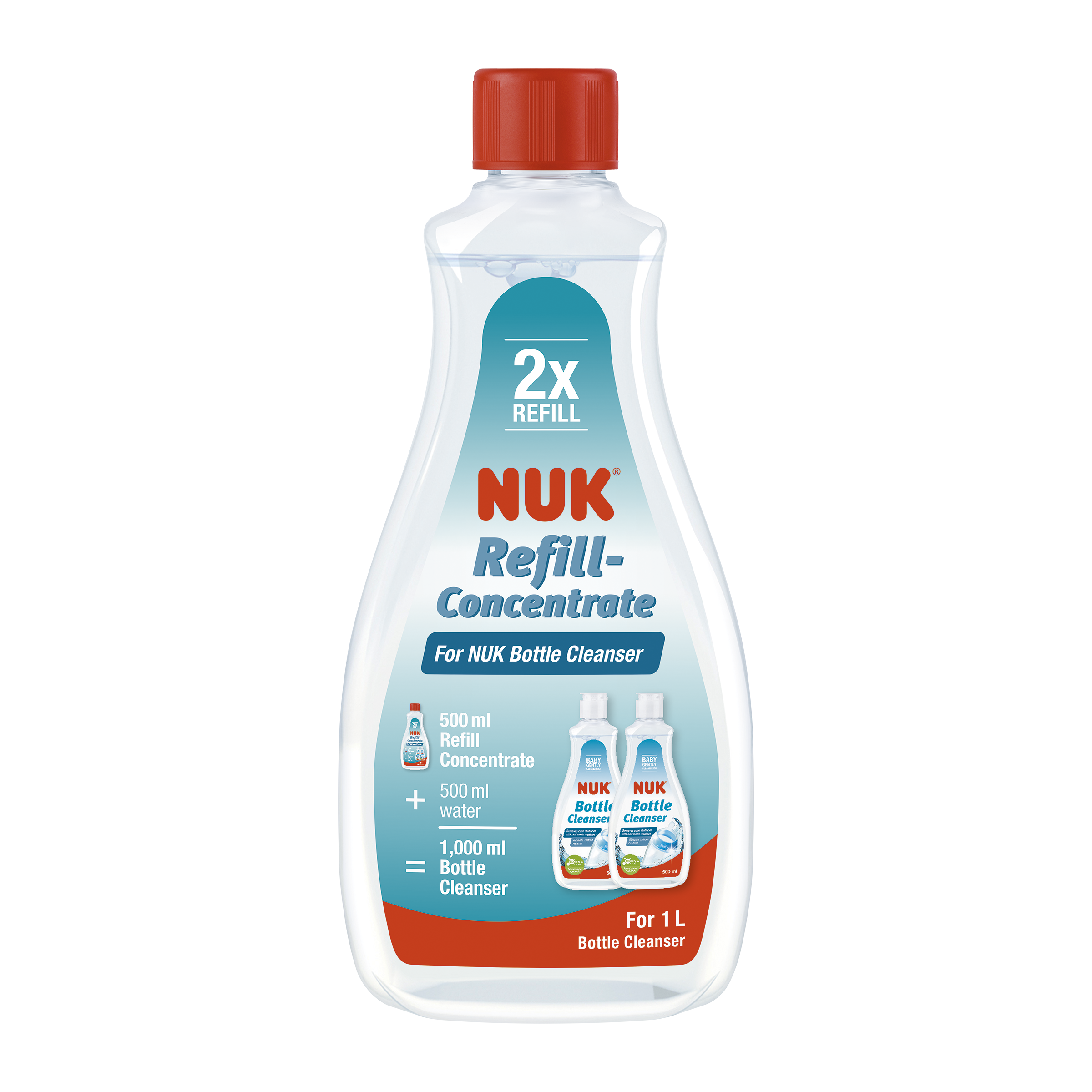 NUK koncentrovaná náhradní náplň pro mycí prostředek na lahve a savičky NUK (500 ml koncentrátu náhradní náplně s 500 ml vody vytvoří 1000 ml mycího prostředku na lahve a savičky NUK). Pro šetrné a bezpečné mytí kojeneckých lahviček a saviček, nyní ještě efektivnější. Díky síle enzymů mycí prostředek spolehlivě odstraňuje zbytky mléka, kojenecké výživy, kaše a džusu. Složení založeno na přírodní bázi, biologicky odbouratelné, bez parfemace a barviv. Beze zbytku se opláchne, pH neutrální, dermatologicky testovánoKoncentrovaná náhradní náplň NUK pro mycí prostředek na lahve a savičky NUK: odstraňuje i odolné zbytky mléka a pyré a nezanechává žádné stopy. S koncentrovanou náhradní náplní NUK lze mycí prostředek na lahve a savičky NUK velmi snadno doplnit. 250 ml koncentrátu smíchaného s 250 ml vody vytvoří 500 ml mycího prostředku pro naplnění celé láhve. Množství koncentrátu je tedy dostatečné pro dvě doplnění. Složení přípravku je založeno na přírodních složkách a obsahuje enzymy, které spolehlivě odstraní zbytky mléka, dětské výživy, kaše a džusu. Složení je natolik šetrné, že mytí kojeneckého nádobí, jako jsou lahvičky, savičky, hrnečky, talířky, ale také příslušenství ke kojení a omyvatelné hračky, je pro děti zcela nezávadné. Protože příroda je blízká našim srdcím, láhev koncentrované náhradní náplně NUK je vyrobena ze 100% recyklovaného PET. Pro lepší mytí a méně odpadů.