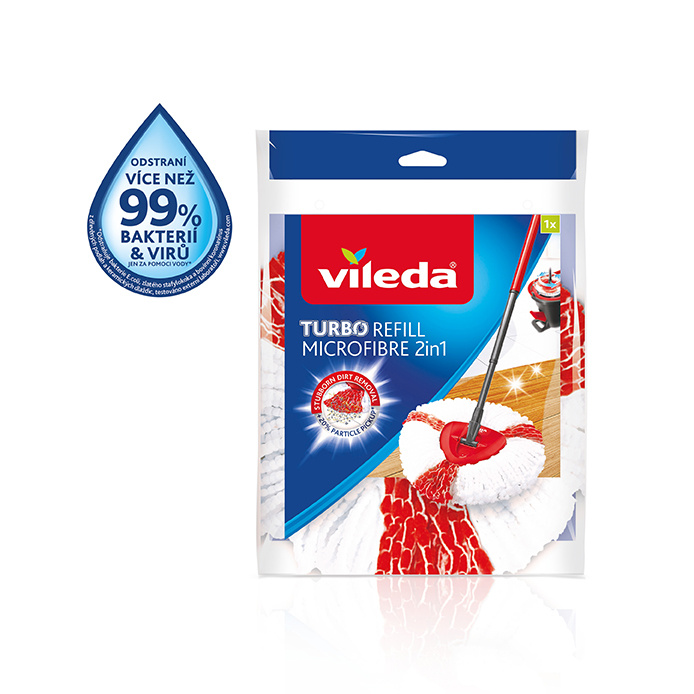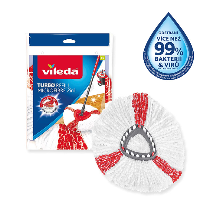 Náhrada k mopům Easy Wring and Clean a TURBO. Jedinečná náhrada, která kombinuje dva druhy třásní. Bílé třásně: 100% Microfibre pro snadný úklid každodenní špíny se skvělou absorpční schopností. Červené třásně vyrobené ze speciálního abrazivního materiálu, který nepoškrábe. Třásně umožňují vyčistit i tu nejodolnější špínu jedním tahem. Trojúhelníkový tvar pro snadný úklid v rozích. Mycí návlek lze prát na 60 °C, nepoužívejte aviváž ani sušičku. Vhodný na všechny typy tvrdých podlah. Snadná výměna náhradní hlavice. V balení 1 ks třásňové náhrady bez plastové hlavice.