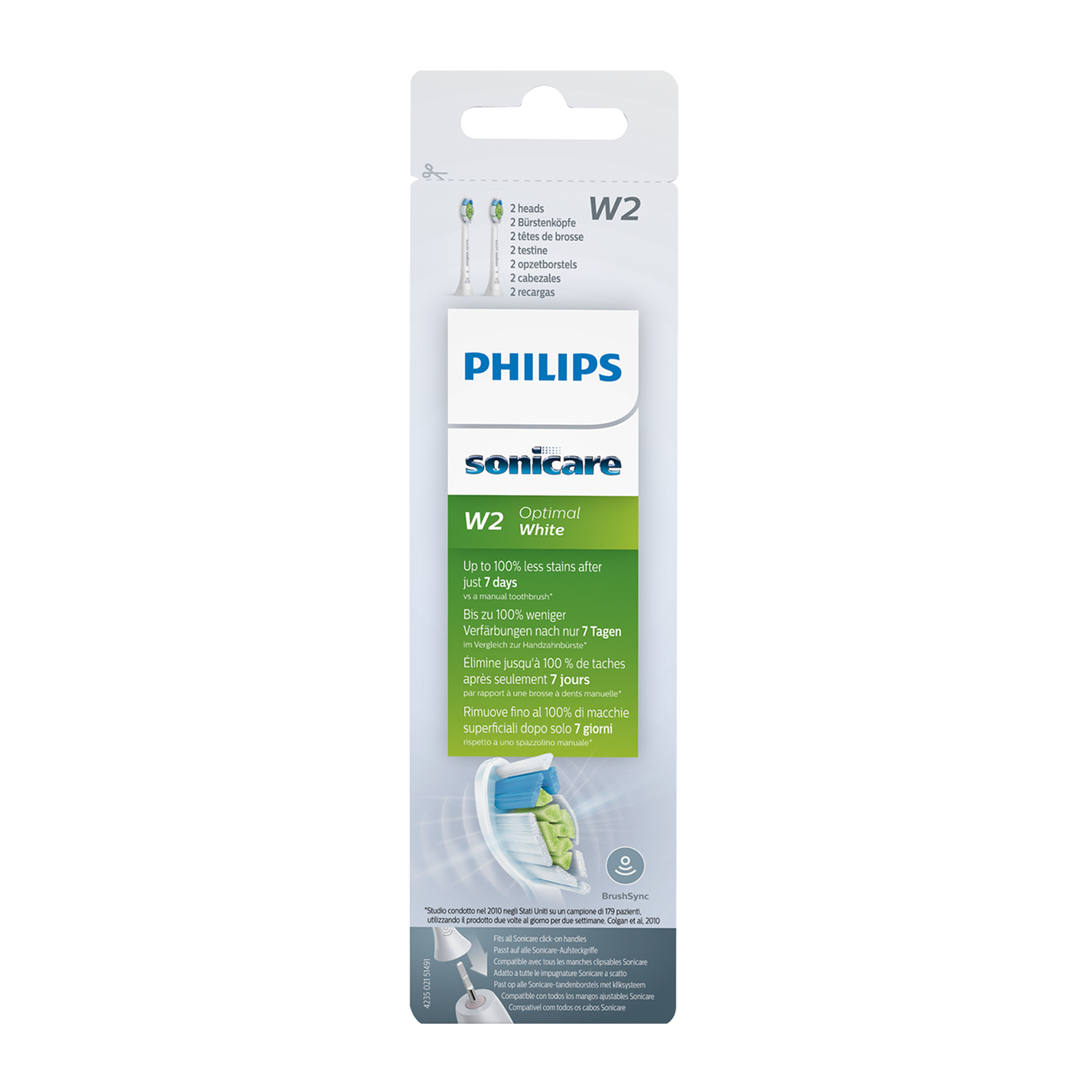 Hlavice Philips Sonicare Optimal White. Standardní velikost hlavice s průřezy vláken ve tvaru diamantového brusu je vyvinuta pro efektivnější odstranění pigmentů z povrchu zubů. Odstraňuje až 7x více plaku než manuální kartáček. Pro optimální výsledky měňte hlavice každé 3 měsíce. Hlavice jsou kompatibilní se všemi modely kartáčku Philips Sonicare 3. generace. Balení obsahuje 2 ks.