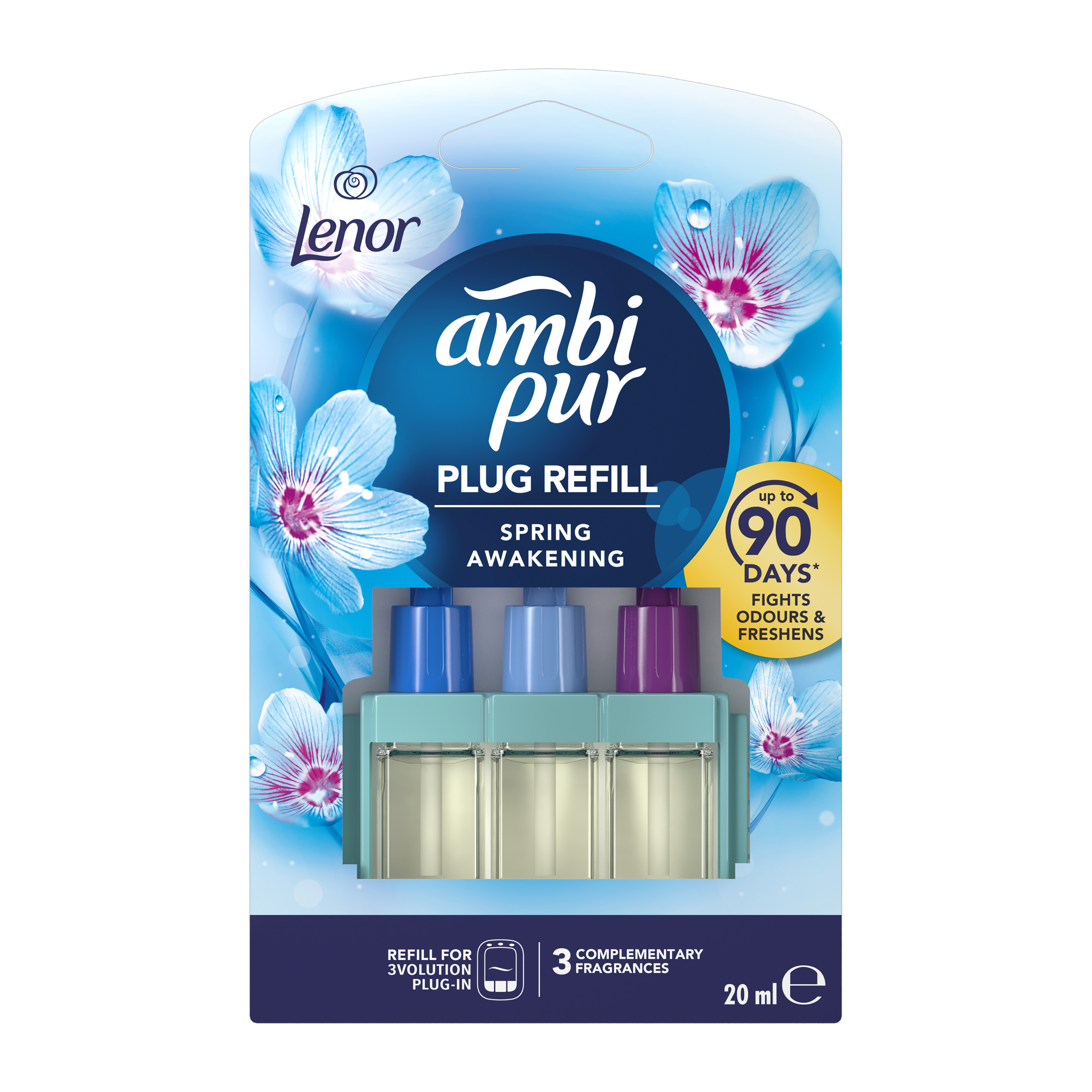 Ambi Pur 3Volution Spring Awakening nepřetržitě odstraňuje pachy a střídá 3 vzájemně se doplňující vůně pro svěžest, kterou budete vnímat. Vydrží až 90 dnů (při používání 12 hodin denně s nastavením nejnižší úrovně odpařování). Objevte krásu Spring Awakening s intenzivnější vůní s větším dosahem, která naplní místnost vůní. Spring Awakening je lehká vůně zeleně inspirovaná jarní přirozenou svěžestí Lenoru. Vnímejte klid, který vás obklopí, když se vzduch naplní touto čistou a decentní vůní. U běžných elektrických osvěžovačů si na vůně rychle zvykneme a přestaneme je vnímat. Ambi Pur Osvěžovač vzduchu 3Volution svěžest obnovuje tím, že se každých 45 minut automaticky střídají 3 vzájemně se doplňující, vysoce kvalitní vůně. Náplně Ambi Pur 3Volution používejte s odpařovacím strojkem 3 Volution, abyste naplnili váš domov svěžestí a vůní, kterou budete vnímat den co den, týden co týden. 3Volution také umožňuje nastavit intenzitu odpařování vůně a tak vám pomůže vytvořit požadovanou atmosféru.