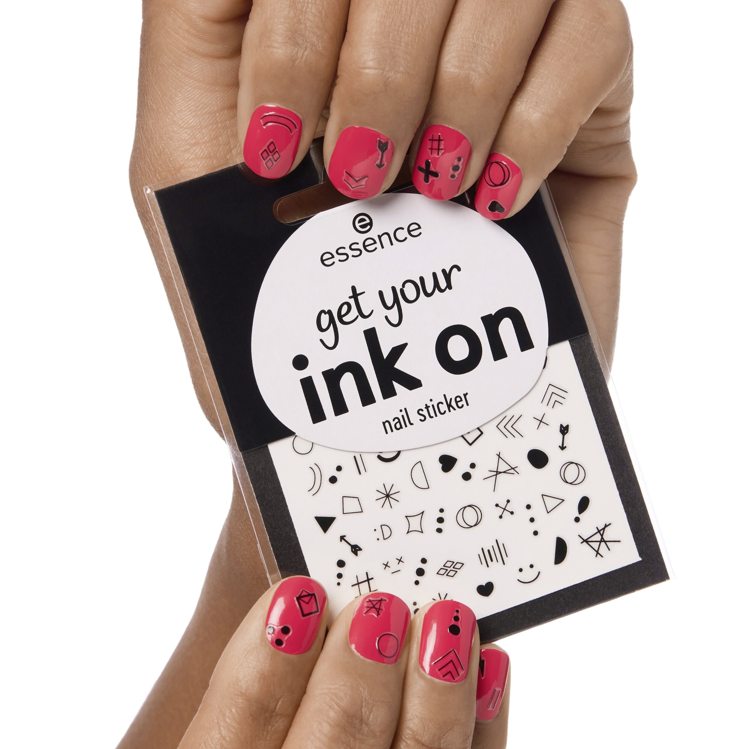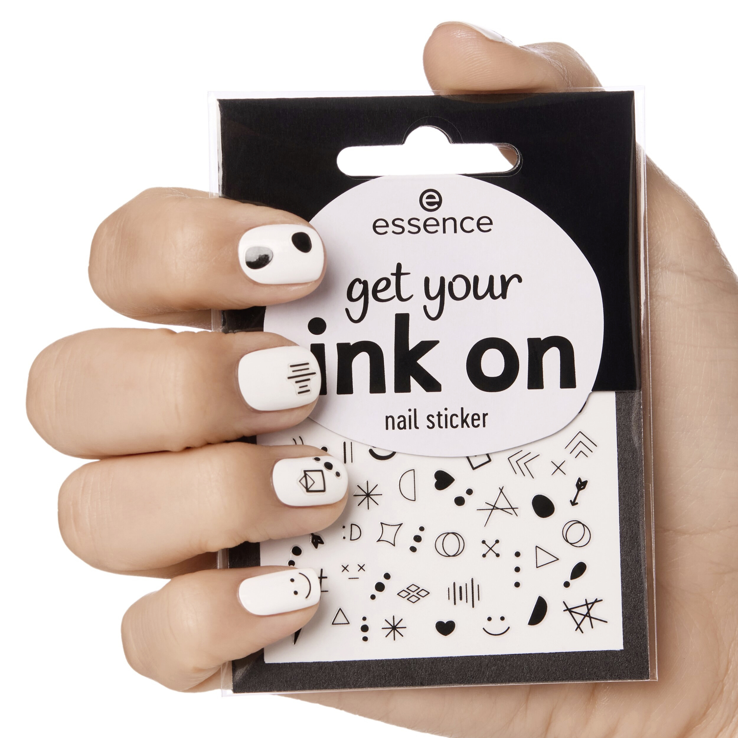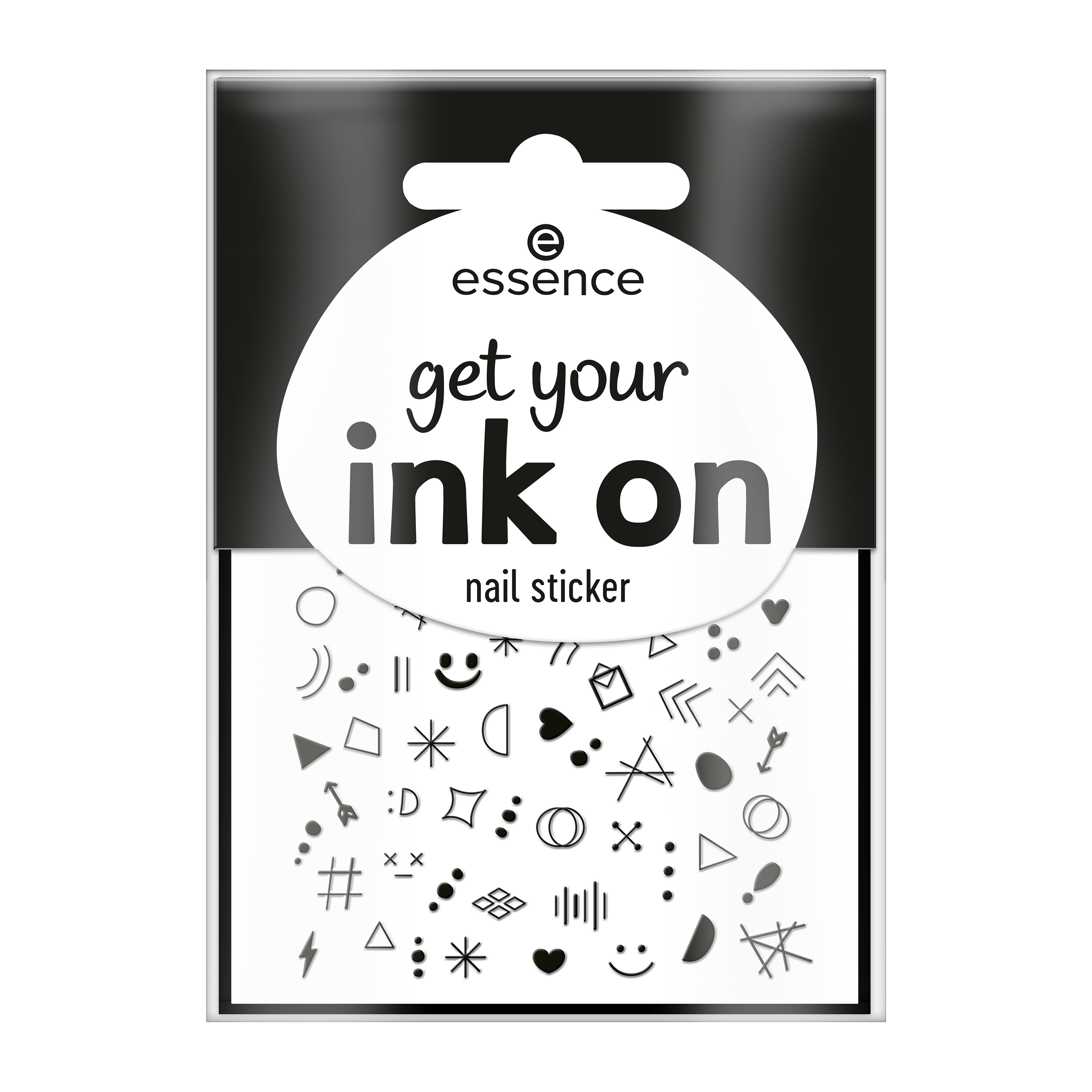 Dodejte svým nehtům tetovaný vzhled s essence nálepkami na na nehty get your ink on. Černé monochromatické nálepky mají různé motivy, jako jsou roztomilé a zábavné prvky, geometrické tvary, výrazné šipky a univerzální tečky.