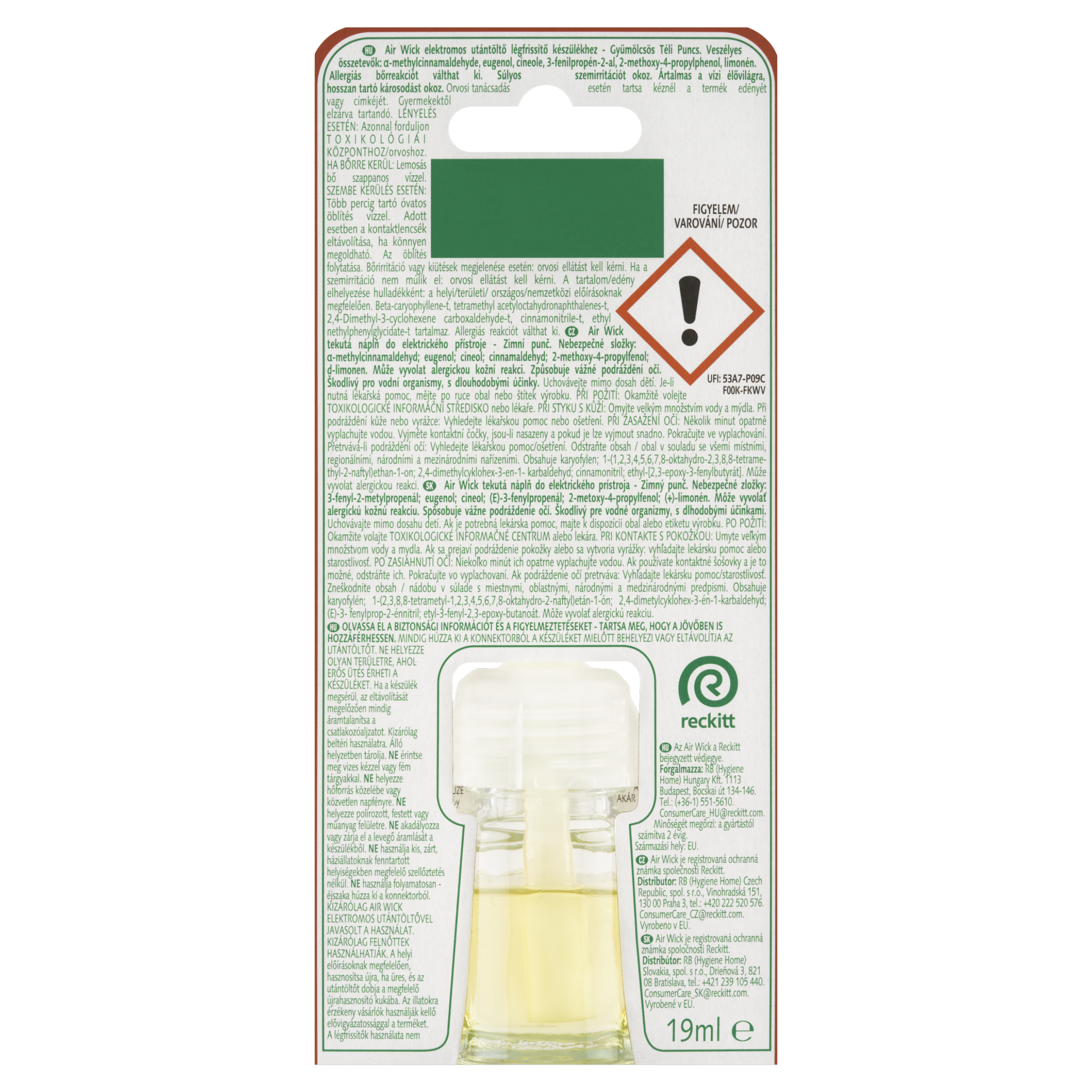VAROVÁNÍ Air Wick tekutá náplň do elektrického přístroje - Zimní punč. Nebezpečné složky: α-methylcinnamaldehyd; eugenol; cineol; cinnamaldehyd; 2-methoxy-4-propylfenol; d-limonen. Může vyvolat alergickou kožní reakci. Způsobuje vážné podráždění očí. Škodlivý pro vodní organismy, s dlouhodobými účinky. Uchovávejte mimo dosah dětí. Je-li nutná lékařská pomoc, mějte po ruce obal nebo štítek výrobku. PŘI POŽITÍ: Okamžitě volejte TOXIKOLOGICKÉ INFORMAČNÍ STŘEDISKO nebo lékaře. PŘI STYKU S KŮŽÍ: Omyjte velkým množstvím vody a mýdla. Při podráždění kůže nebo vyrážce: Vyhledejte lékařskou pomoc nebo ošetření. PŘI ZASAŽENÍ OČÍ: Několik minut opatrně vyplachujte vodou. Vyjměte kontaktní čočky, jsou-li nasazeny a pokud je lze vyjmout snadno. Pokračujte ve vyplachování. Přetrvává-li podráždění očí: Vyhledejte lékařskou pomoc/ošetření. Obsahuje karyofylen; 1-(1,2,3,4,5,6,7,8-oktahydro-2,3,8,8-tetramethyl-2-naftyl)ethan-1-on; 2,4-dimethylcyklohex-3-en-1-karbaldehyd; cinnamonitril; ethyl-[2,3-epoxy-3-fenylbutyrát]. Může vyvolat alergickou reakci. PŘEČTĚTE SI TEXT O BEZPEČNÉM POUŽITÍ A UCHOVEJTE SI JEJ PRO POZDĚJŠÍ POUŽITÍ. PŘED ODSTRANĚNÍM NEBO VLOŽENÍM NÁHRADNÍ NÁPLNĚ OSVĚŽOVAČ VŽDY VYJMĚTE Z ELEKTRICKÉ ZÁSUVKY. VYVARUJTE SE TVRDÝCH ÚDERŮ. Pokud dojde k poškození jednotky, vypněte ji a vyjměte ze zásuvky. Pouze pro vnitřní použití. Udržujte ve vzpřímené poloze. NEPOUŽÍVEJTE mokrýma rukama nebo kovovými předměty, neumisťujte do blízkosti zdroje tepla nebo přímého slunečního záření, nepokládejte na leštěné, lakované nebo plastové povrchy. NEBRAŇTE ani neblokujte proudění vzduchu z jednotky, nepoužívejte v malých uzavřených prostorách pro zvířata bez dostatečného větrání nebo nepoužívejte nepřetržitě - vytáhněte ze zásuvky přes noc. POUŽÍVEJTE POUZE S ELEKTRICKÝM STROJKEM AIR WICK. ZAŘÍZENÍ SMĚJÍ POUŽÍVAT POUZE DOSPĚLÍ. Osoby s přecitlivělostí na vůně by měly tento výrobek používat s opatrností. Osvěžovače vzduchu nemohou nahradit správné hygienické návyky. Používejte v dobře větraném prostoru.