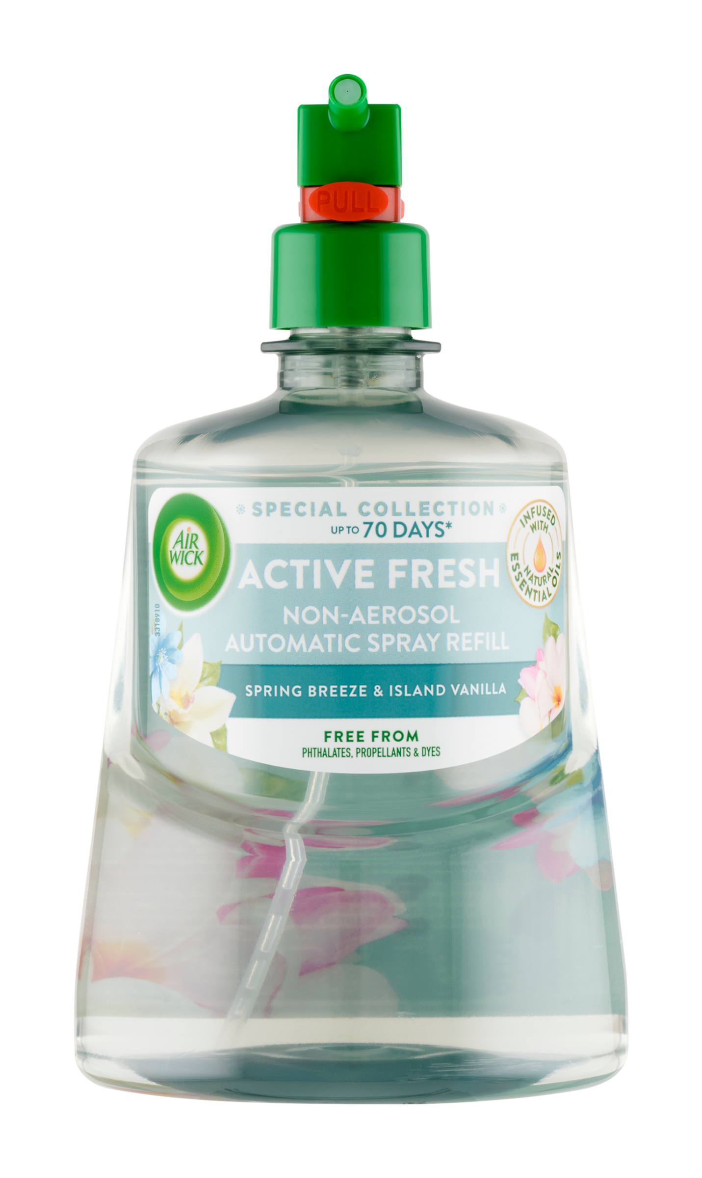 Air Wick Active Fresh Náplň na vodní bázi do automatického difuzéru Spring Breeze & Island Vanilla poskytuje až 70 dní osvěžení (při použití s difuzérem Air Wick a na nejnižší nastavení intenzity vůně). Tato náplň na vodní bázi přináší dokonalou rovnováhu mezi osvěžujícím jarním vánkem a jemnou vanilkou, která provoní váš domov příjemnou a přirozenou vůní po dlouhou dobu.