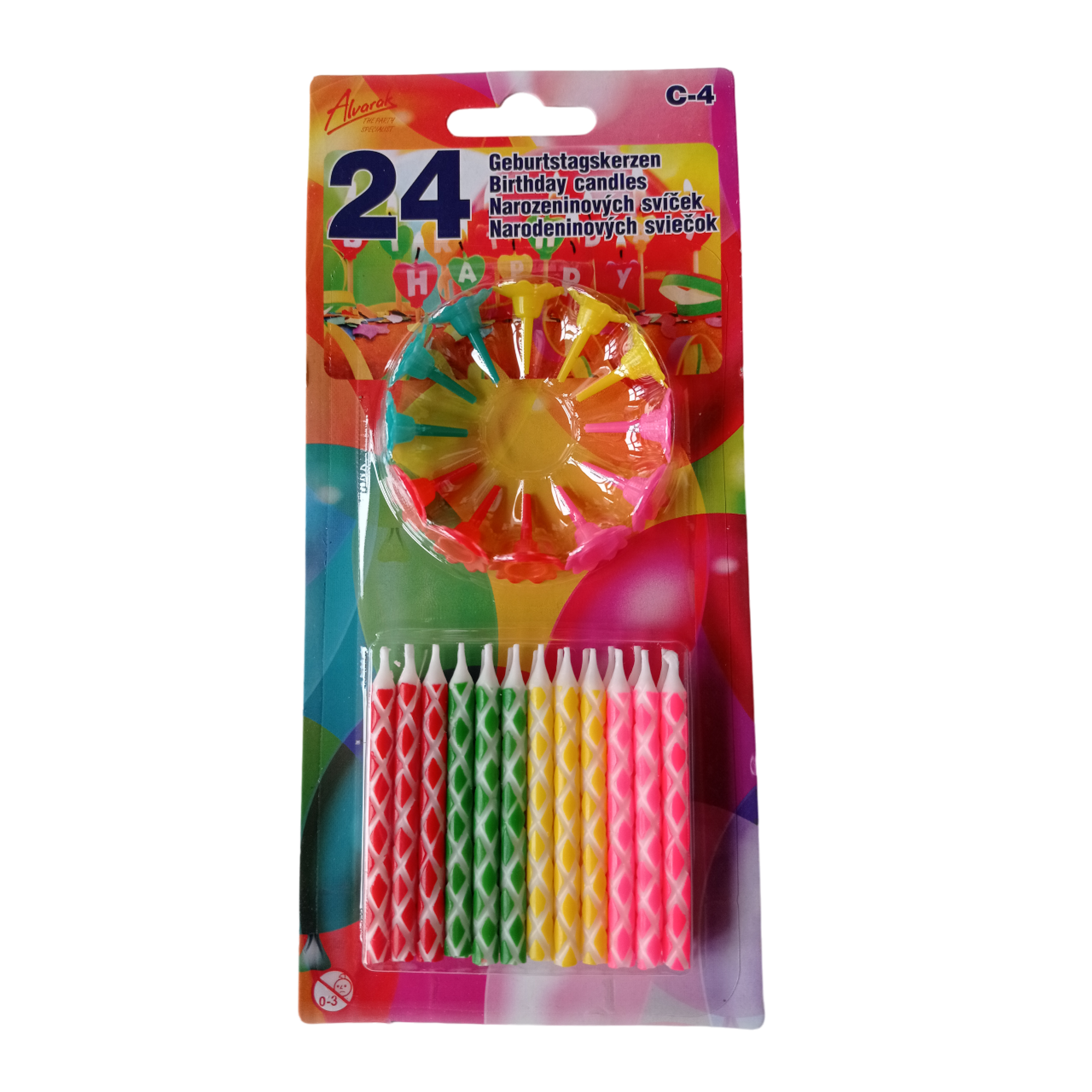 24 narozeninových svíček 6cm vysokých s 12 stojánky.