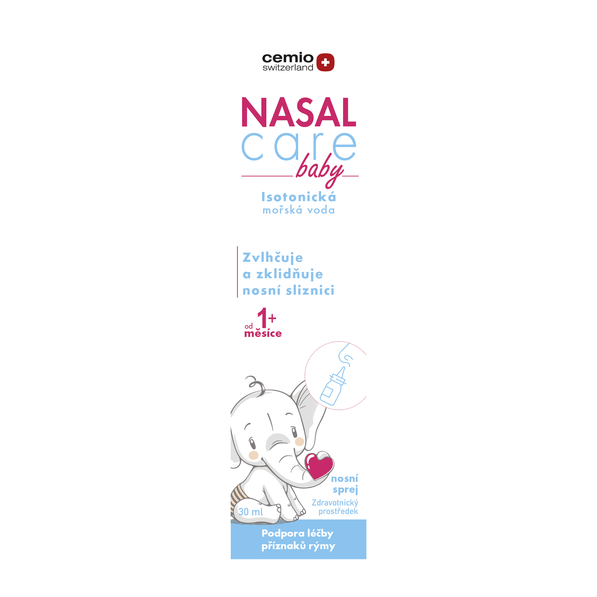 Cemio NASAL care baby je isotonický roztok mořské vody, který zvlhčuje suchou nosní sliznici. Používá se jako podpůrný prostředek při rýmě, senné rýmě, ke zklidnění podrážděné nosní sliznice při stavech infekce a alergie a ke každodenní hygieně a čištění nosu. Tento přípravek je určen pro kojence od 1 měsíce.