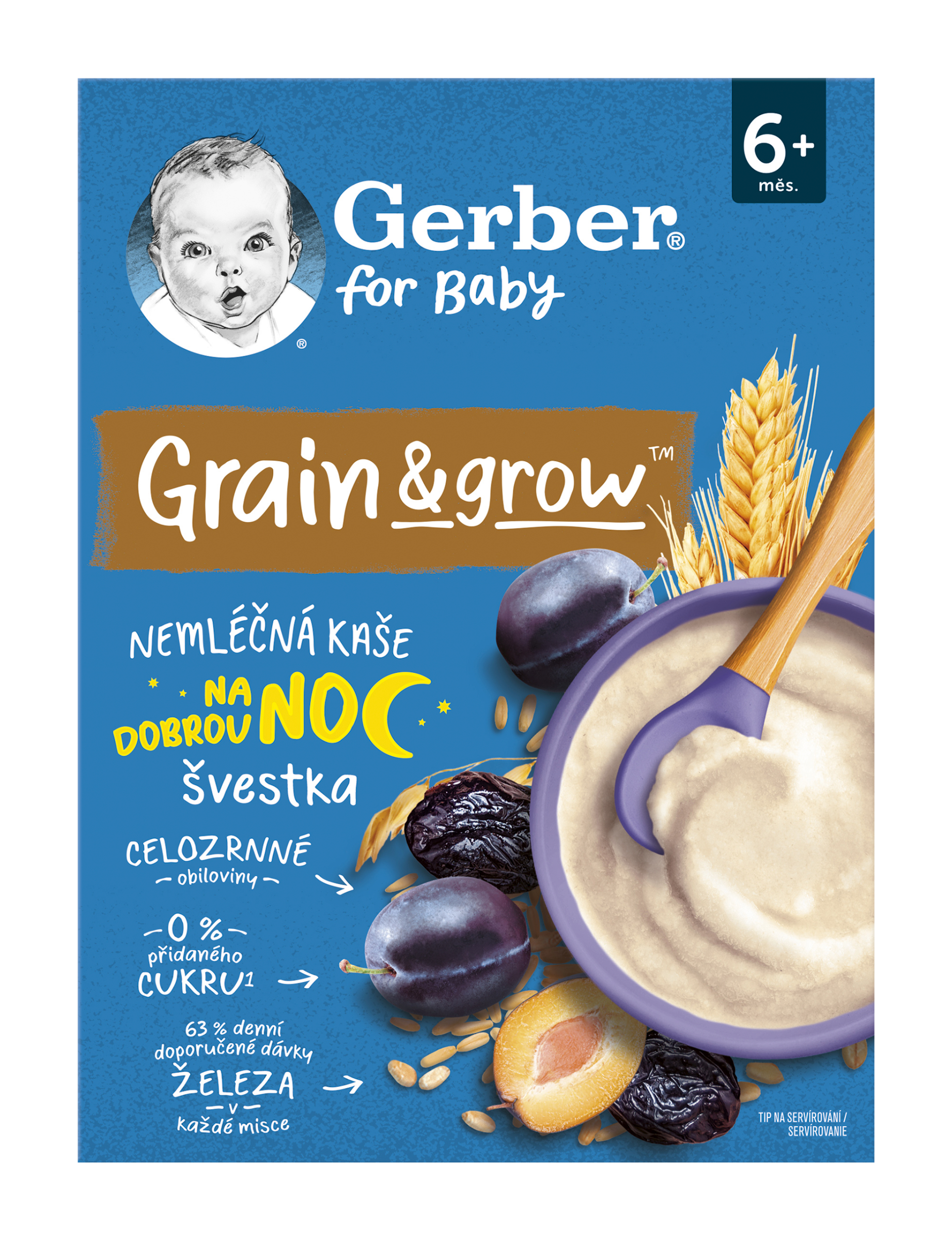 GERBER nemléčná kaše pšenično-ovesná švestka 200 g. Obilný příkrm pro kojence od ukončeného 6. měsíce. Instantní výrobek. GERBER nemléčná kaše švestka je lahodný obilný příkrm pro vaše miminko. Kašička je vyrobena z pečlivě vybraných celozrnných obilovin, pšenice a ovsa. Při výrobě jsme navíc nepřidali žádný cukr*. Kaše je určena pro kojence od ukončeného 6. měsíce. Díky švestkovým vločkám má nemléčná kaše jemnou, lehce nasládlou chuť a potěší tak jazýček každého malého mlsouna. Kaše je pro miminko ideální dobrotou pro usnadnění přechodu na pevnou stravu. Je pomocníkem pro rozvoj žvýkacích a polykacích dovedností a připravuje malé strávníky na širší škálu potravin. Instantní kaše jsou navíc snadné na přípravu, stačí přidat jen mléko.