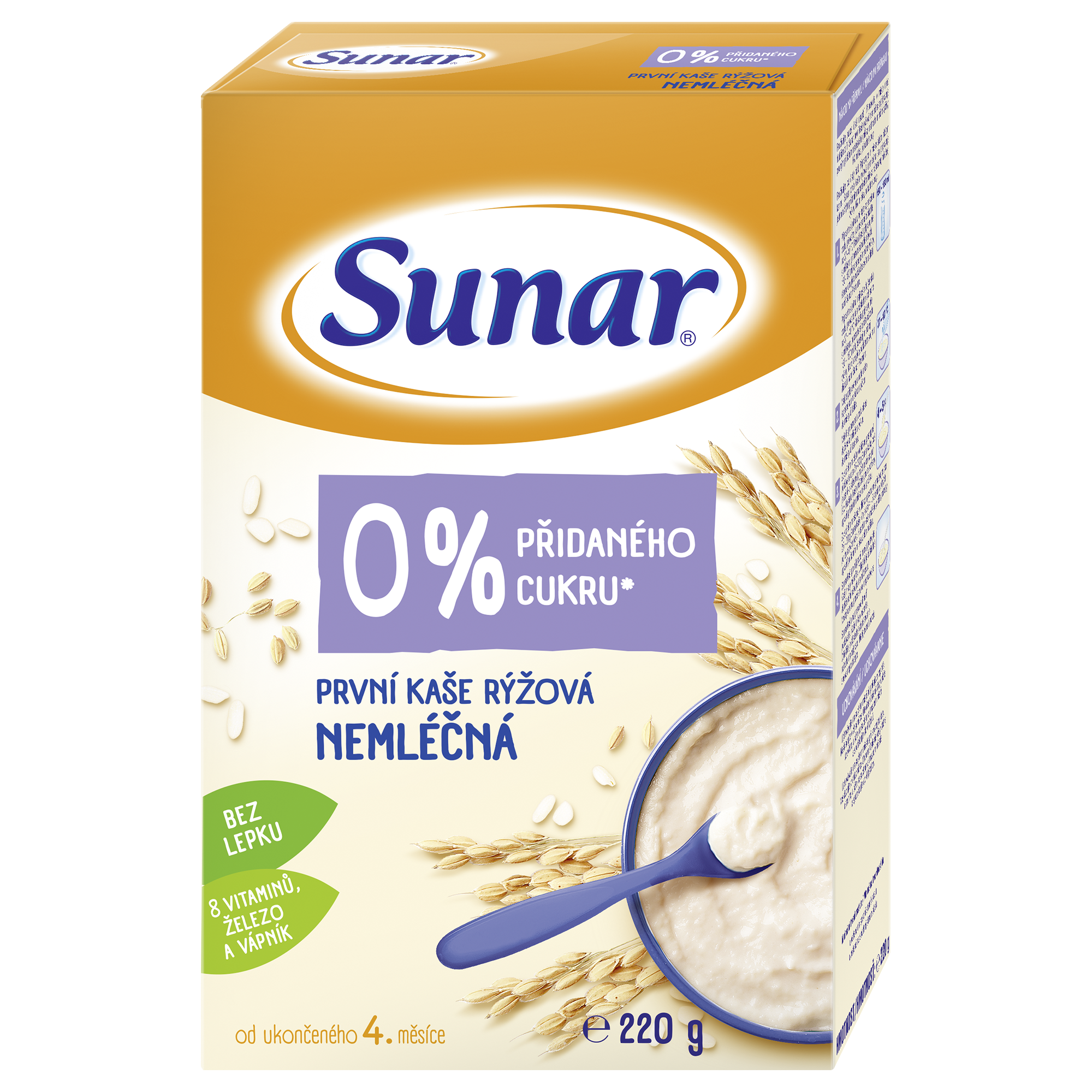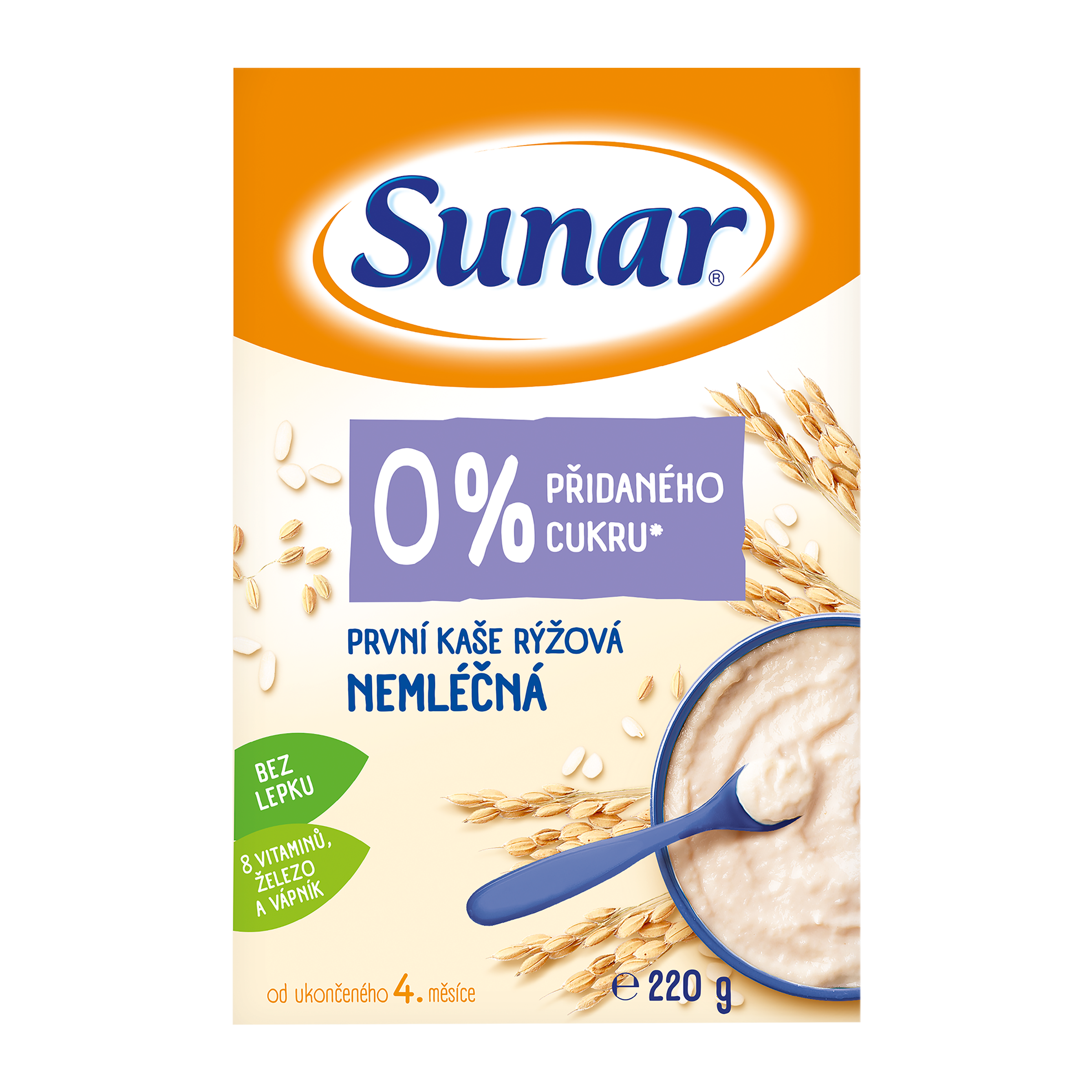 Sunar nemléčná kaše rýžová je vhodná jako první příkrm při zavádění pevné stravy do jídelníčku. Neobsahuje lepek. Složení bez přidaného cukru. Vhodné jako první příkrm při zařazení pevné stravy do jídelníčku dítěte. Jemná chuť a jednoduchá příprava. 8 vitaminů, železo a vápník.