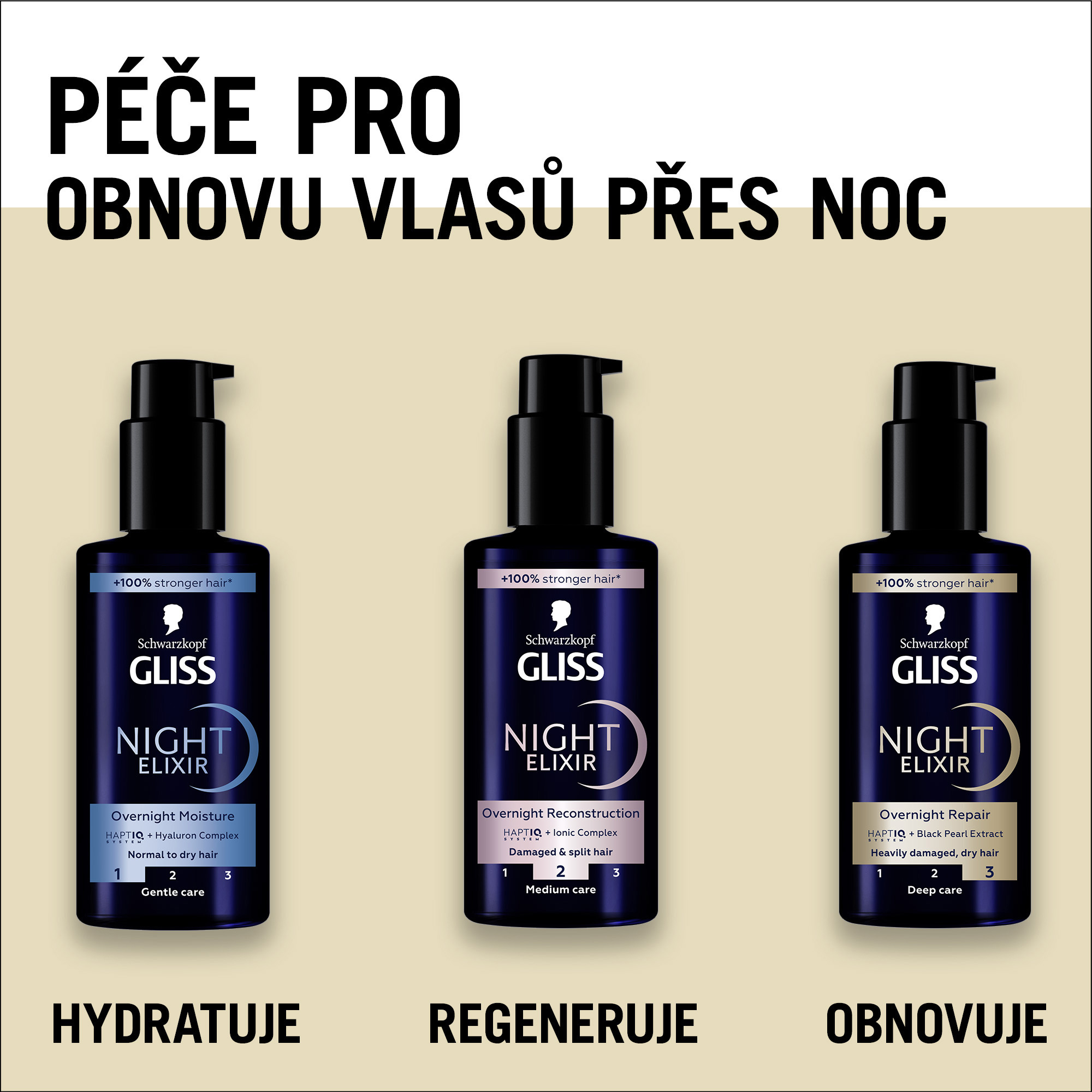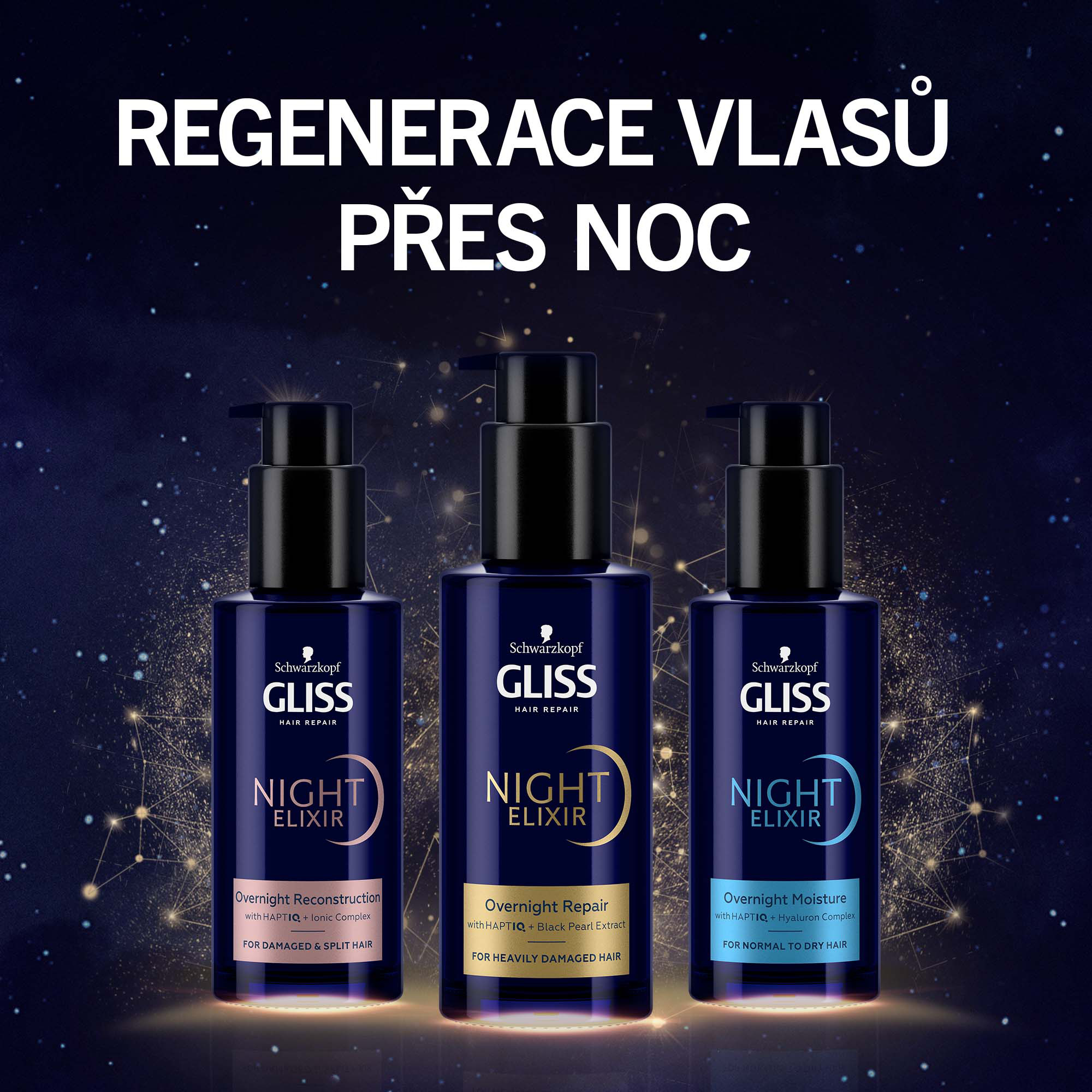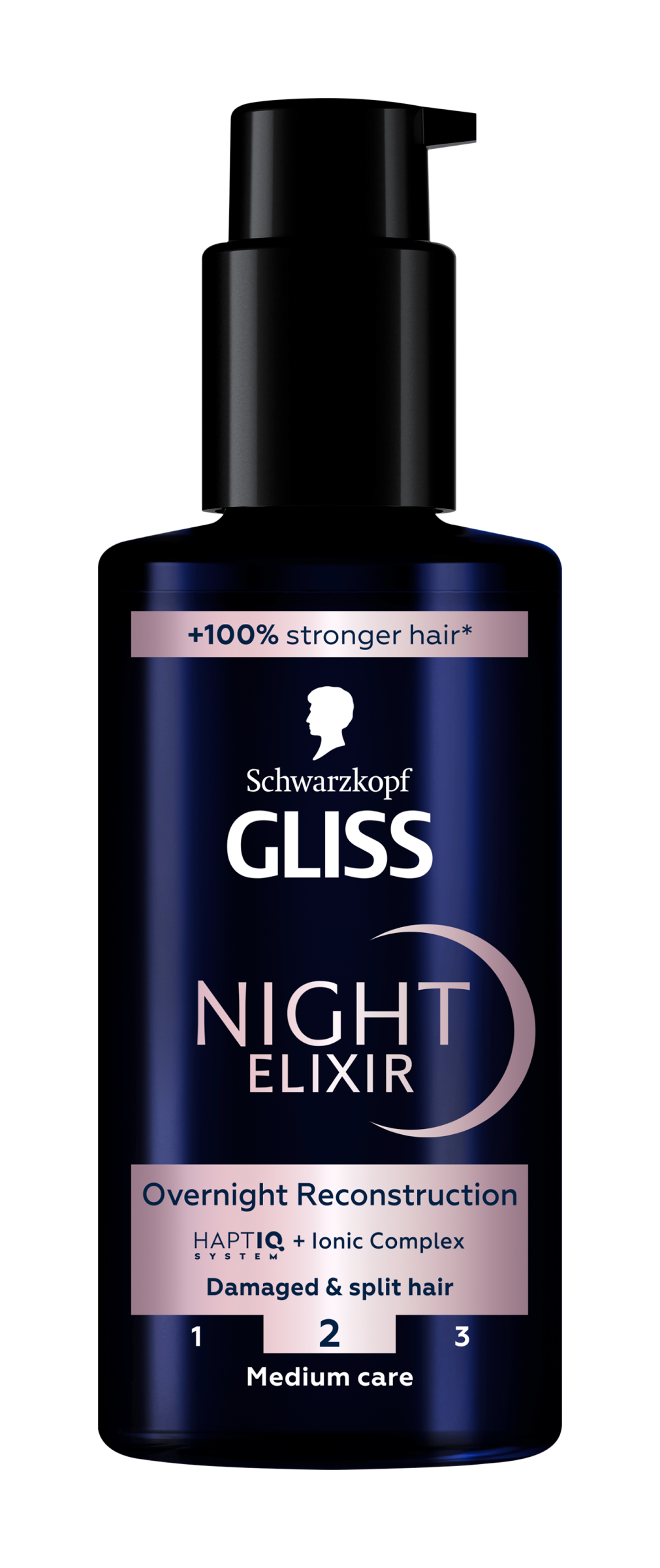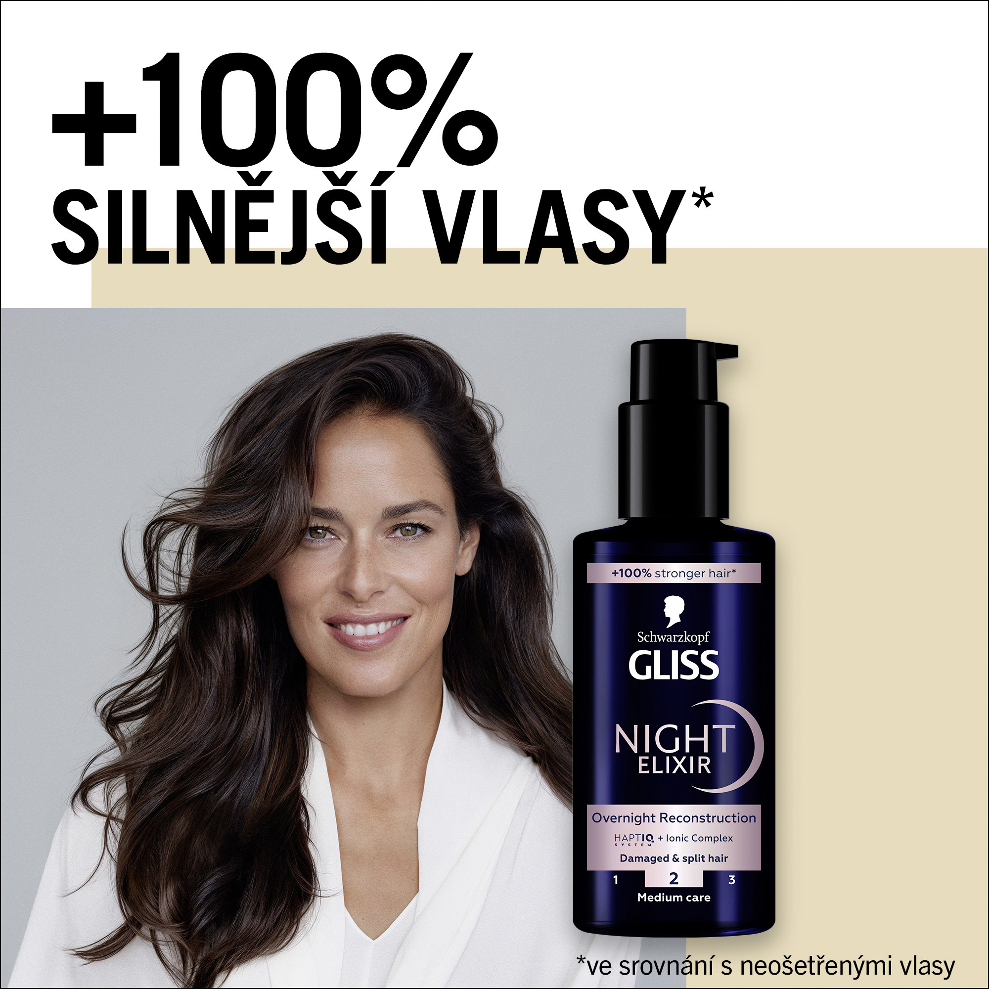 Schwarzkopf Gliss noční elixír Overnight Reconstruction - Transformuje poškozené a roztřepené vlasy přes noc. Tento Gliss noční elixír na vlasy se systémem HAPTIQ rekonstruuje vlasy během spánku a dlouhodobě je regeneruje. Využívá noční dobu k hlubokému pronikání do vlasů a vytváření nových mikrovazeb ve vlasovém vláknu. Ráno jsou vlasy krásné, hebké a pružné. Úroveň péče Gliss: 2 - Střední péče, s vyváženým složením vyživujících ingrediencí. Toto sérum na vlasy Gliss pro poškozené vlasy poskytuje až o 97 % méně roztřepených konečků*. Lehké složení této vlasové péče s relaxační vůní se okamžitě vstřebá do vlasů a nezanechává na polštáři žádné stopy. Gliss vlasové produkty jsou certifikovány organizací PETA**. Ingredience tohoto elixíru jsou z 92 % přírodního původu***.