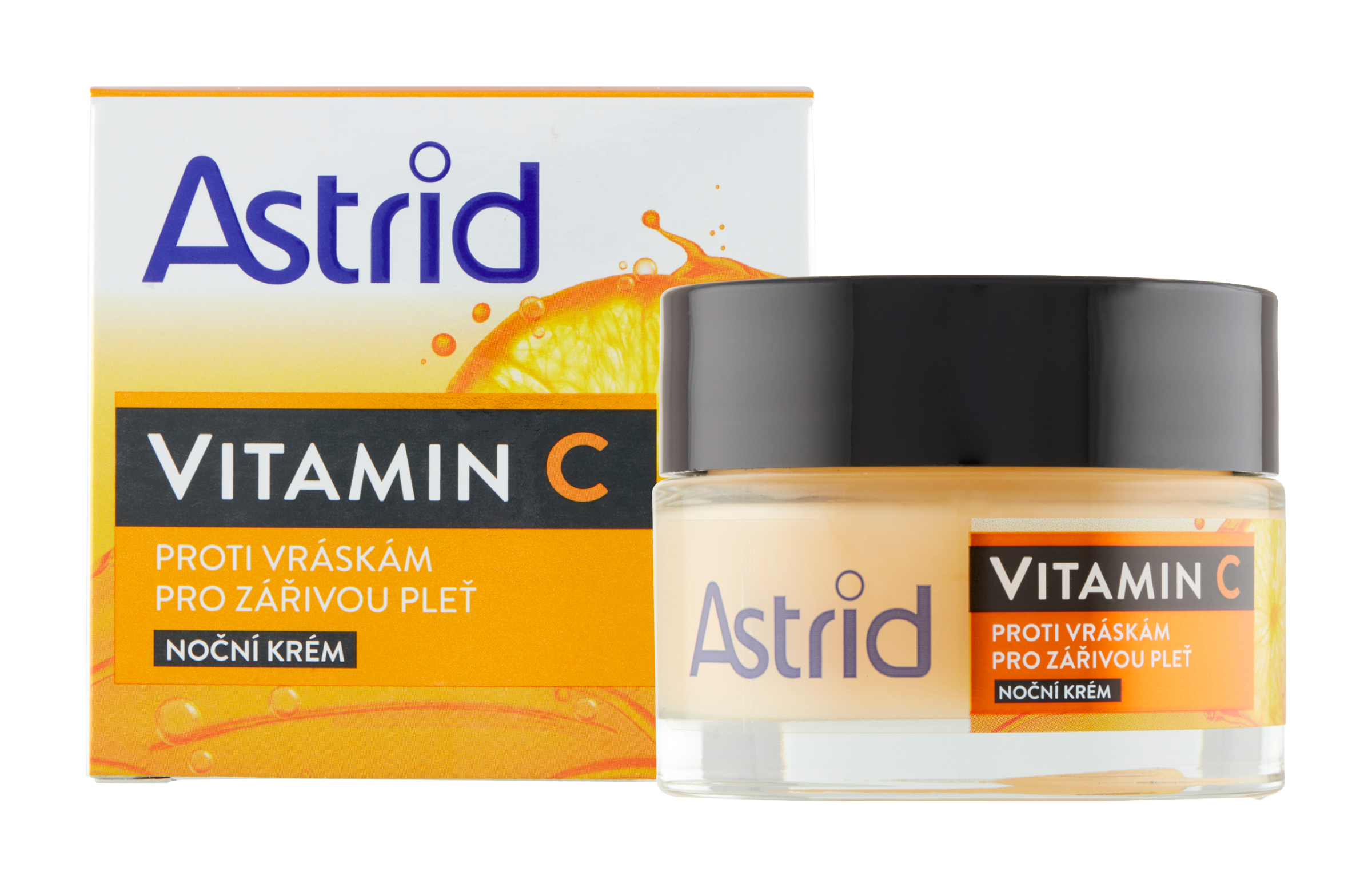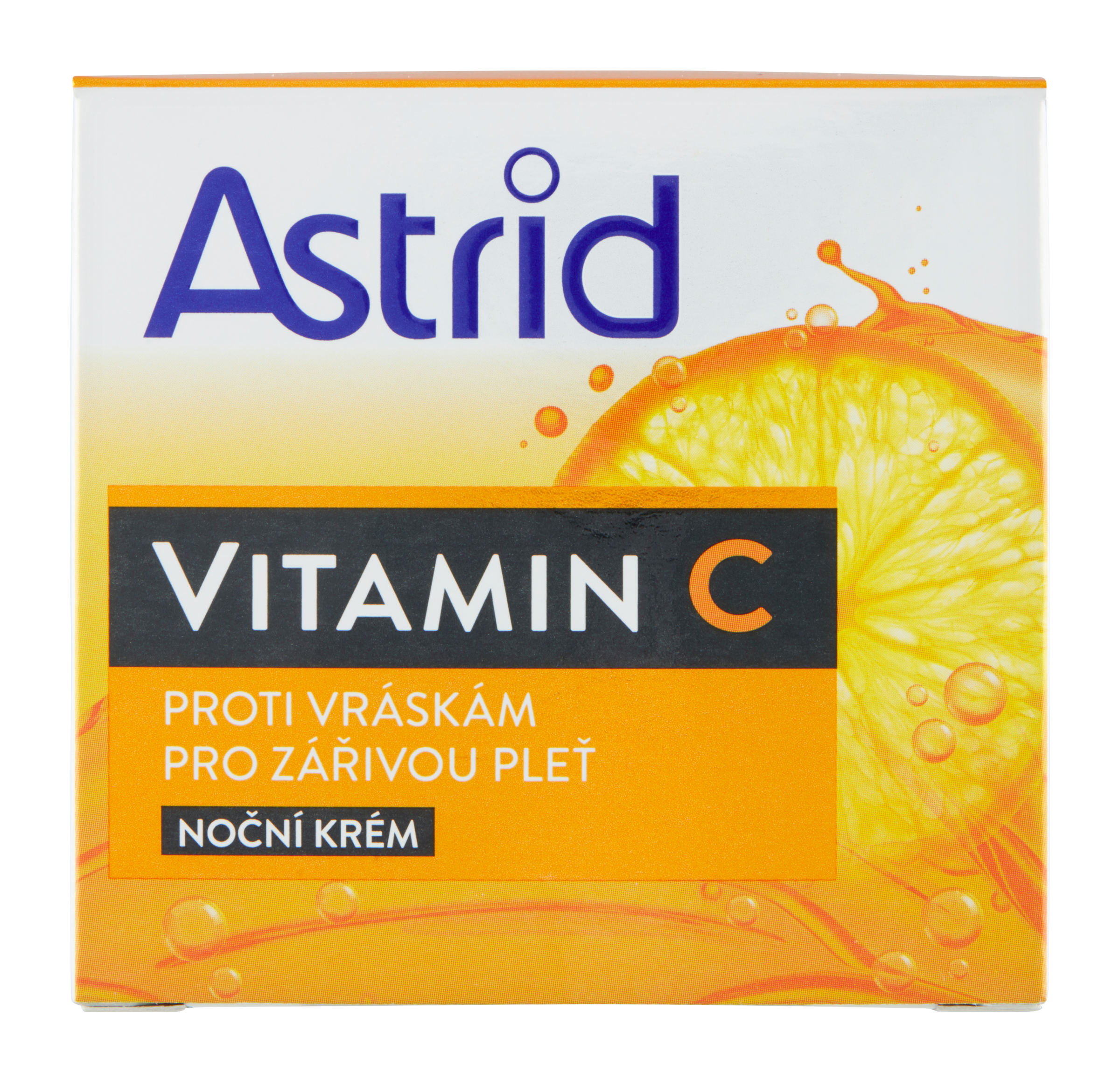 Noční krém Astrid Vitamin C, bohatý na vitamin C, který je známý svými antioxidačními účinky na pleť, posiluje produkci kolagenu a zvyšuje rovnoměrný tón a jas pleti.