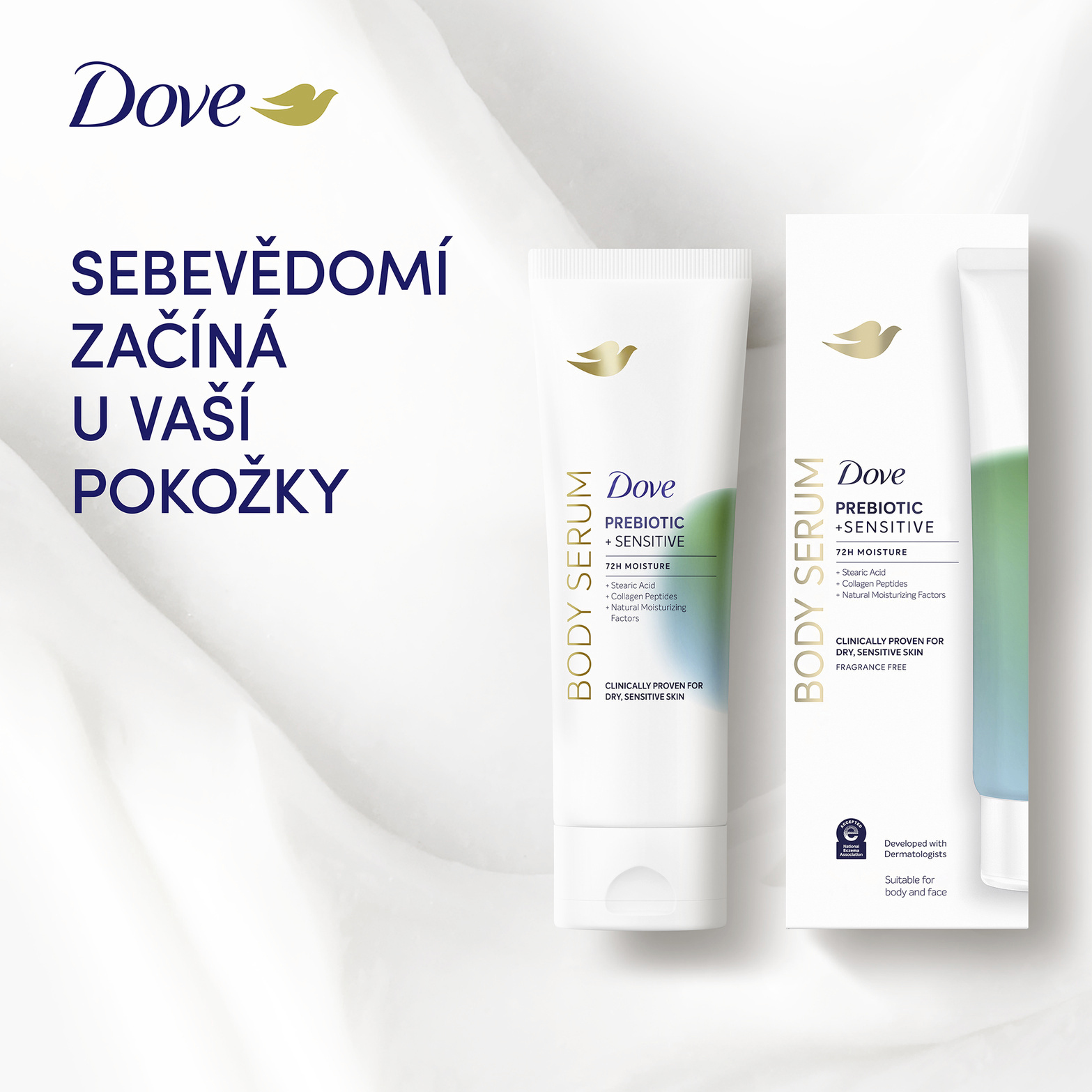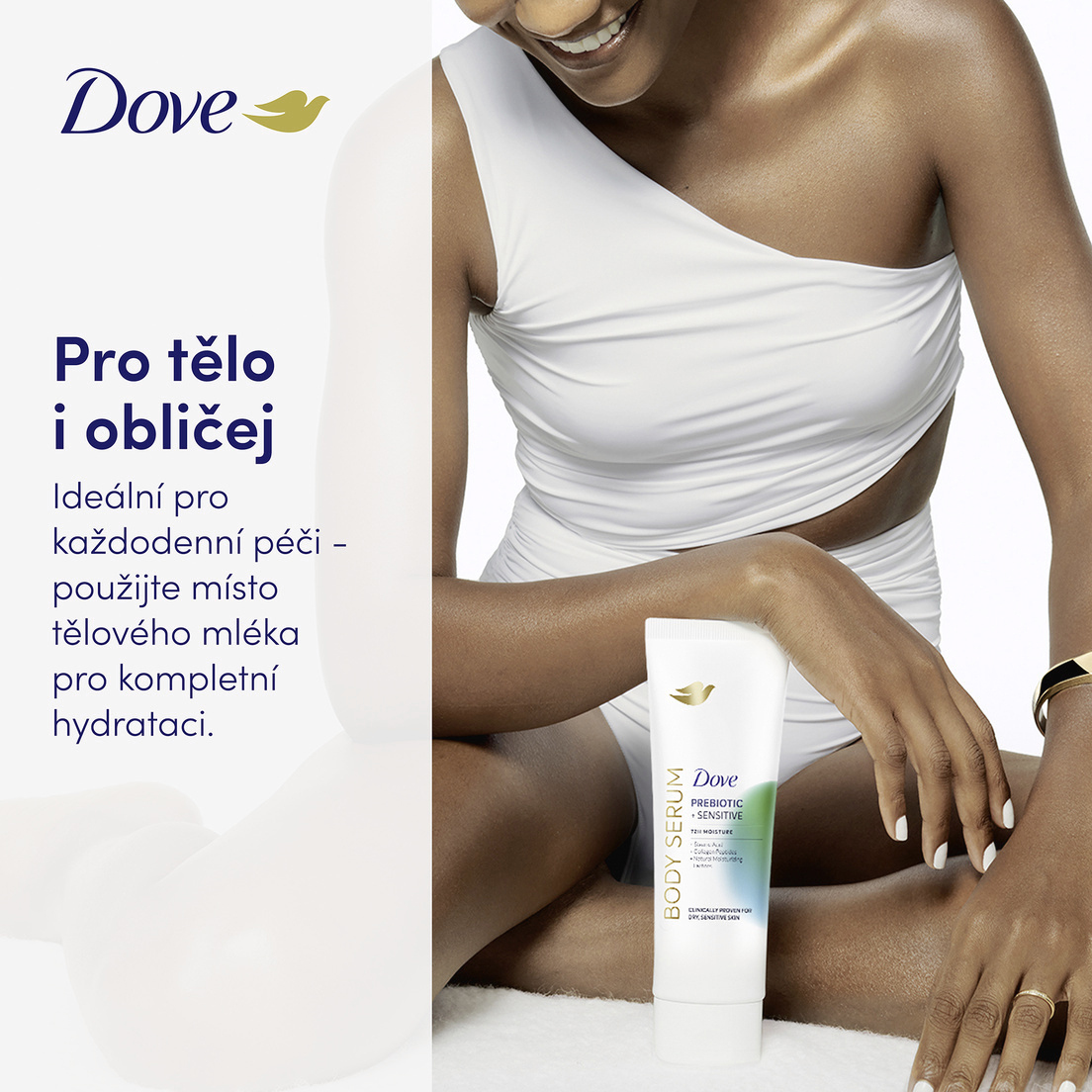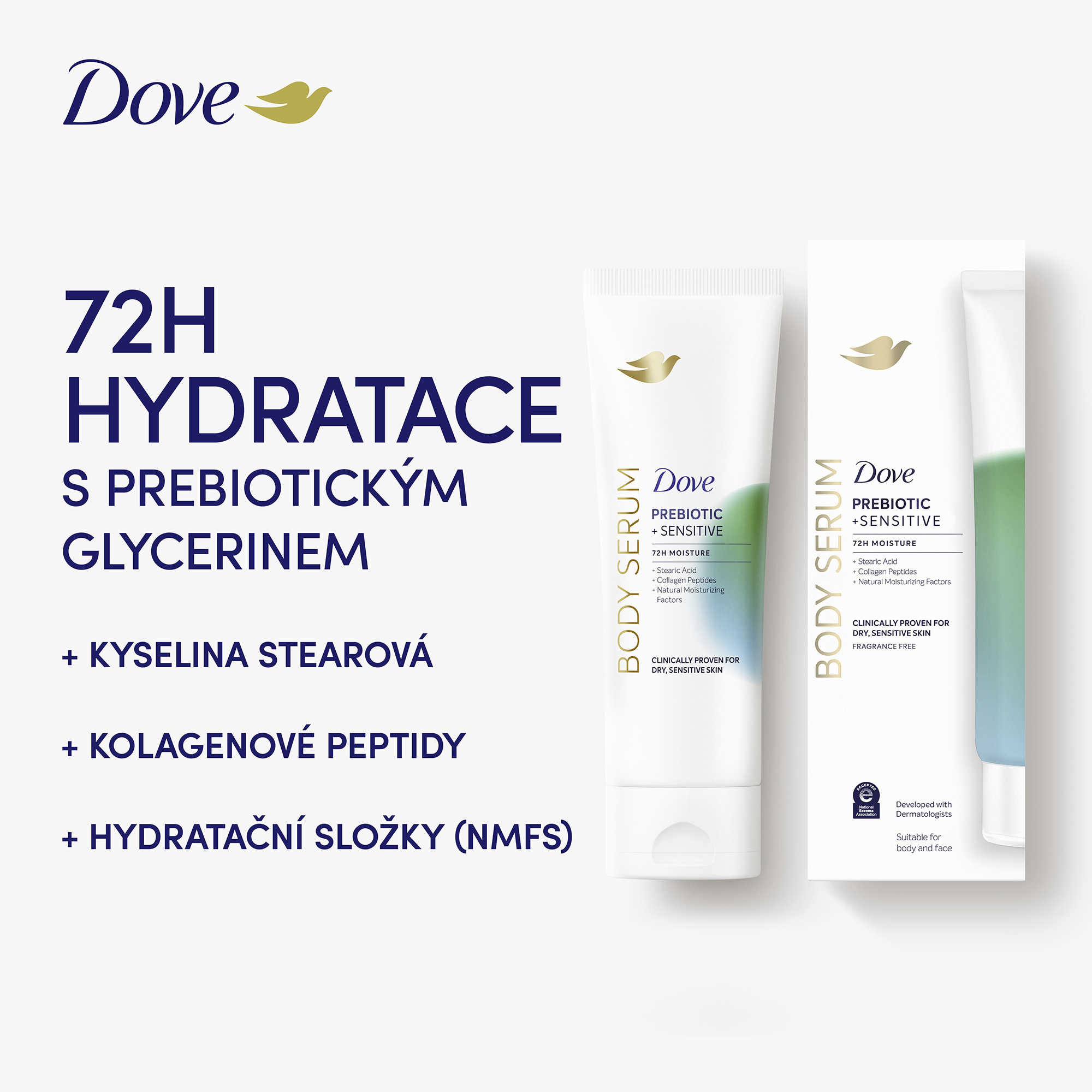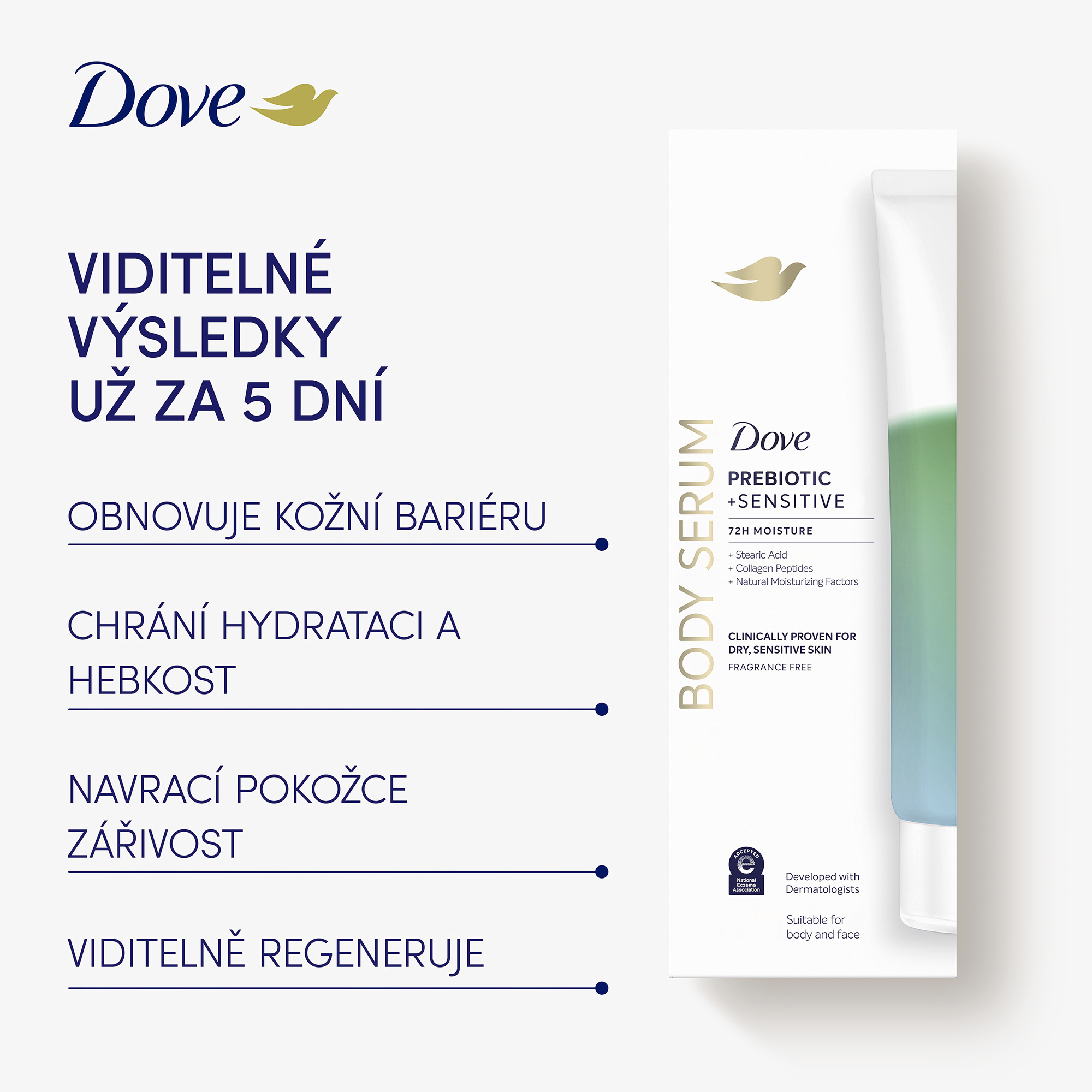 Objevte sílu účinných sér, nyní pro celé vaše tělo - s novým tělovým sérem Dove Sensitive Prebiotic. Toto vysoce účinné sérum bylo klinicky testováno a prokázáno, že hydratuje suchou a citlivou pokožku již od prvního použití. Je ideální pro pleť náchylnou k zarudnutí a podráždění, které poskytuje okamžité zklidnění, obnovu a dlouhotrvající komfort. Jeho složení je obohaceno o Pro-vitamin B5, peptidy a kyselinu stearovou, které společně posilují kožní bariéru, zjemňují texturu pokožky a pomáhají zmírnit známky podráždění. Díky 72hodinové hydrataci je pokožka okamžitě jemná, pružná a viditelně obnovená. Viditelné výsledky se dostavují už za 5 dní - zarudnutí a podráždění způsobené suchostí jsou zmírněny, pokožka je hladší, zářivější a její struktura je viditelně vylepšená. Dove Sensitive Prebiotic tělové sérum - pro tělo, které je zklidněné, chráněné a krásně hydratované.
