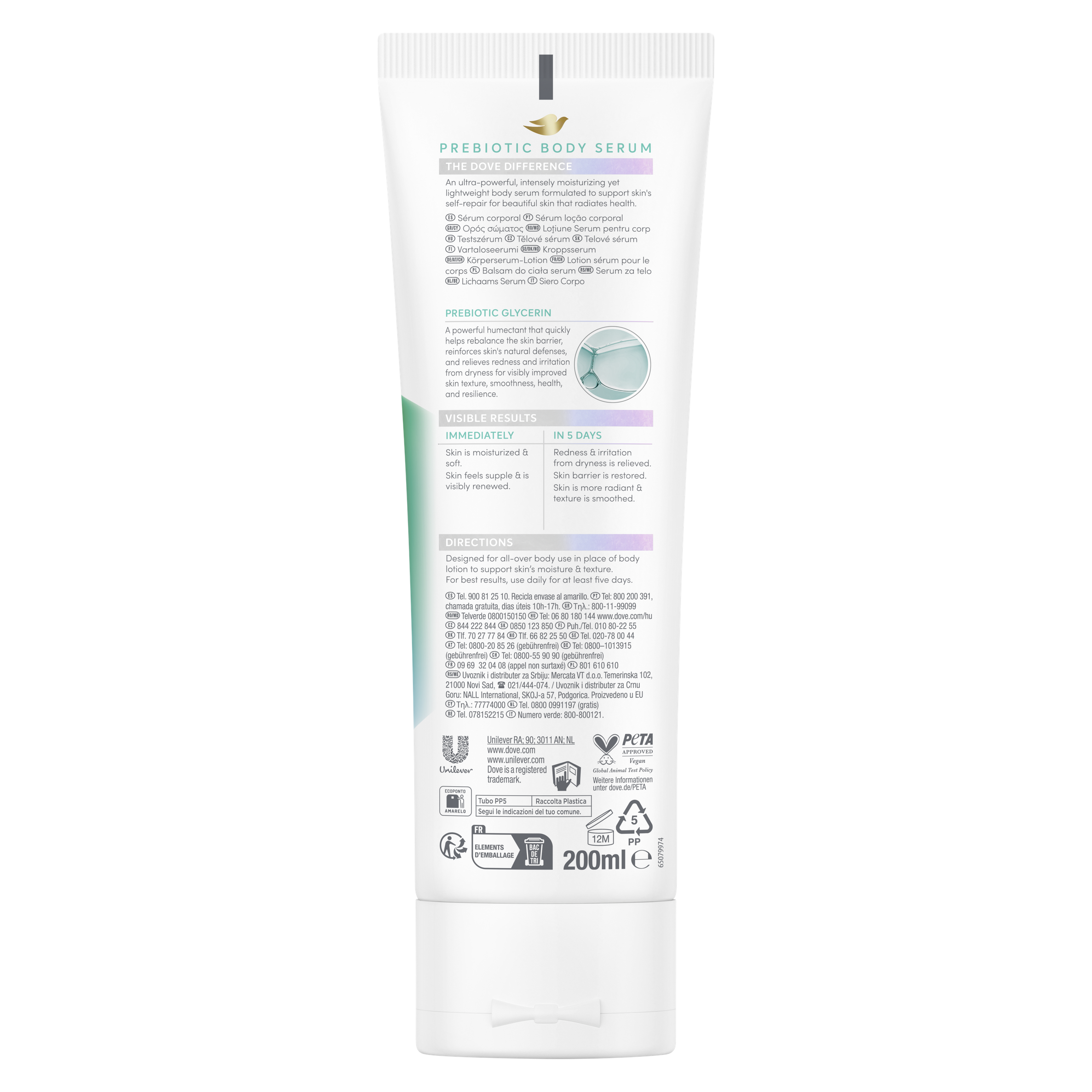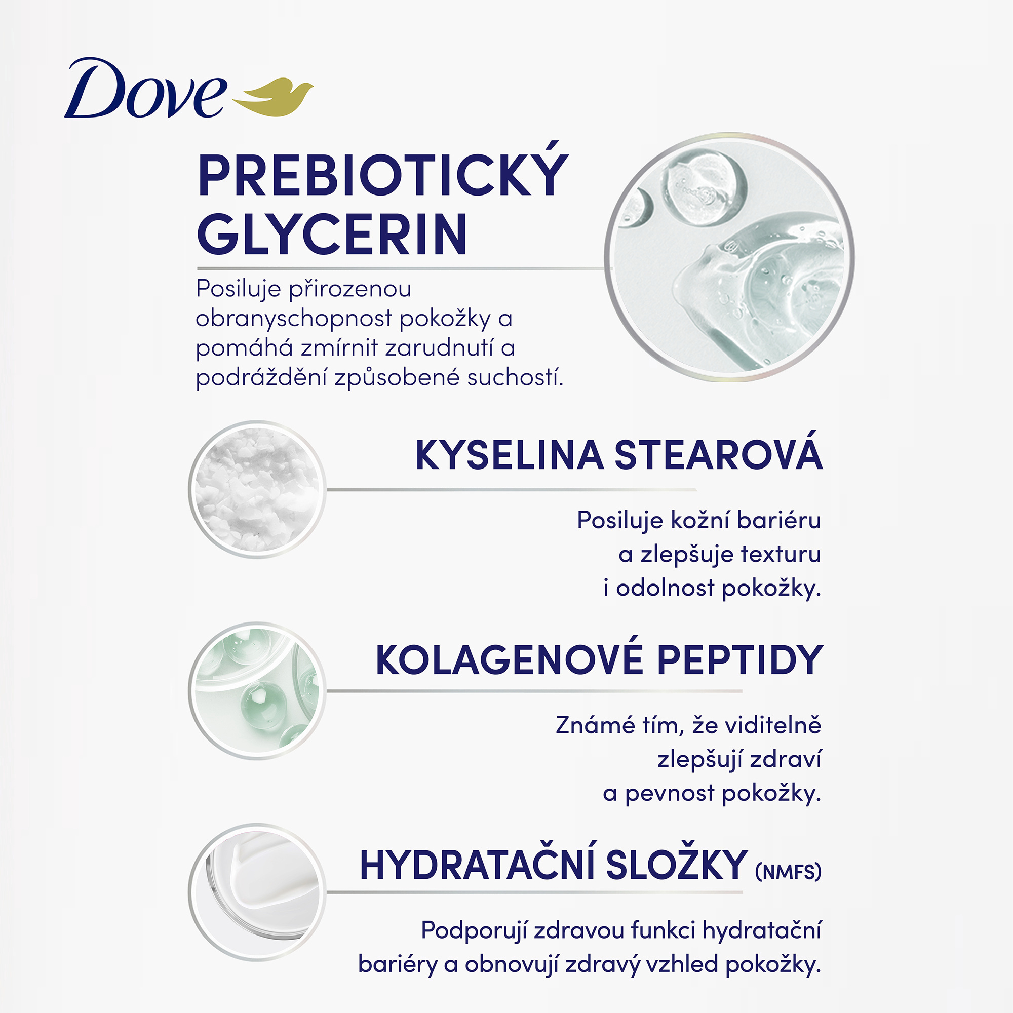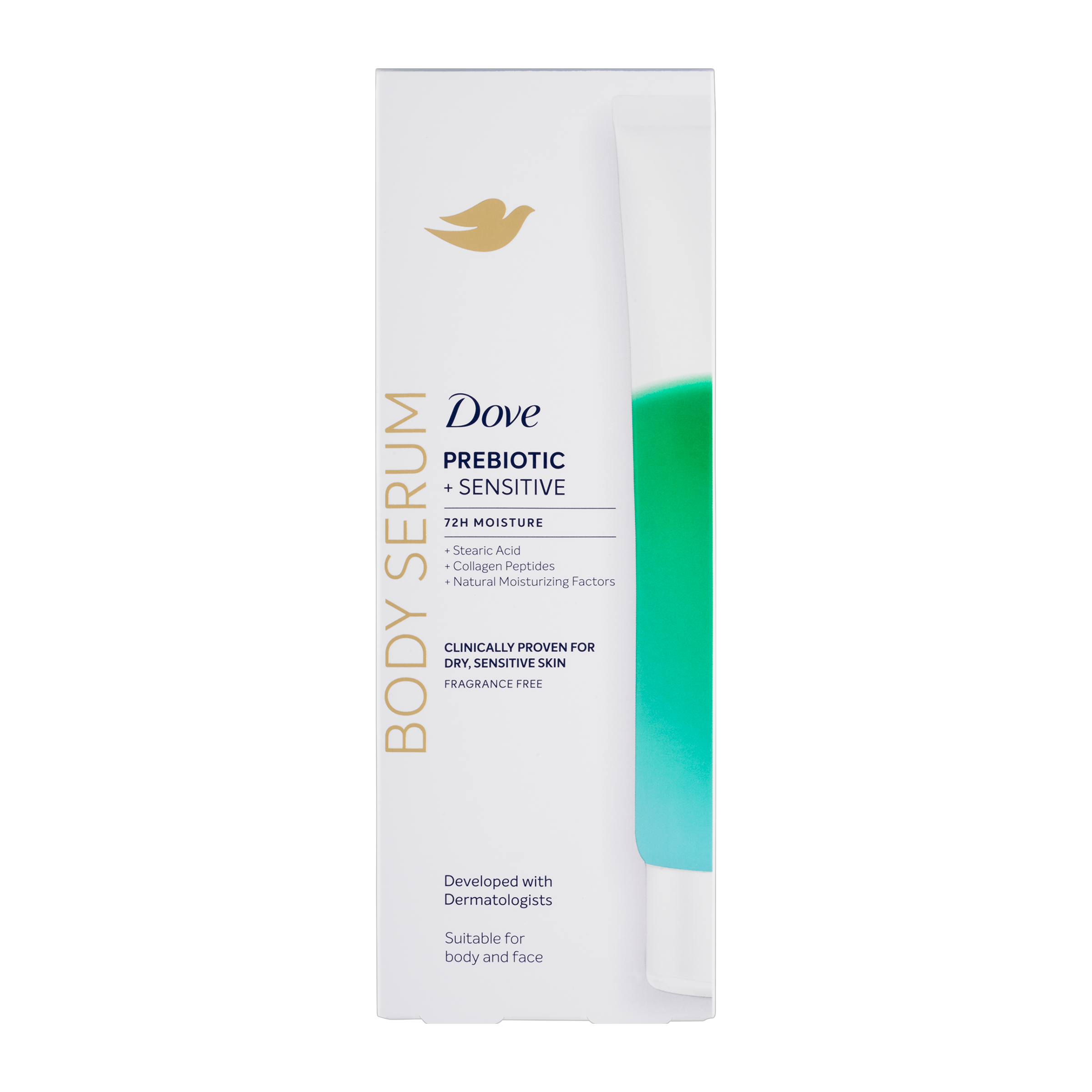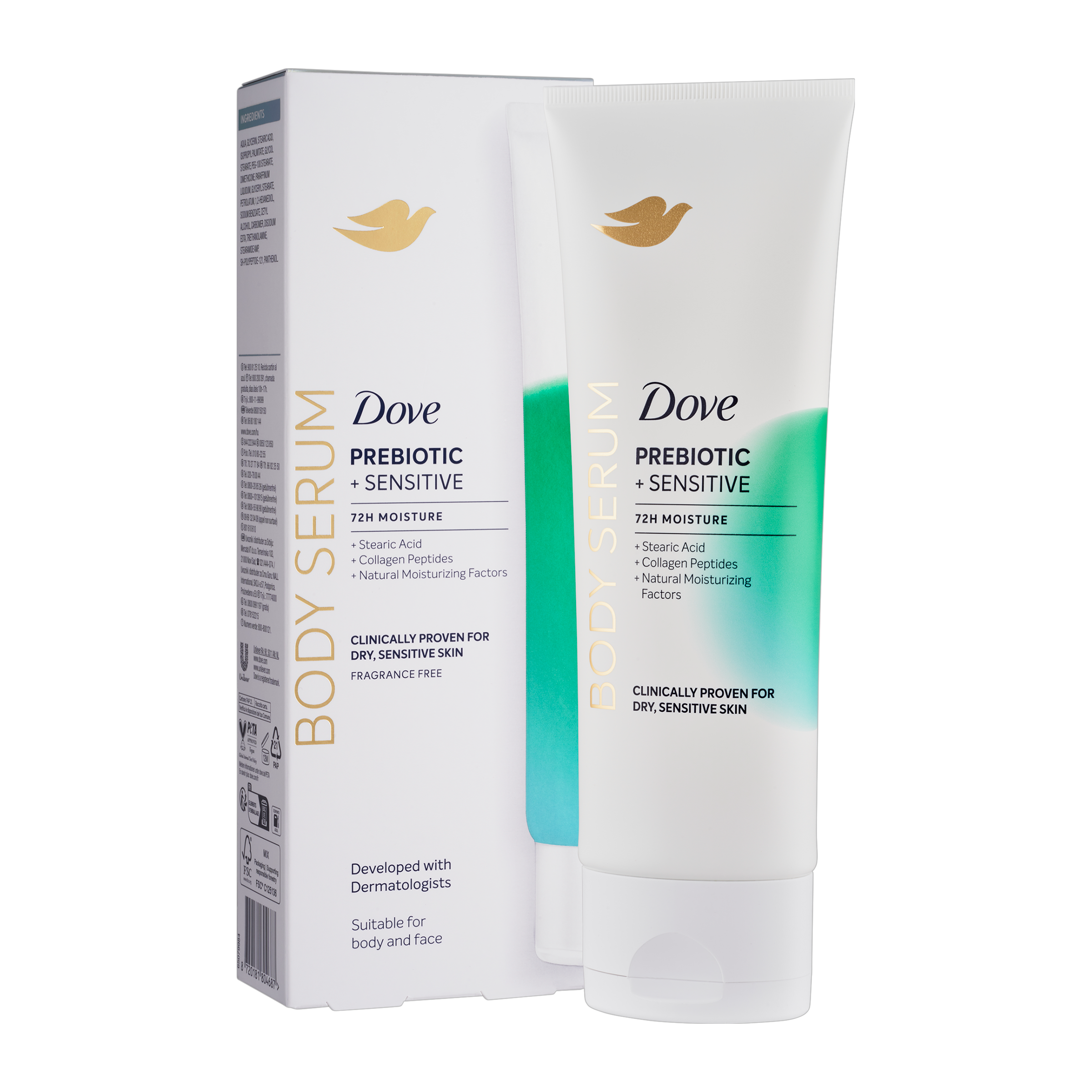 Objevte sílu účinných sér, nyní pro celé vaše tělo - s novým tělovým sérem Dove Sensitive Prebiotic. Toto vysoce účinné sérum bylo klinicky testováno a prokázáno, že hydratuje suchou a citlivou pokožku již od prvního použití. Je ideální pro pleť náchylnou k zarudnutí a podráždění, které poskytuje okamžité zklidnění, obnovu a dlouhotrvající komfort. Jeho složení je obohaceno o Pro-vitamin B5, peptidy a kyselinu stearovou, které společně posilují kožní bariéru, zjemňují texturu pokožky a pomáhají zmírnit známky podráždění. Díky 72hodinové hydrataci je pokožka okamžitě jemná, pružná a viditelně obnovená. Viditelné výsledky se dostavují už za 5 dní - zarudnutí a podráždění způsobené suchostí jsou zmírněny, pokožka je hladší, zářivější a její struktura je viditelně vylepšená. Dove Sensitive Prebiotic tělové sérum - pro tělo, které je zklidněné, chráněné a krásně hydratované.