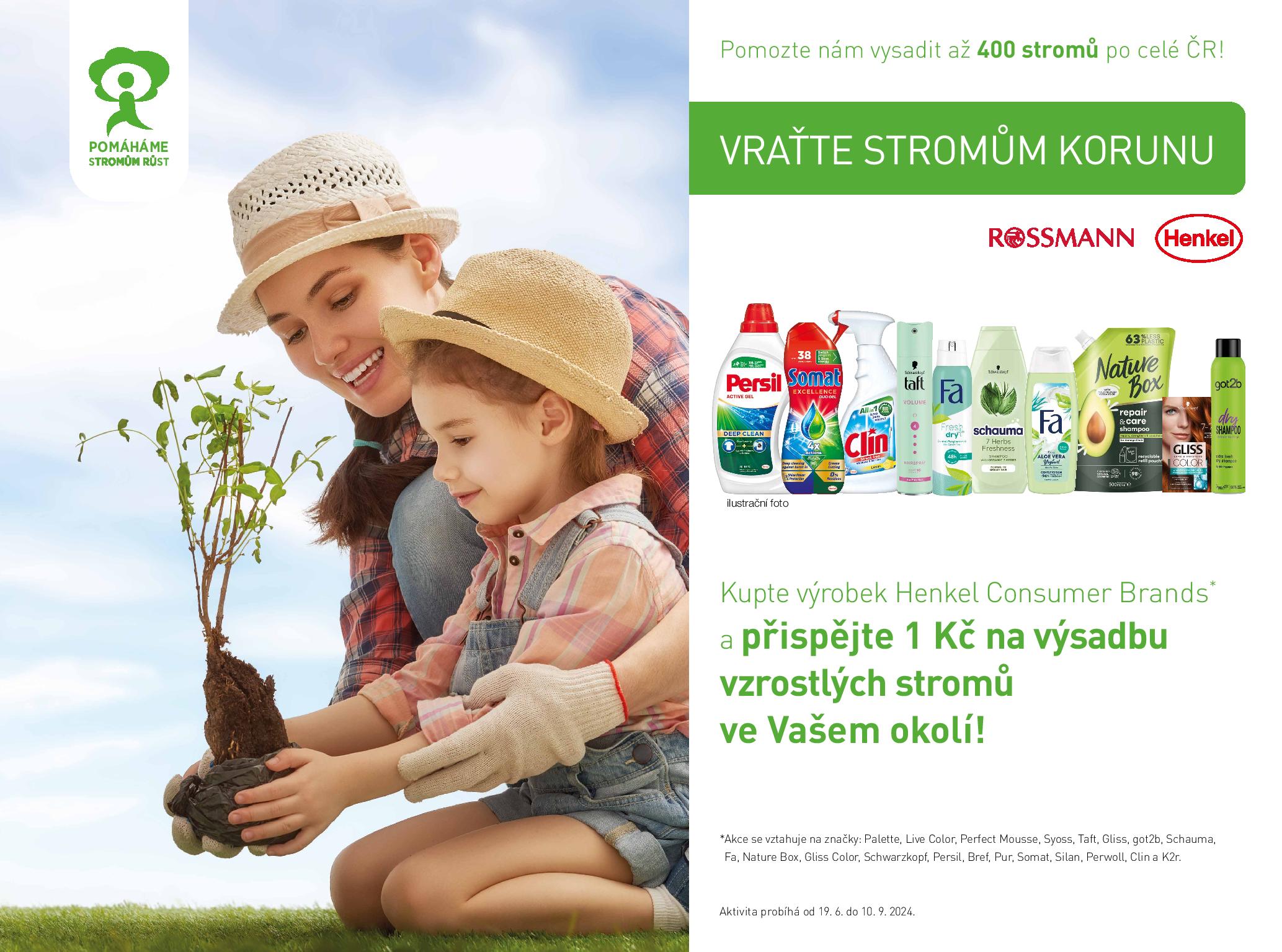 Stačí si jen v období od 19. června do 10. září 2024 zakoupit výrobky značek Palette, Live Color, Perfect Mousse, Syoss, Taft, Gliss, got2b, Schauma, Fa, Nature Box, Gliss Color, Schwarzkopf, Persil, Bref, Pur, Somat, Silan, Perwoll, Clin a K2r. V tomto období pak poputuje automaticky z každého prodaného produktu 1 Kč neziskové organizaci Sázíme stromy, která následně zajistí výsadbu vzrostlých stromů v předem vybraných lokalitách po celé České republice.