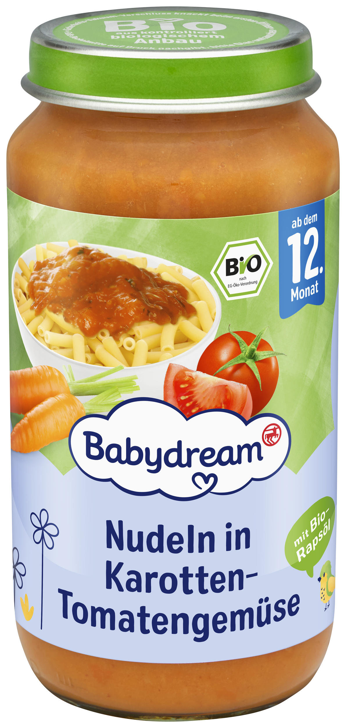 Babydream BIO příkrm nudle v mrkvi s rajčaty_foto ke stažení