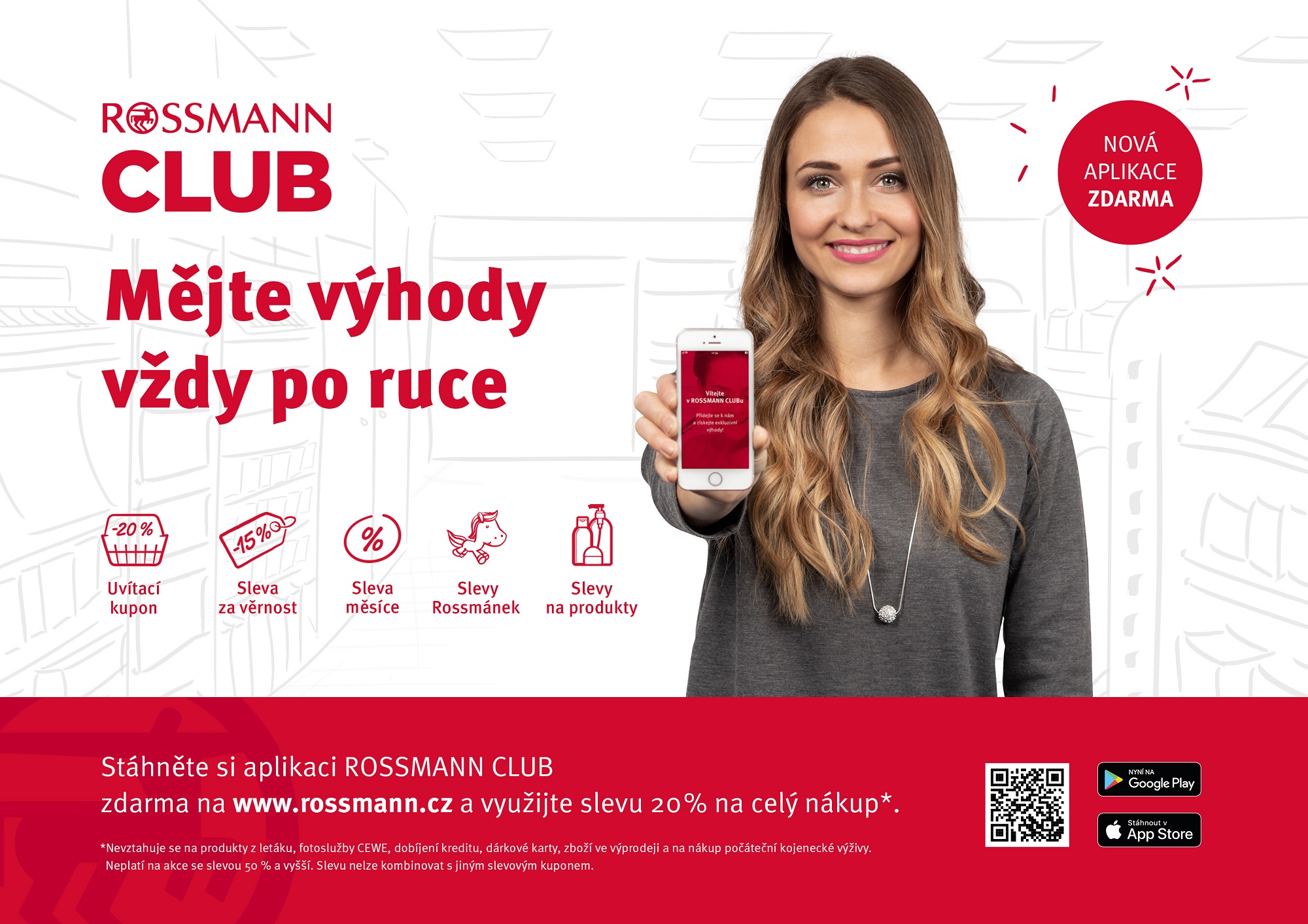 Drogerie ROSSMANN věrnostní program v nové aplikaci spustila 24. dubna 2019. Zákazníci se díky tomu během chvilky dostanou ke slevovým kuponům, akčním cenám či k tematickým a inspirativním článkům na jednom místě. Ve věrnostním programu ROSSMANN CLUB získávají zákazníci při každém nákupu body a mohou je potom kdykoliv směnit za 15% slevové kupony. Například měsíc červen ROSSMANN CLUB zahájí slevou měsíce na všechny dostupné sprchové gely platnou od 4. 6. 2019. Každý nově registrovaný navíc obdrží na první nákup 20% slevu a spolu s ní i přístup ke slevám měsíce či zvýhodněným cenám stávajícího programu Rossmánek. Ten bude platný do konce července 2019 a následně se sloučí s aplikací ROSSMANN CLUB.