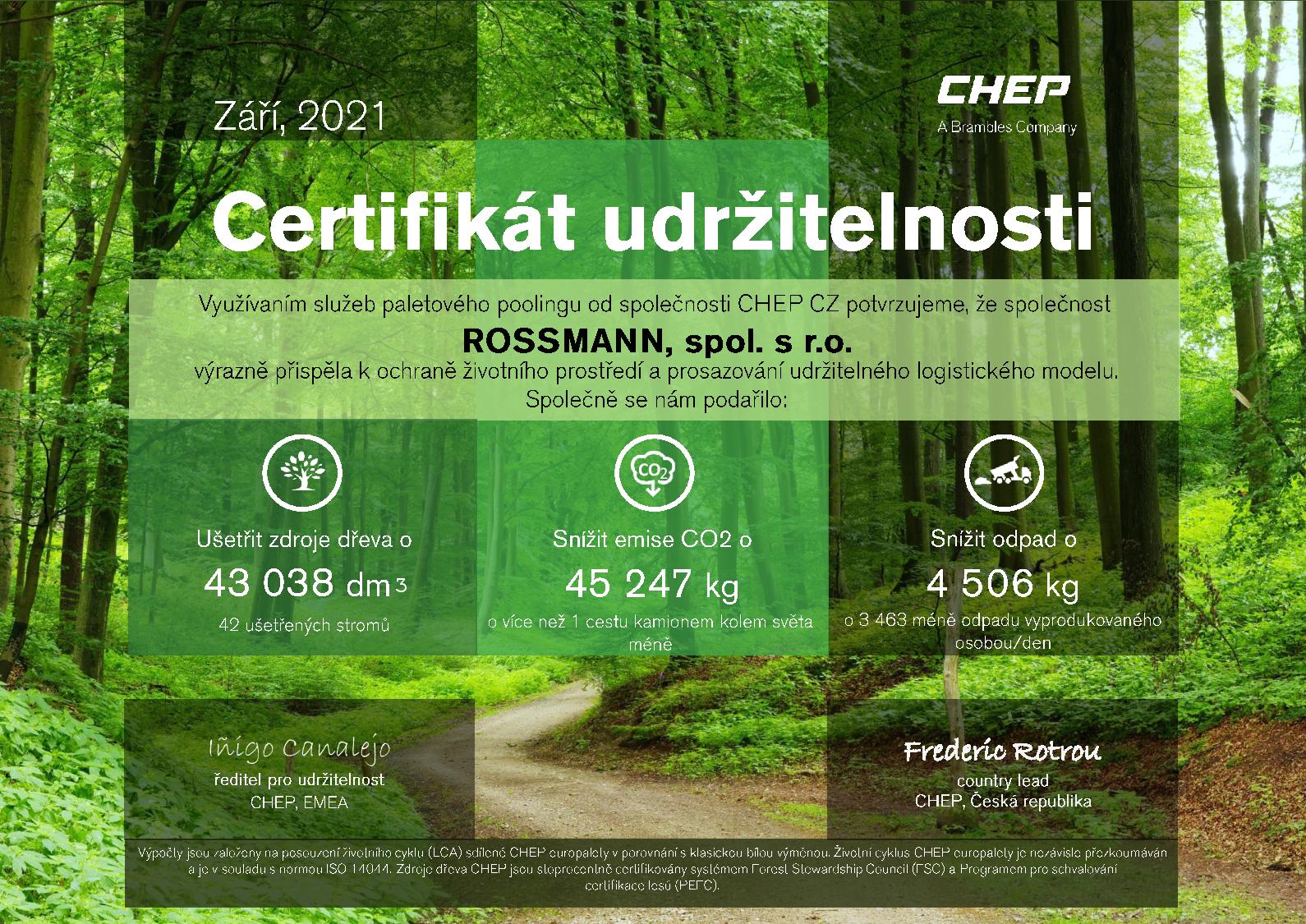 Za prosazování principů udržitelnosti ve výrobě a za ochranu životního prostředí obdržela společnost ROSSMANN na podzim 2021 od společnosti CHEP certifikát udržitelnosti. Ten mimo jiné potvrzuje, že se touto spoluprací ve využívání paletového poolingu podařilo síti drogerií ROSSMANN, společnostem Nutricia a CHEP ušetřit zdroje dřeva o 43 038 dm3, snížit emise CO2 o 45 247 kg a snížit produkci odpadu o 4 506 kg.