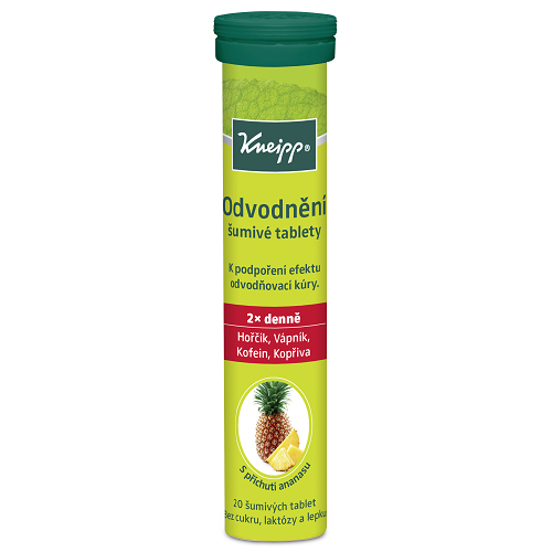 - Kneipp šumivé tablety na podporu odvodňovací kúry - účinky bylinkových tobolek na odvodnění můžete ještě zvýšit doplněním o šumivé tablety pro přípravu osvěžujícího nápoje s ananasovou příchutí. Obsahují přírodní výtažky z listů kopřivy dvoudomé, která je známá svými detoxikačními a diuretickými účinky. Hořčík pomáhá regulovat množství vody v těle a kofein nastartuje proces hubnutí