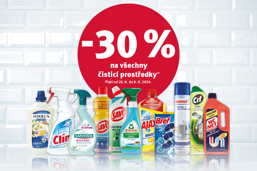 Vneste do svých domovů čerstvý vzduch. Využijte naši 30% SLEVU na všechny čisticí prostředky a uvidíte, že každodenní povinnosti a samotný úklid bude o trochu lehčí. Akce platí od 26. 8. do 8. 9. 2020.