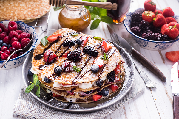 - Do připravené dortové formy, kterou si vytřete máslem a vysypete hladkou moukou, budete palačinku jednu po druhé vrstvit na sebe. Vždy palačinku z jedné strany potřete tvarohovou náplní, přidejte maliny, borůvky a rybíz a takto pokračujte vždy jednu palačinku za druhou.