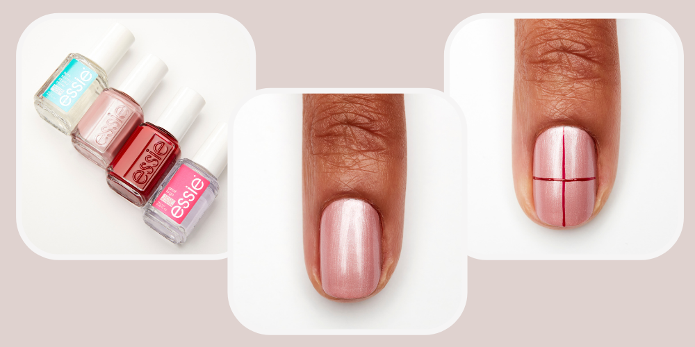 Prvním krokem samotné manikúry je pak podkladový lak essie strong start, který nehty díky obohacení o biotin i posilní. Po zaschnutí 1 vrstvy podkladového laku naneste na celé nehty metalickou růžovou pretty in ink. Nezapomínejte přelakovat i hrany nehtů. Po zaschnutí růžového podkladu si nehet pomocí úzkého štětečku a odstínu love note-worthy na maličkou šachovnici a 2 políčka vyplňte. Zbylá můžete nechat jen růžová nebo třeba vytvořit srdíčka – ideálně pomerančovým dřívkem si naneste 3 tečky do tvaru trojúhelníku a spojte je do srdíčkového tvaru.