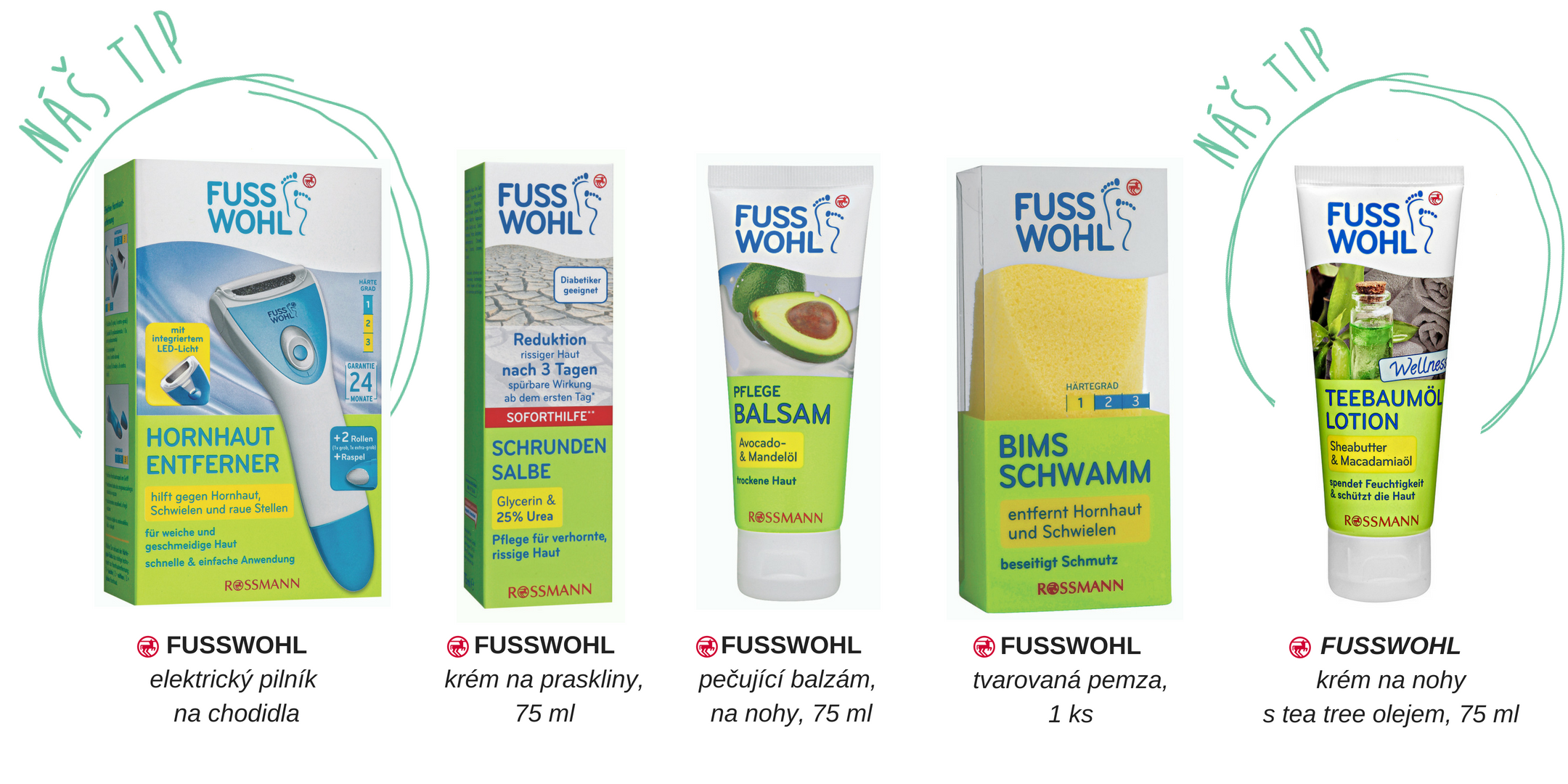 Chodidla pořádně promasírujte, osušte a opatrně odstraňte zrohovatělou kůži. Vyzkoušejte pemzu nebo elektrický pilník na chodidla naší privátní značky FUSSWOHL. Poté nohy namažte ošetřujícím krémem. Vyzkoušejte krém na nohy od značky FUSSWOHL, který obsahuje tea tree olej, makademiový olej a bambucké máslo, díky čemuž má skvělé antibakteriální, regenerační a hydratační účinky, rychle se vstřebává a kůži zanechává sametově hebkou.