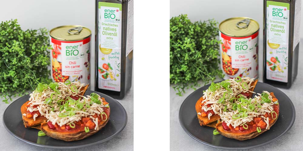 - Upečené batáty rozkrojte napůl, přidejte směs chilli sin carne a posypejte strouhaným tofu a jarní cibulkou.