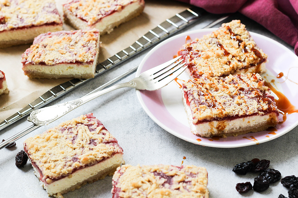 - Na plech s pečícím papírem rozprostřeme 2/3 těsta. Na těsto dáme vrstvu tvarohu a poté vrstvu připravenou z brusinkové šťávy. Nahoru nastrouháme zbytek těsta.
