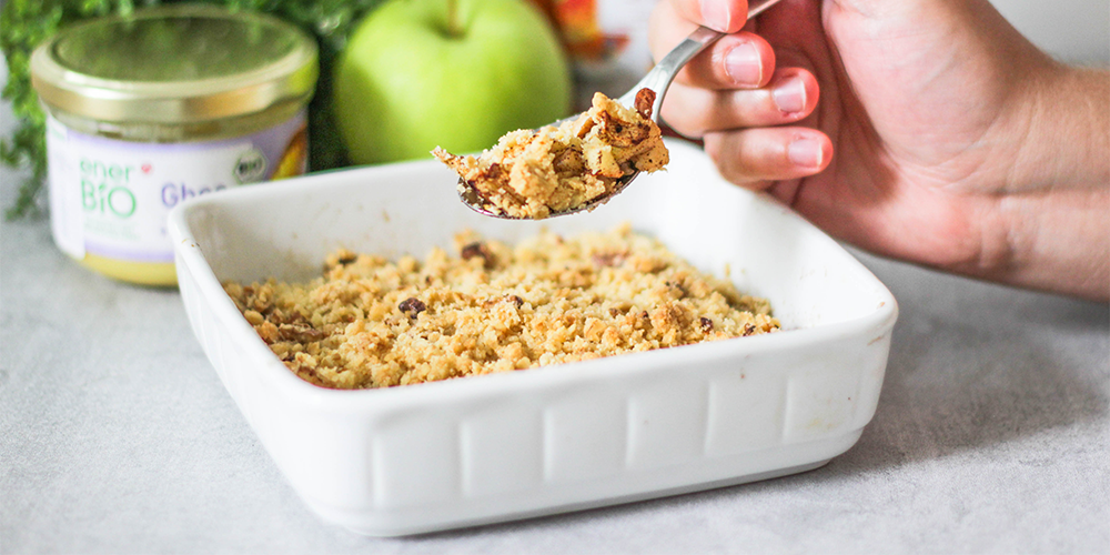 TIP: Crumble chutná nejlépe ještě teplý politý javorovým sirupem enerBio.