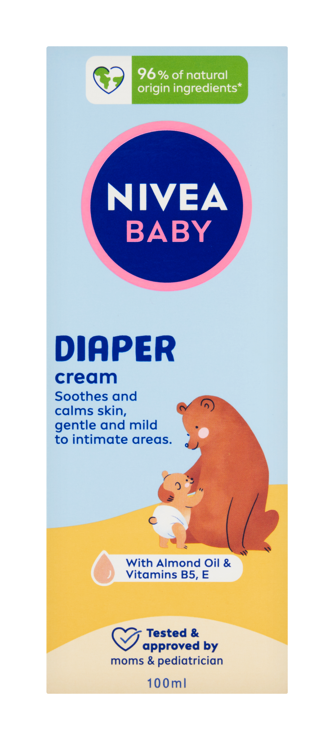 Nivea® Baby Ochranný krém na zadeček se 100 % přírodním mandlovým olejem a vitamíny B5 a E poskytuje spolehlivou ochranu a pečuje o jemnou dětskou pokožku v plenkové oblasti. Veganské a biologicky rozložitelné složení^ bez mikroplastů^^ a parabenů. Ingredience pocházejí z přírody a po zpracování si uchovávají více než 50% své molekulární struktury (v přirozeném stavu), včetně vody.