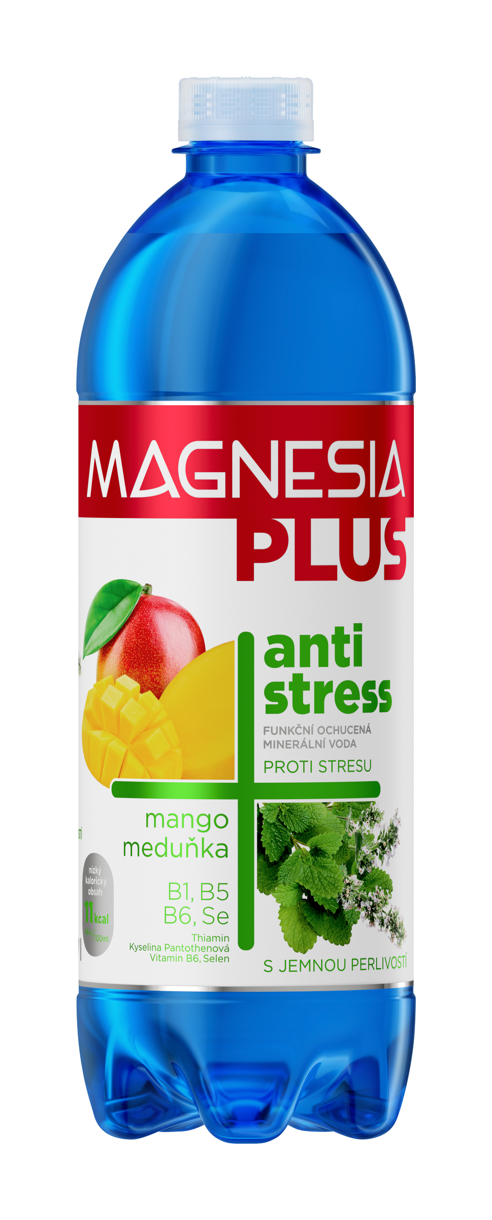 Ochucená minerální voda Magnesia Plus Antistress s příchuť mango a meduňka.