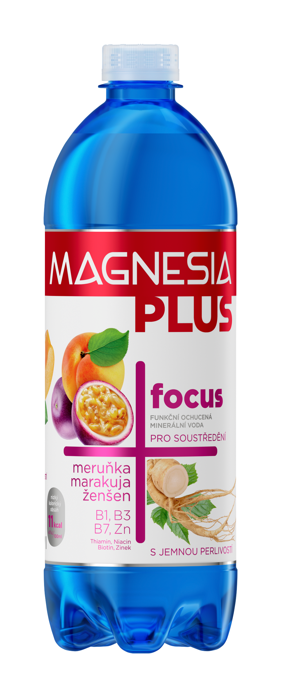 Ochucená minerální voda Magnesia Plus Focus s příchuť meruňka, marakuja a žensen.