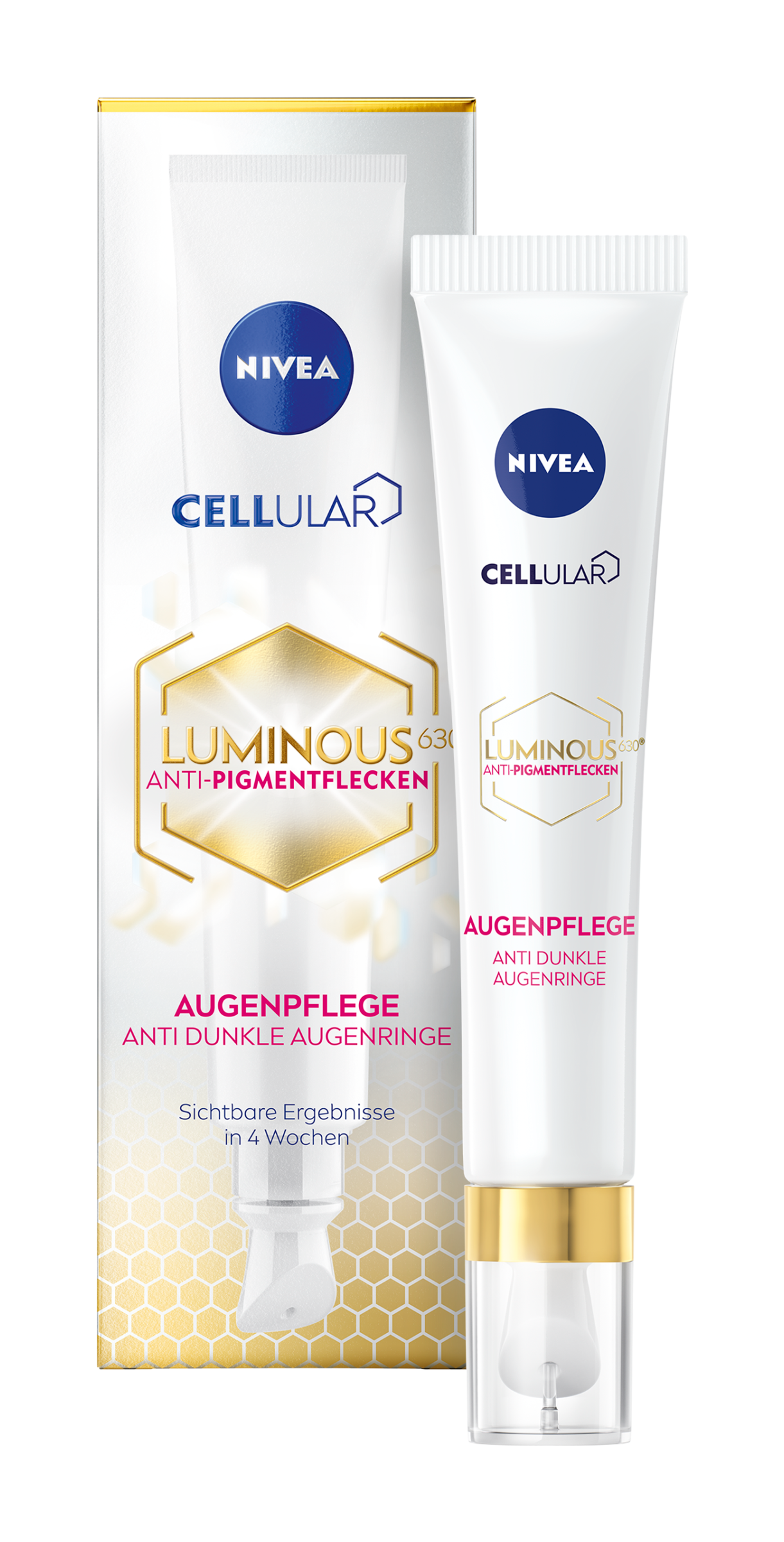 První oční péče Nivea®, která účinně ošetřuje 3 hlavní příčiny tmavých kruhů. Složení s: Luminous630®: Vyrovnává nerovnosti pigmentace a zesvětluje tmavé kruhy. Energizující kofein: Redukuje váčky pod očima. Kyselina hyaluronová: Hydratuje pleť a redukuje jemné linky a vrásky kolem očí. Pro rozzářené a mladě vypadající kontury očí. Viditelné výsledky za 4 týdny. Prokázané výsledky po 8 týdnech*: Intenzita tmavých kruhů pod očima je redukována o 40 %. Oční okolí je rozzářenější o 75 %. *12týdení studie se 41 ženami, 2020-2021.