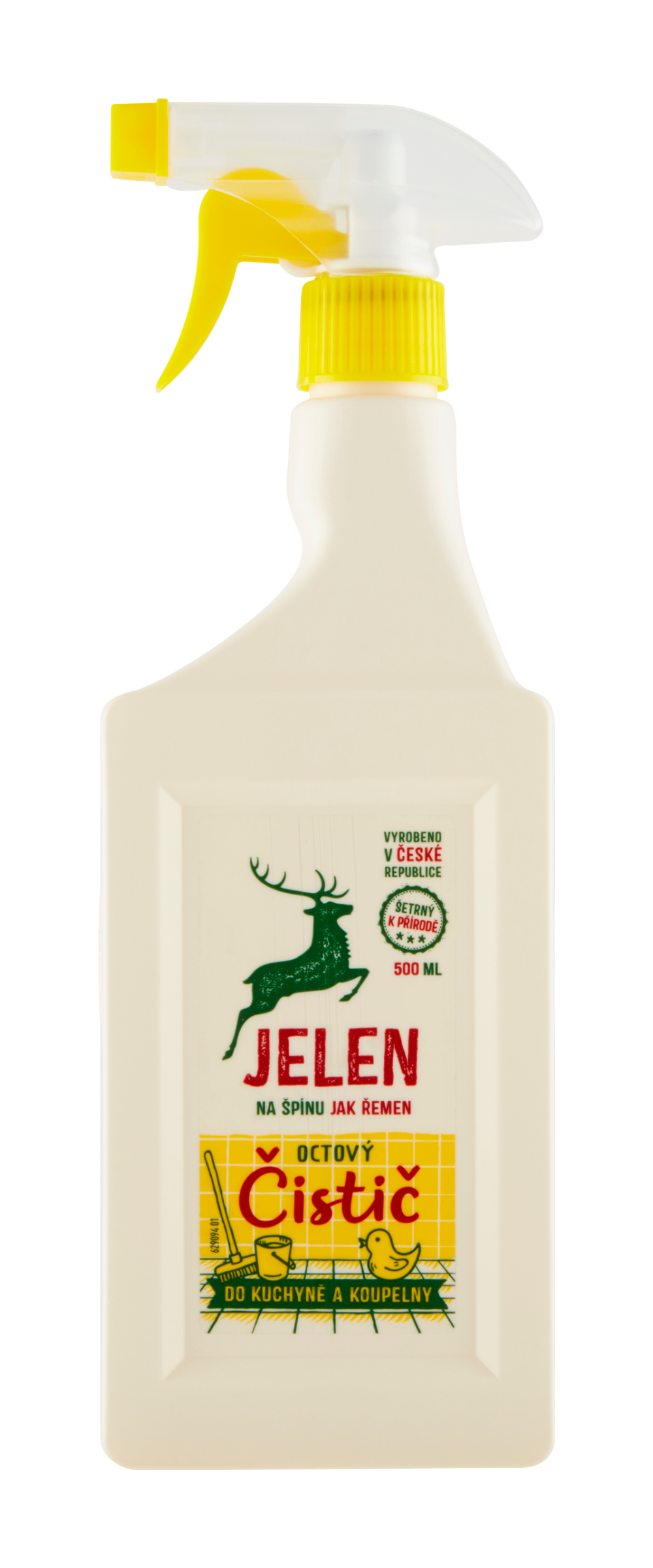 Do kuchyně a koupelny Šetrný k přírodě Jelen octový čistič na vodní kámen a urputnou špínu. Už Jelenova babička drhla vodní kámen a silnou špínu octem. Proto Jelenův čistič na bázi octa v kuchyni i koupelně tak dobře funguje. Jelen Na špínu jak řemen.