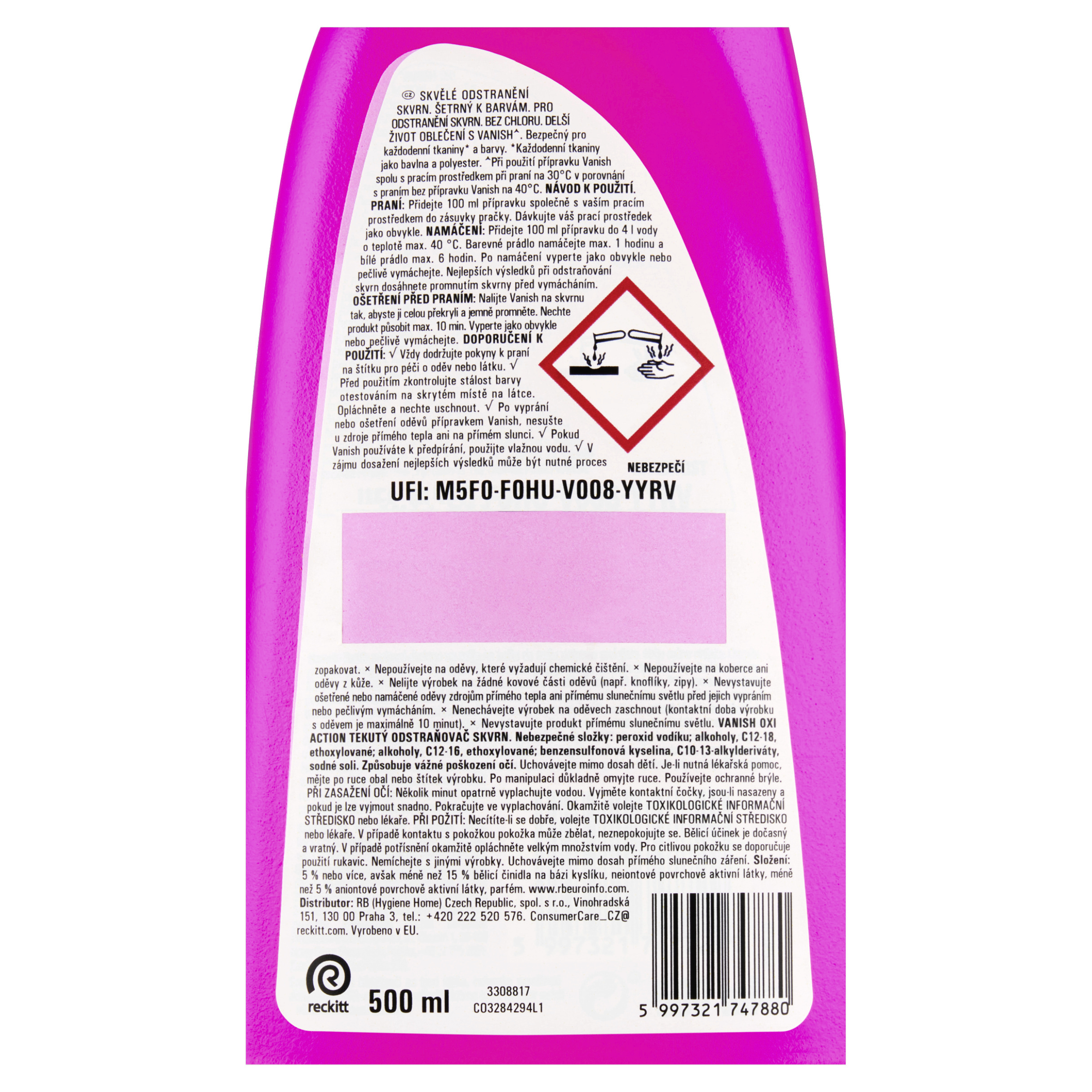 NEBEZPEČÍ VANISH OXI ACTION TEKUTÝ ODSTRAŇOVAČ SKVRN. Nebezpečné složky: peroxid vodíku; alkoholy, C12-18, ethoxylované; alkoholy, C12-16, ethoxylované; benzensulfonová kyselina, C10-13-alkylderiváty, sodné soli. Způsobuje vážné poškození očí. Uchovávejte mimo dosah dětí. Je-li nutná lékařská pomoc, mějte po ruce obal nebo štítek výrobku. Po manipulaci důkladně omyjte ruce. Používejte ochranné brýle. PŘI ZASAŽENÍ OČÍ: Několik minut opatrně vyplachujte vodou. Vyjměte kontaktní čočky, jsou-li nasazeny a pokud je lze vyjmout snadno. Pokračujte ve vyplachování. Okamžitě volejte TOXIKOLOGICKÉ INFORMAČNÍ STŘEDISKO nebo lékaře. PŘI POŽITÍ: Necítíte-li se dobře, volejte TOXIKOLOGICKÉ INFORMAČNÍ STŘEDISKO nebo lékaře. V případě kontaktu s pokožkou pokožka může zbělat, neznepokojujte se. Bělicí účinek je dočasný a vratný. V případě potřísnění okamžitě opláchněte velkým množstvím vody. Pro citlivou pokožku se doporučuje použití rukavic. Nemíchejte s jinými výrobky.