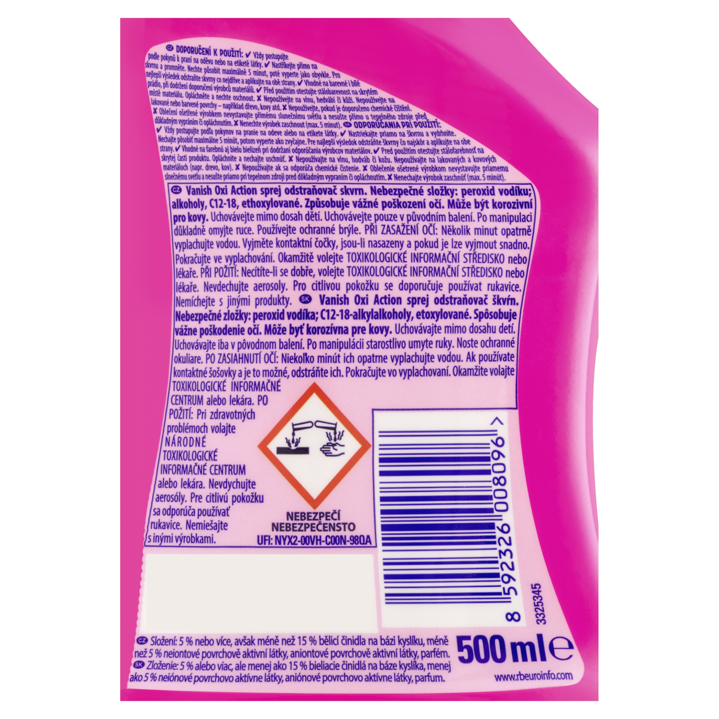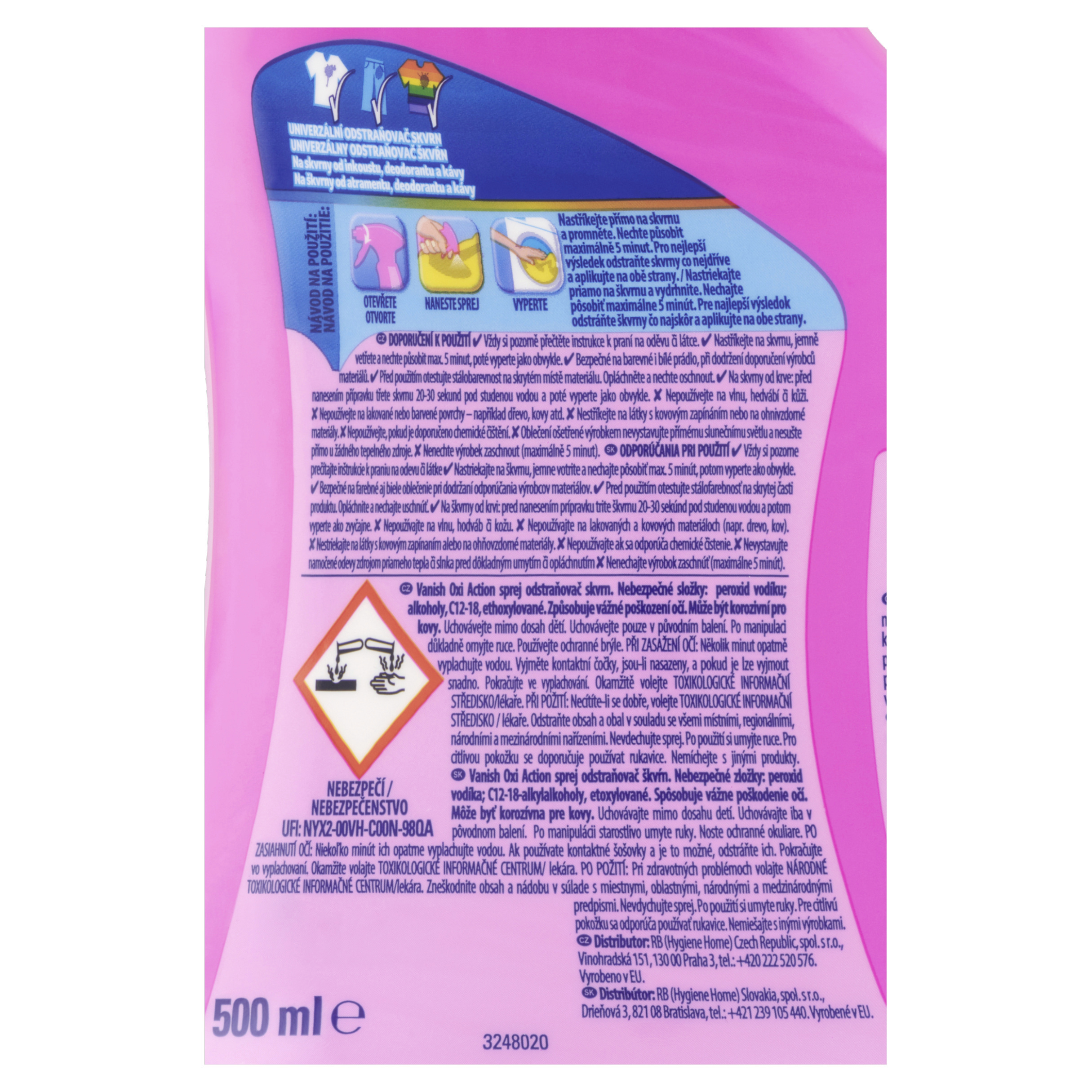 NEBEZPEČÍ Vanish Oxi Action sprej odstraňovač skvrn. Nebezpečné složky: peroxid vodíku; alkoholy, C12-18, ethoxylované. Způsobuje vážné poškození očí. Může být korozivní pro kovy. Uchovávejte mimo dosah dětí. Uchovávejte pouze v původním balení. Po manipulaci důkladně omyjte ruce. Používejte ochranné brýle. PŘI ZASAŽENÍ OČÍ: Několik minut opatrně vyplachujte vodou. Vyjměte kontaktní čočky, jsou-li nasazeny, a pokud je lze vyjmout snadno. Pokračujte ve vyplachování. Okamžitě volejte TOXIKOLOGICKÉ INFORMAČNÍ STŘEDISKO/lékaře. PŘI POŽITÍ: Necítíte-li se dobře, volejte TOXIKOLOGICKÉ INFORMAČNÍ STŘEDISKO/lékaře. Nevdechujte sprej. Po použití si umyjte ruce. Pro citlivou pokožku se doporučuje používat rukavice. Nemíchejte s jinými produkty.