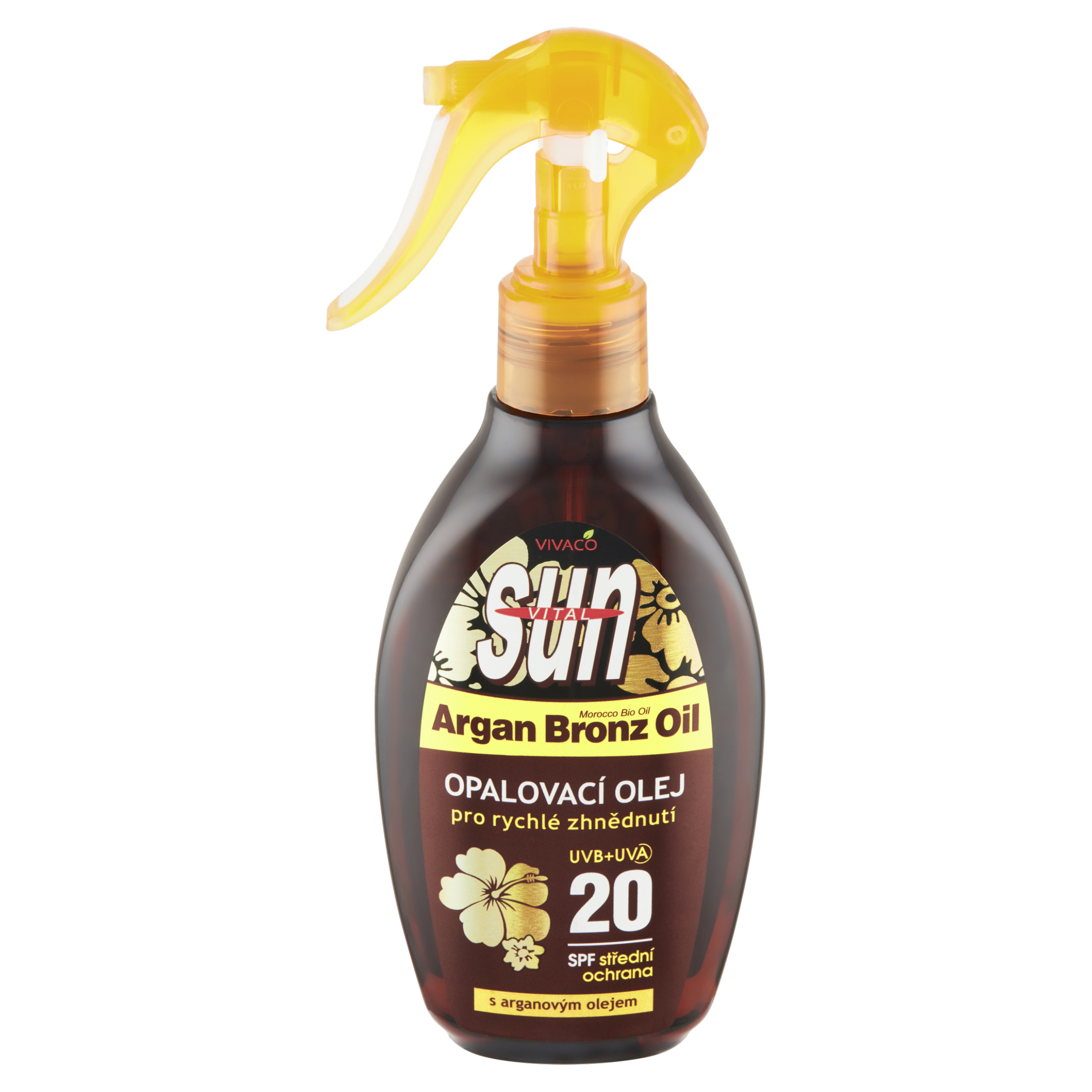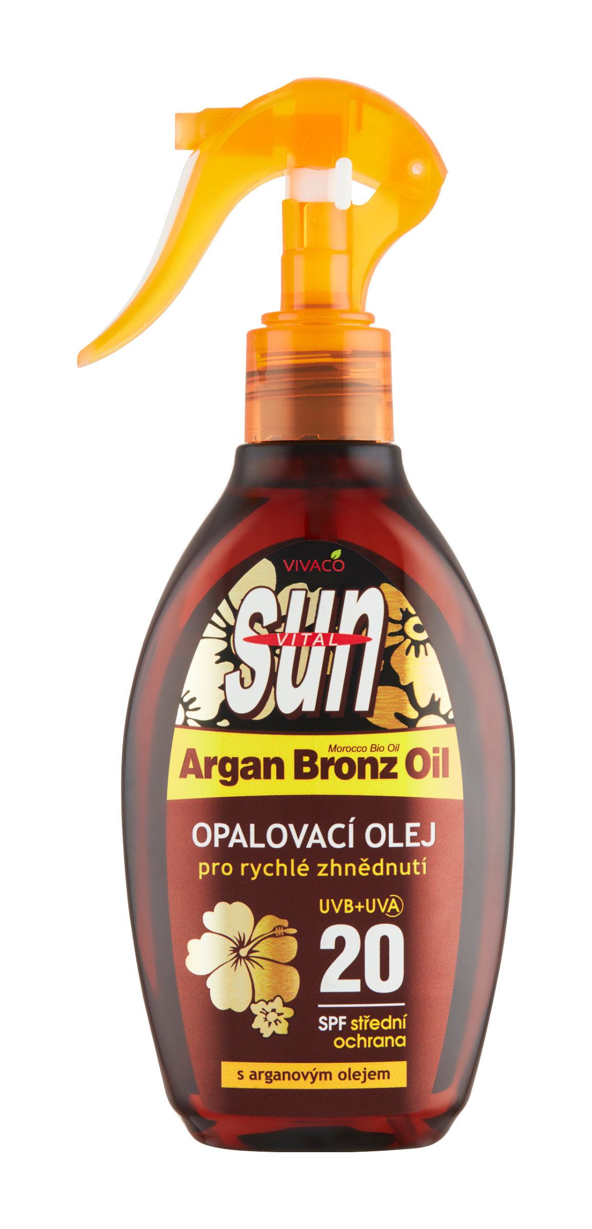 Arganový opalovací olej SPF 20 Opalovací olej s UVB+UVA faktorem poskytuje ochranu před spálením a předčasným stárnutím pokožky vlivem slunečního záření. Arganový olej chrání pleť před vysoušení a urychluje její zhnědnutí.