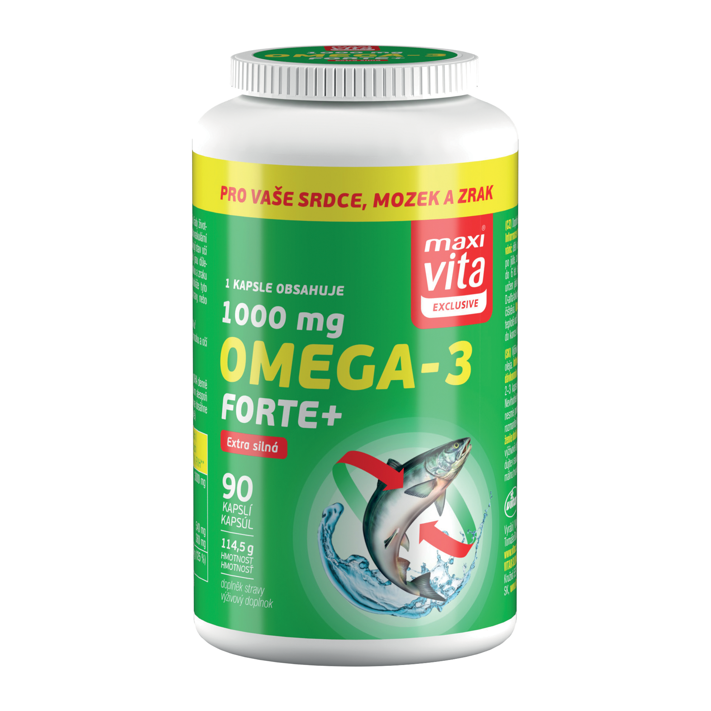 Doplněk stravy Maxi Vita Exclusive měkké želatinové kapsle s obsahem rybího oleje. Omega 3 nenasycené mastné kyseliny EPA a DHA zasahují do řady životních procesů v lidském organizmu. Jsou důležité pro kardiovaskulární systém, zejména pro správnou činnost srdce. Příznivě ovlivňují stav očí a podílí se i na činnosti mozku. Omega 3 mastné kyseliny jsou důležité také pro těhotné a kojící ženy - pro správný vývoj mozku a zraku plodu i kojeného dítěte. Vzhledem k tomu, že si tělo nedokáže tyto látky vytvářet samo, je nutné je do těla dodávat pomocí stravy, nebo jejich doplňků.
