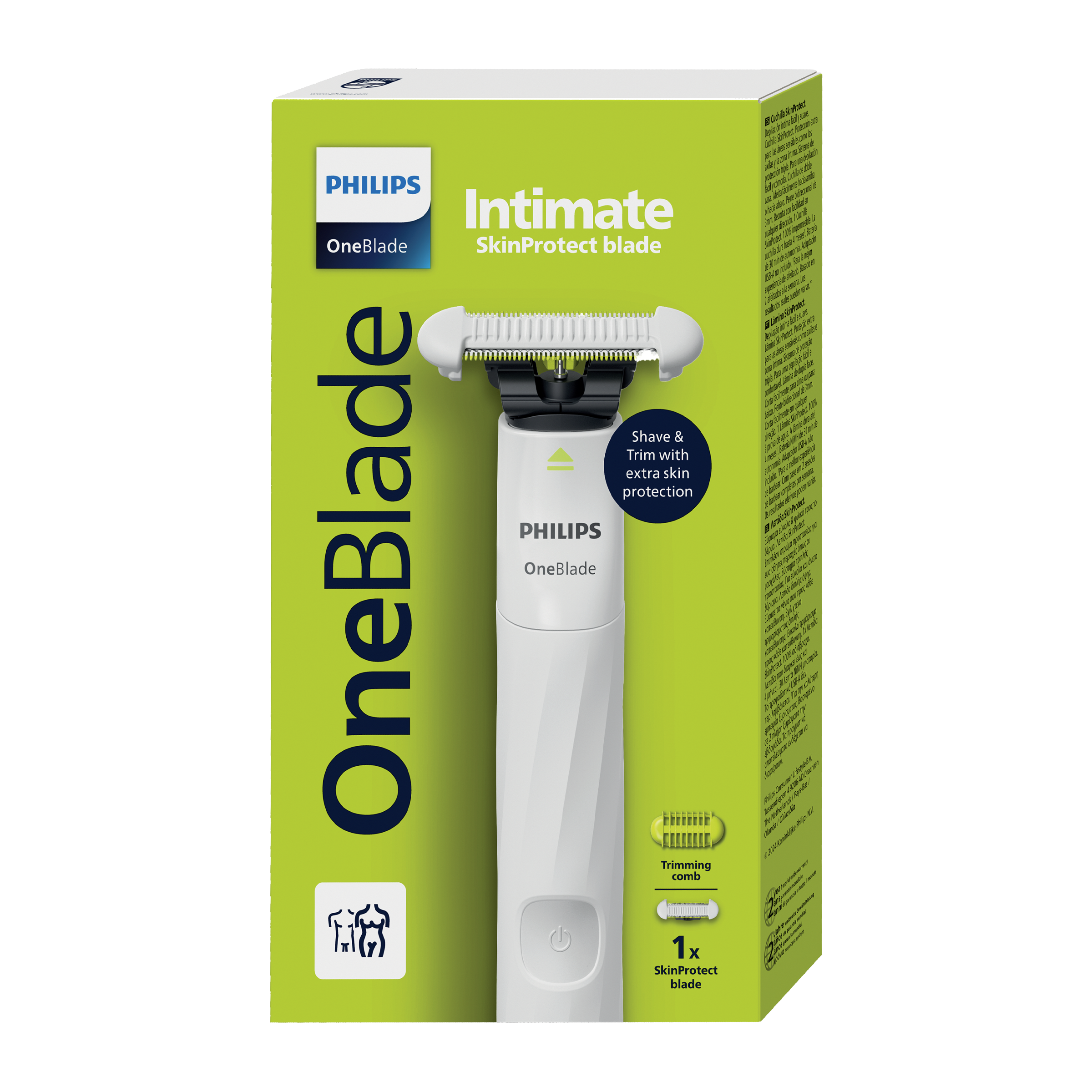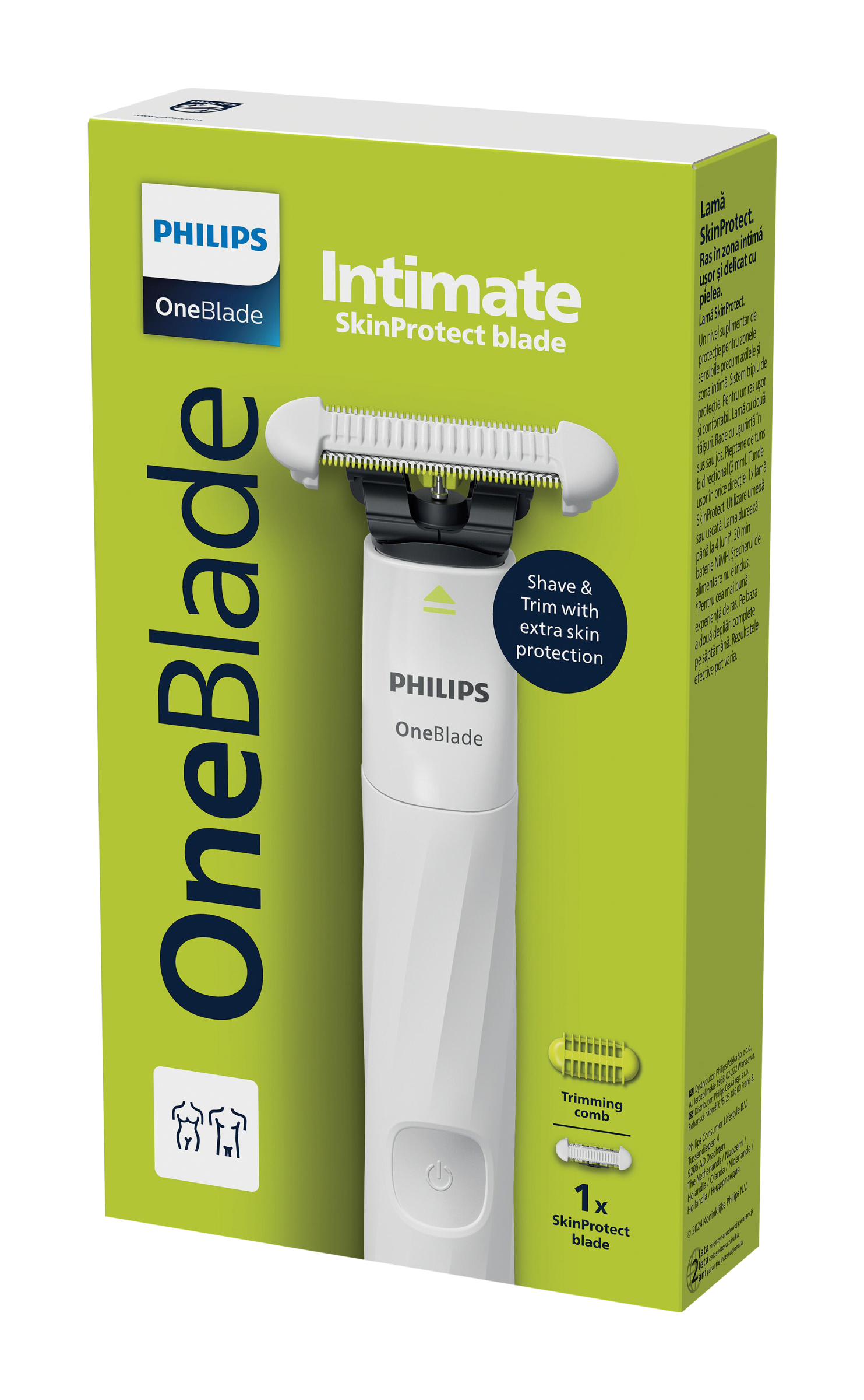 Philips OneBlade Intimate. Pro intimnní partie, pro ženy. Chrání vaše intimní partie, bez ohledu na to, zda se holíte nebo zastřihujete. Břit SkinProtect poskytuje dodatečnou ochranu vašich citlivých oblastí, jako jsou podpaždí a intimní partie. Obousměrný zastřihovací hřeben (3mm) zastřihává v jakémkoliv směru a umožnuje snadnou a rychlou úpravu chlupů i na větších oblastech těla.
