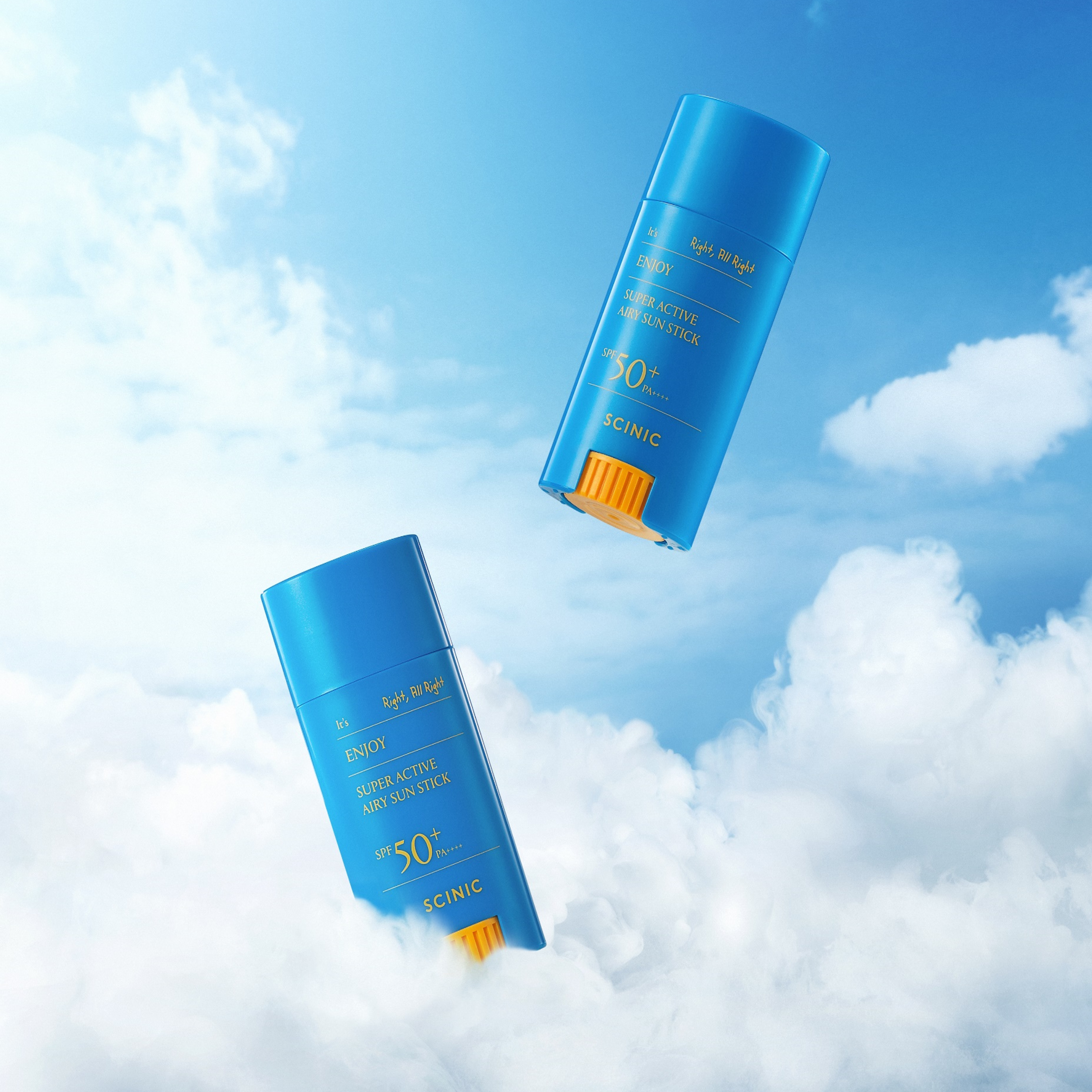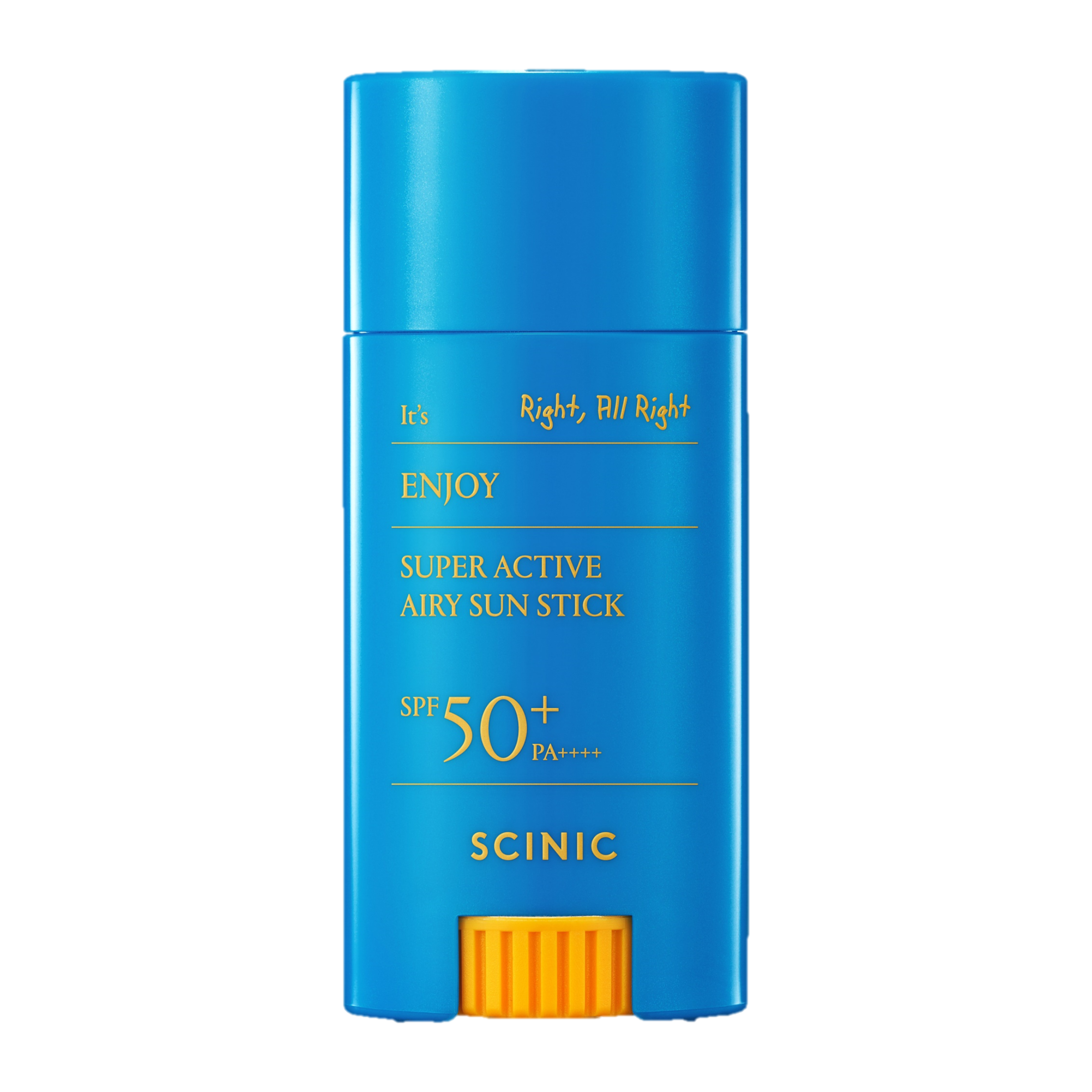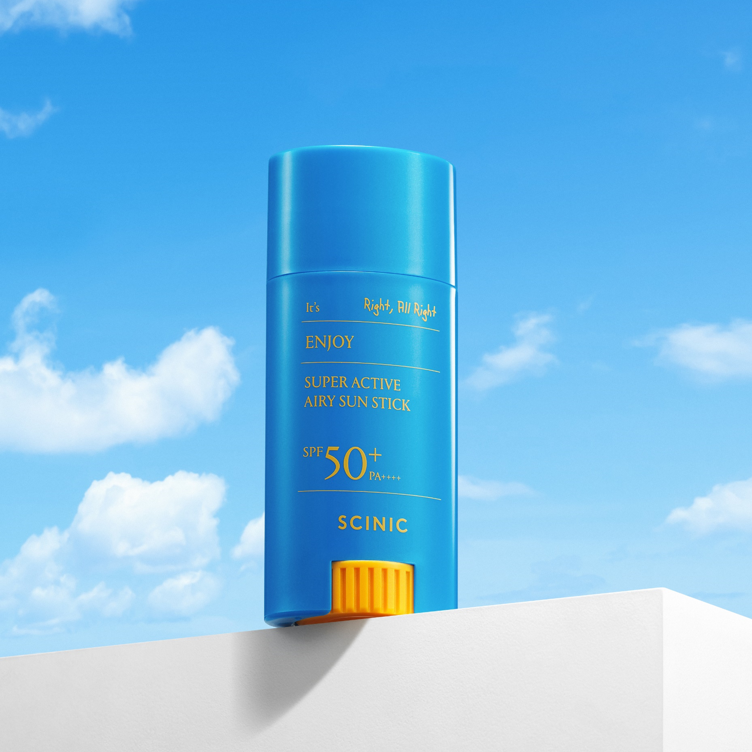 Průhledná tyčinka Scinic Enjoy Super Active SPF50+ na opalování pro svěží, matný vzhled pleti. S obsahem výtažků z bylin a bavlníkovým olejem.