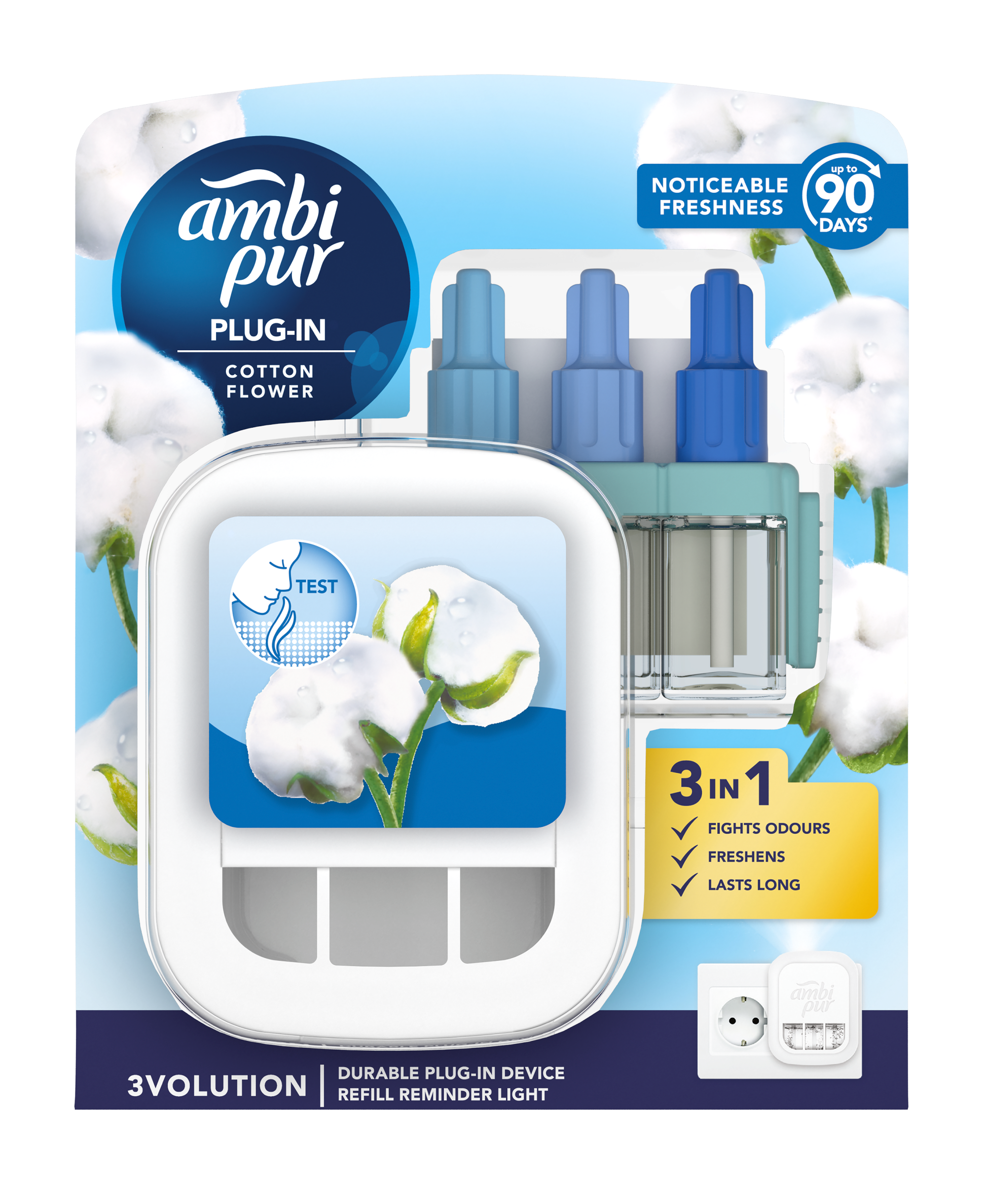 Ambi Pur 3Volution Infinity Cotton průběžně odstraňuje pachy a střídá 3 navzájem se doplňující vůně pro svěžest, kterou budete vždy vnímat. Vydrží až 90 dnů (při používání 12 hodin denně s nastavením nejnižší úrovně odpařování). Objevte krásu Cotton nyní s 2x větším účinkem v porovnání s našimi běžnými osvěžovači vzduchu: Intenzivnější vůně s větším dosahem naplní místnost vůní. Vůně Cotton Fresh je inspirovaná svěžestí čisté bílé bavlny. Vnímejte klid, který vás obklopí, když se vzduch naplní touto čistou a decentní vůní. U běžných elektrických osvěžovačů si na vůně rychle zvykneme a přestaneme je vnímat. Osvěžovač vzduchu Ambi Pur 3Volution svěžest obnovuje tím, že se každých 45 minut automaticky střídají 3 vzájemně se doplňující, vysoce kvalitní vůně. Náplně Ambi Pur 3Volution používejte s odpařovacím strojkem 3 Volution, abyste naplnili váš domov svěžestí a vůní, kterou budete vnímat den co den, týden co týden. 3Volution také umožňuje nastavit intenzitu odpařování vůně a tak vám pomůže vytvořit požadovanou atmosféru.