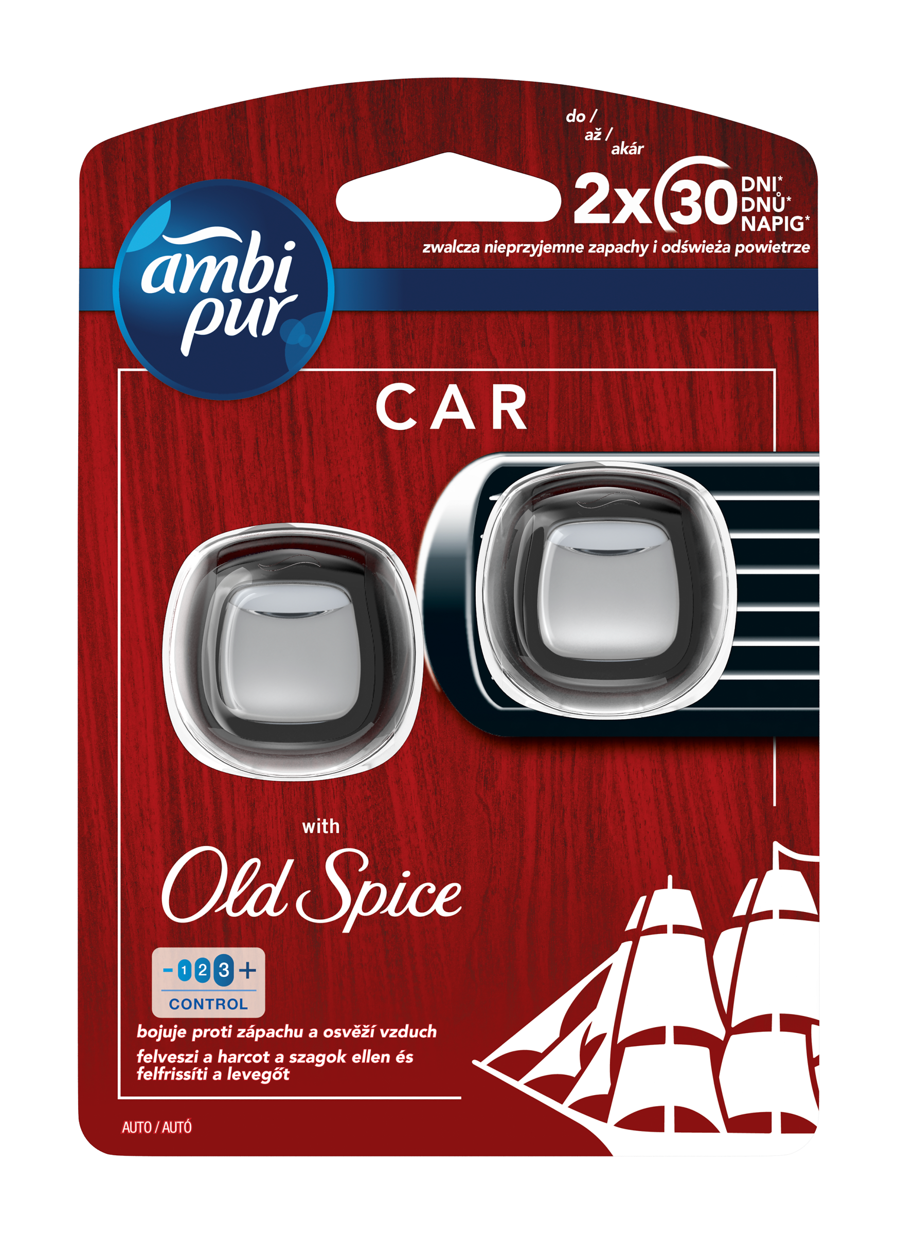 Osvěžovač vzduchu do auta Ambi Pur s technologií OdourClear nepřetržitě odstraňuje nepříjemné vytrvalé zápachy z vašeho auta a zanechává lehkou svěží vůni po dobu až 70 dnů. Objevte divokou svěžest Old Spice také v autě. Oproti většině ostatních osvěžovačů vzduchu do auta, které zápach většinou jen překrývají, osvěžovač do auta Ambi Pur pachy skutečně eliminuje a zanechává jen nádhernou svěží vůni. Jedná se o malý nenápadný osvěžovač vzduchu, který se jednoduše připevní ke klimatizaci vozidla; díky nové a jedinečné technologii OdourClear osvěží vaše auto a zbaví ho i nejvytrvalejších pachů, například z jídla, domácích mazlíčků, kouře nebo odpadků. Pomocí kolečka na boku můžete dokonce nastavit intenzitu vůně. Osvěžovač vzduchu do auta Ambi Pur se snadno používá, pracuje bez baterie nebo elektřiny a vydrží až 30 dnů, abyste mohli vy i posádka spokojeně dýchat. Vyzkoušejte kompletní řadu nových výrobků Ambi Pur s jedinečnou technologií OdourClear, například osvěžovač textilií Ambi Pur pro odstraňování zápachu z textilních materiálů vašeho automobilu nebo osvěžovače vzduchu Ambi Pur Air či Ambi Pur Small Spaces pro váš domov. Vyzkoušejte také elektrický osvěžovač vzduchu 3volution pro nepřetržitou eliminaci zápachu po dobu až 90 dnů