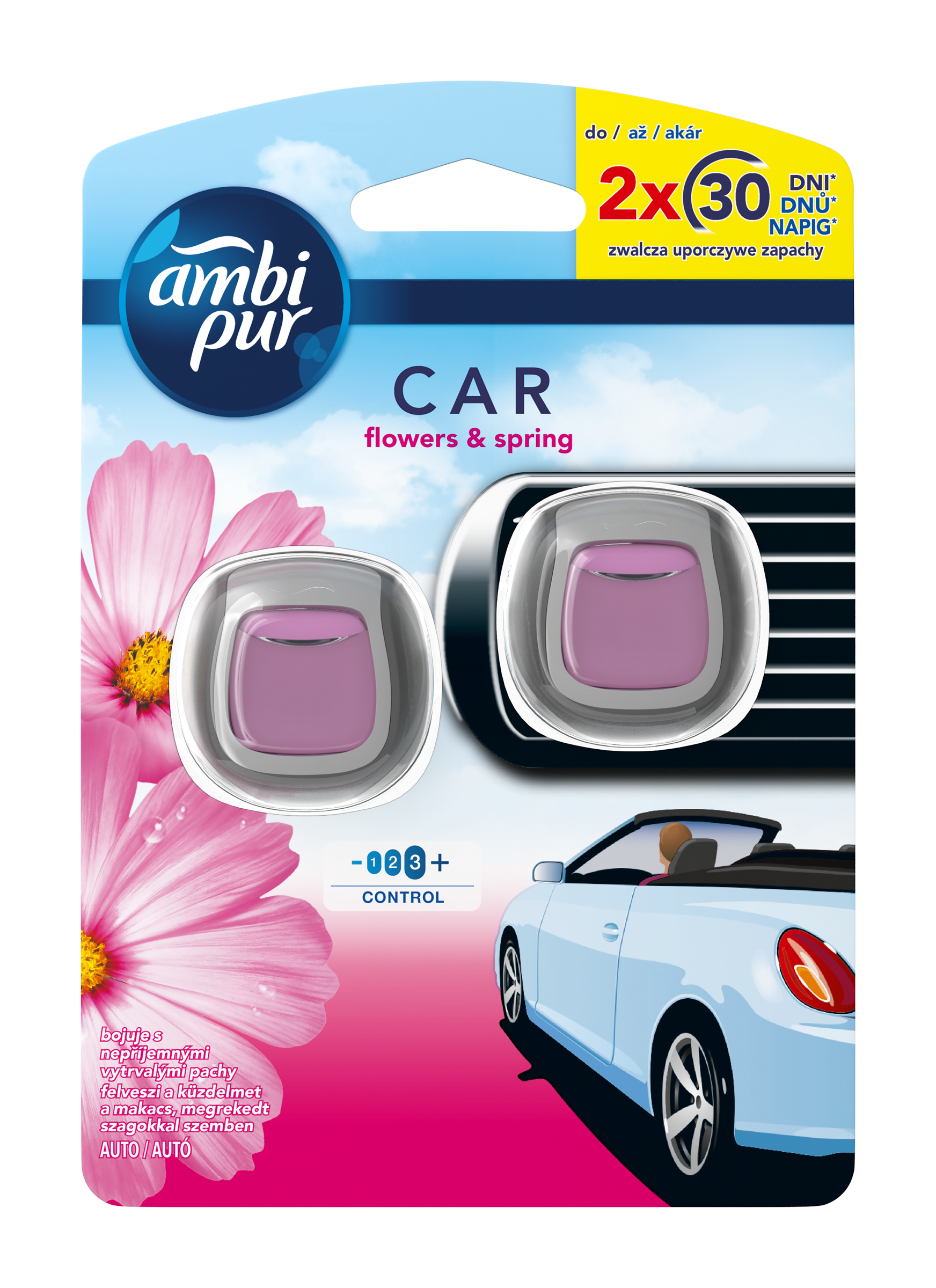 Osvěžovač vzduchu do auta Ambi Pur s technologií OdourClear nepřetržitě odstraňuje nepříjemné vytrvalé pachy z vašeho auta a zanechává lehkou svěží vůni po dobu až 70 dnů. Vůně Flowers & Spring naplní váš domov jiskřivou osvěžující vůní, která evokuje první jarní sluneční paprsky dopadající na něžná poupata květin. Oproti většině ostatních osvěžovačů vzduchu do auta, které pachy většinou jen překrývají, osvěžovač do auta Ambi Pur zápach skutečně eliminuje a zanechává jen nádhernou svěží vůni. Jedná se o malý nenápadný osvěžovač vzduchu, který se jednoduše připevní ke klimatizaci vozidla; díky nové a jedinečné technologii OdourClear osvěží vaše auto a zbaví ho i nejvytrvalejších pachů, například z jídla, domácích mazlíčků, kouře nebo odpadků. Pomocí kolečka na boku můžete dokonce nastavit intenzitu vůně. Osvěžovač vzduchu do auta Ambi Pur se snadno používá, nepotřebuje baterii ani elektřinu a vydrží až 30 dnů, abyste mohli vy i posádka spokojeně dýchat. Vyzkoušejte kompletní řadu nových výrobků Ambi Pur s jedinečnou technologií OdourClear, například osvěžovač textilií Ambi Pur pro odstraňování zápachu z textilních materiálů ve vozidle nebo Ambi Pur osvěžovač vzduchu ve spreji či Ambi Pur Small Spaces do domácnosti. Vyzkoušejte také elektrický osvěžovač vzduchu 3volution, který zápach eliminuje po dobu až 90 dnů.