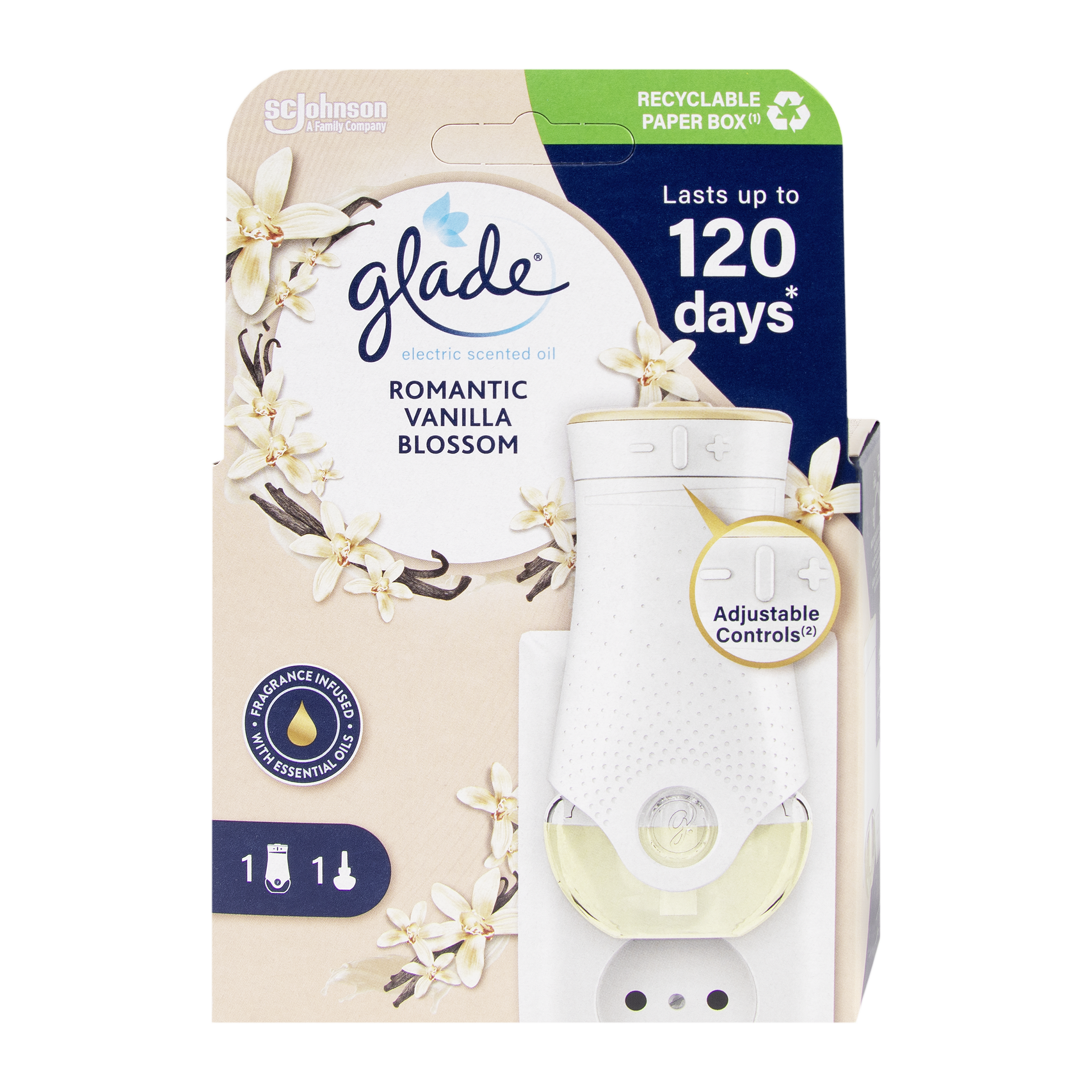 Glade Electric nabízí jednoduché ovládání a skutečnou vůni. Naplňte svůj domov příjemnou vůní s Glade elektrickým osvěžovačem vzduchu a dopřejte si jedinečný vonný zážitek každý den. Strojek s vyměnitelnou náplní stačí vložit do zásuvky a zvolit požadovanou intenzitu vůně. Intenzitu vůně můžete nastavit pro všechny velikosti místností ve vašem domě/bytě. Během chvilky se váš interiér promění na místo plné harmonie, ze kterého nebudete chtít odejít. Protože doma je tam, kde se cítíte dobře. Nový recyklovatelný papírový obal a systém náhradních náplní šetří životní prostředí, delší výdrž vůní i vaši peněženku.