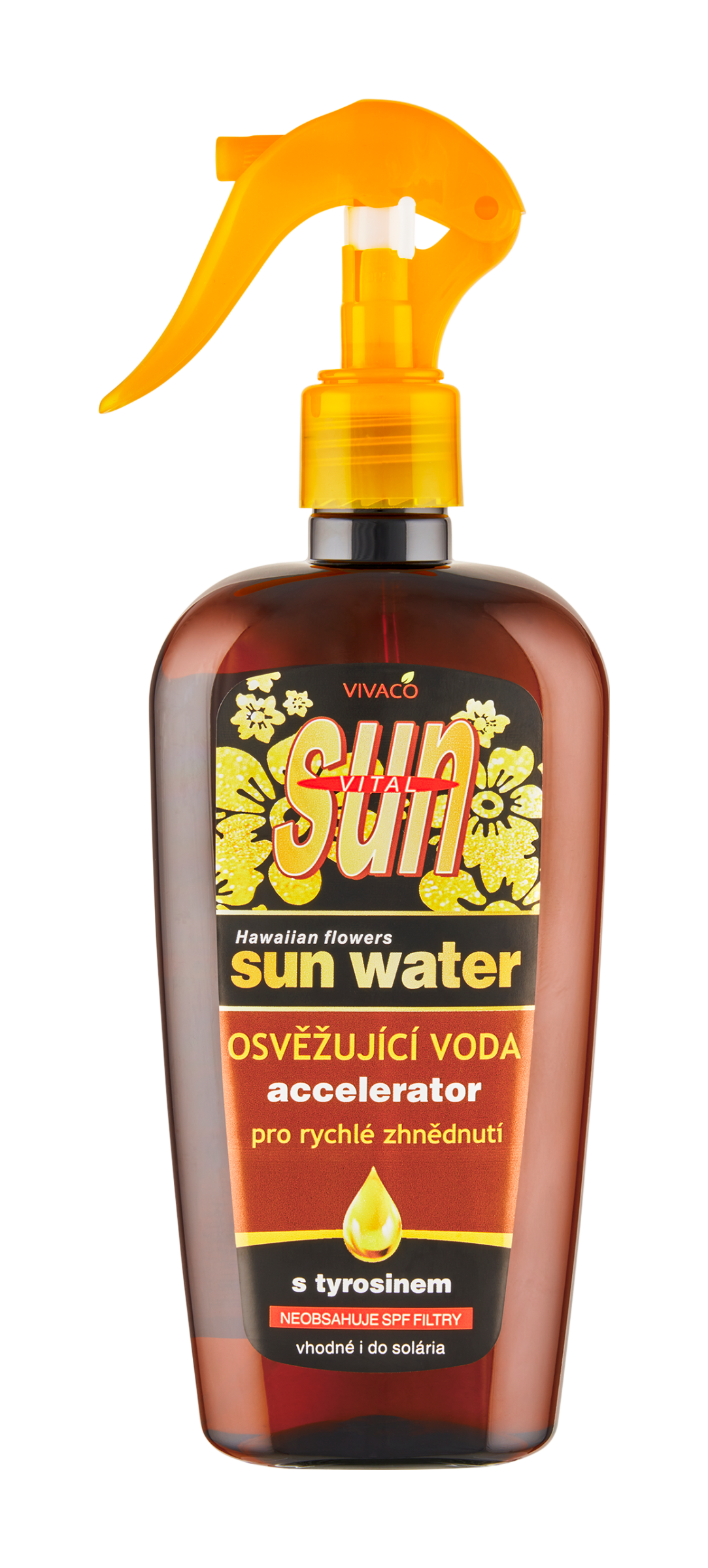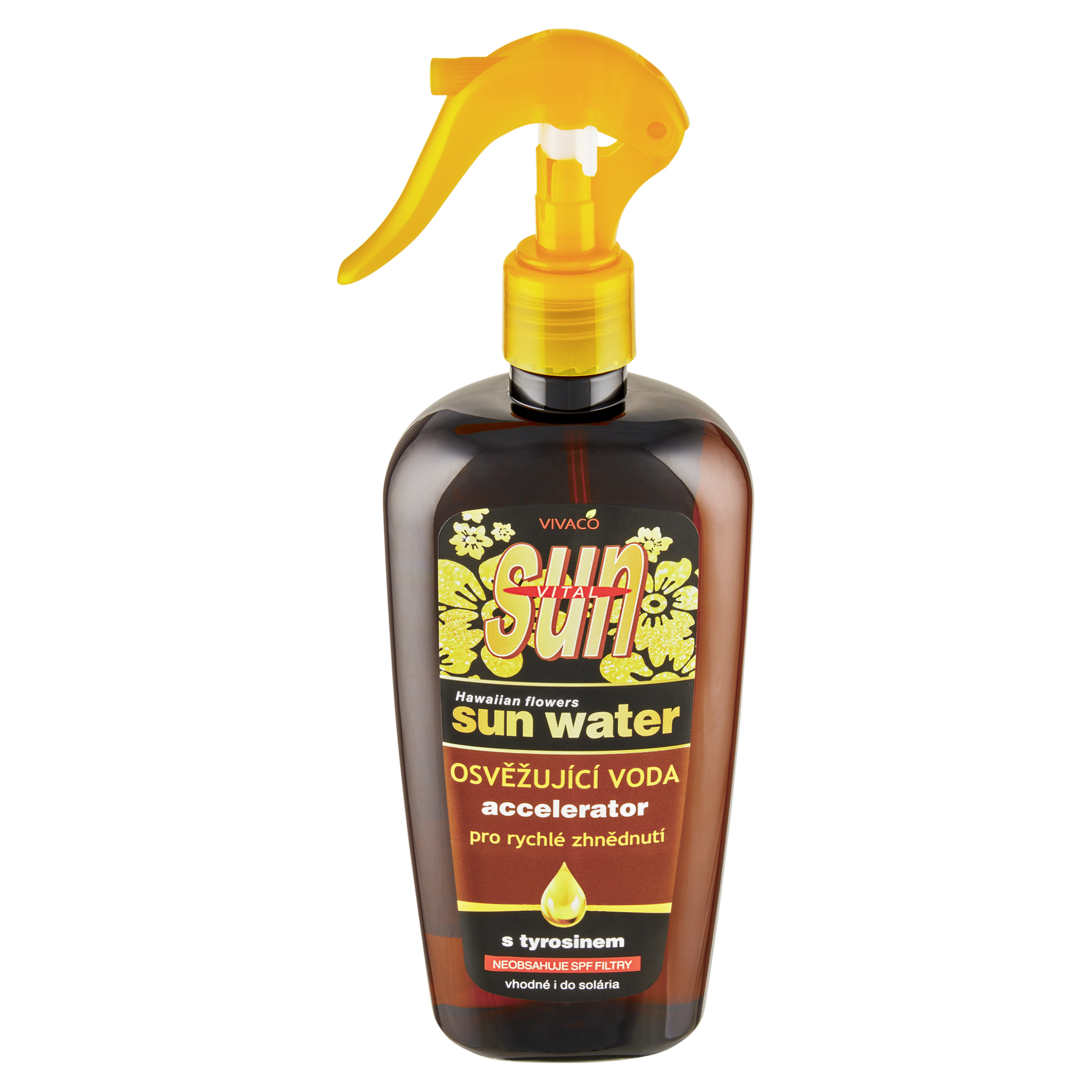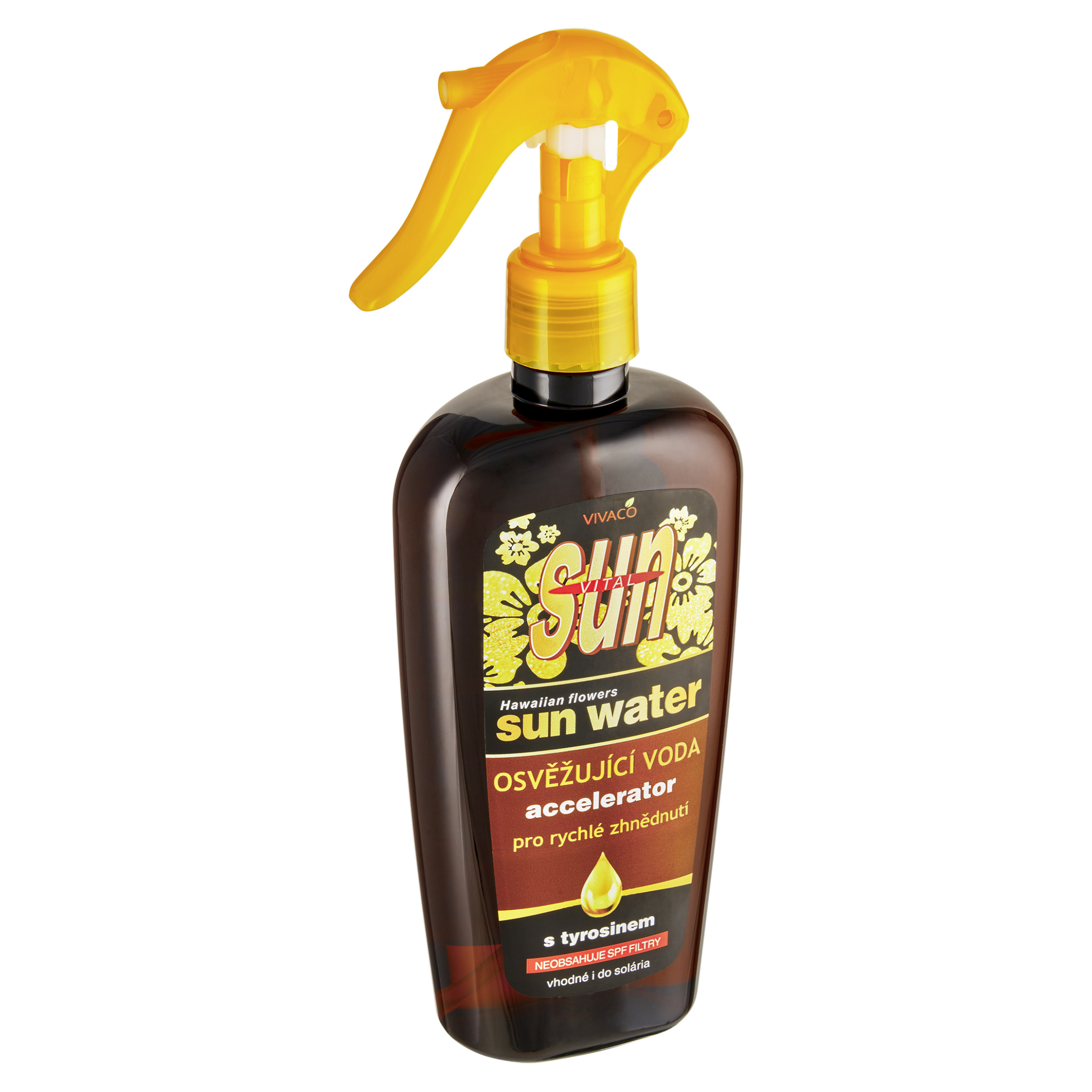 Osvěžující voda s tyrosinem pro urychlení zhnědnutí pokožky. Osvěžující hydratační voda s tyrosinem pro aktivaci a podporu přirozeného zhnědnutí pokožky. Tyrosin bronz akcelerátor urychluje proces opálení a prodlužuje bronzový vzhled pokožky. Extrakty z papáji a zeleného čaje dodají svěžest a hydrataci, zabraňují vysychání a předčasnému stárnutí pokožky. Příjemná květinově ovocná parfemace. Vhodné i do solária.