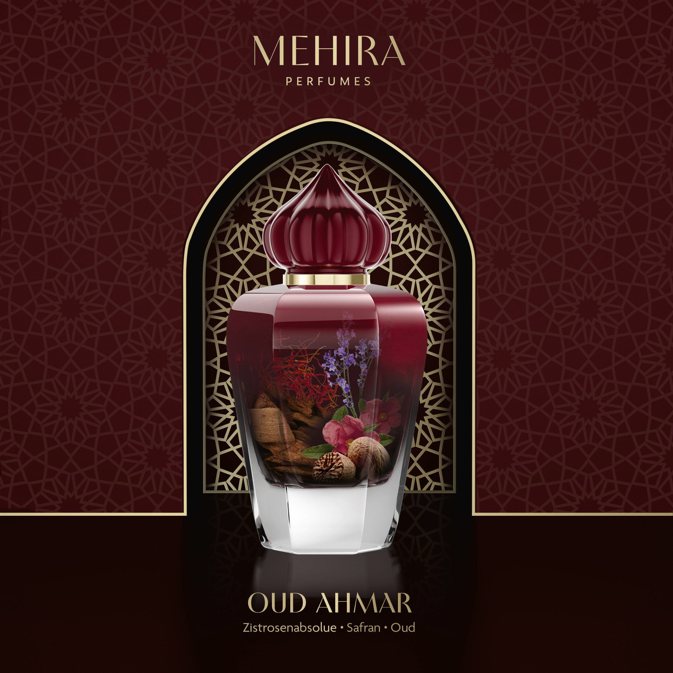MEHIRA Oud Ahmar je vůně ohně, který neplane, ale tiše žhne. Šafrán a muškátový olej otevírají kompozici kořenitou intenzitou, na niž navazuje spojení nagarmothy a oudu. Jemný kožený nádech a žhavá ovocná nota se prolínají celou vůní jako červený záblesk. Základ tvoří kadidlový olej a zemitý pačuli, které dodávají parfému kouřovou, hřejivou hloubku.