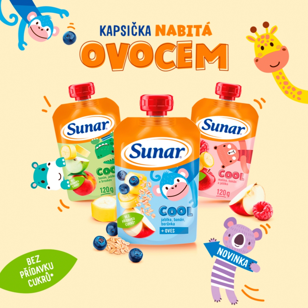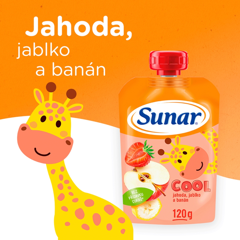 Sunar Cool kapsička je určena pro větší děti od uk. 12. měsíce a obsahuje mix 3 druhů 100% ovocného pyré. Díky většímu objemu skvěle zasytí a doplní energii během dne. Neobsahuje přidaný cukr. Pořádná ovocná svačinka ze třech druhů ovoce pro děti od ukončeného 12. měsíce. 100% ovoce bez zahušťovadel, koncentrátů nebo přídavků cukru. Přirozený zdroj energie - větší porce ovocné kapsičky je ideální na zahnání hladu mezi jídly a doplnění energie v průběhu dne. Unikátní kombinace chutí - zajímavé kombinace 3 druhů ovoce zaručí, že kapsička chutná i nejnáročnější mlsounům.