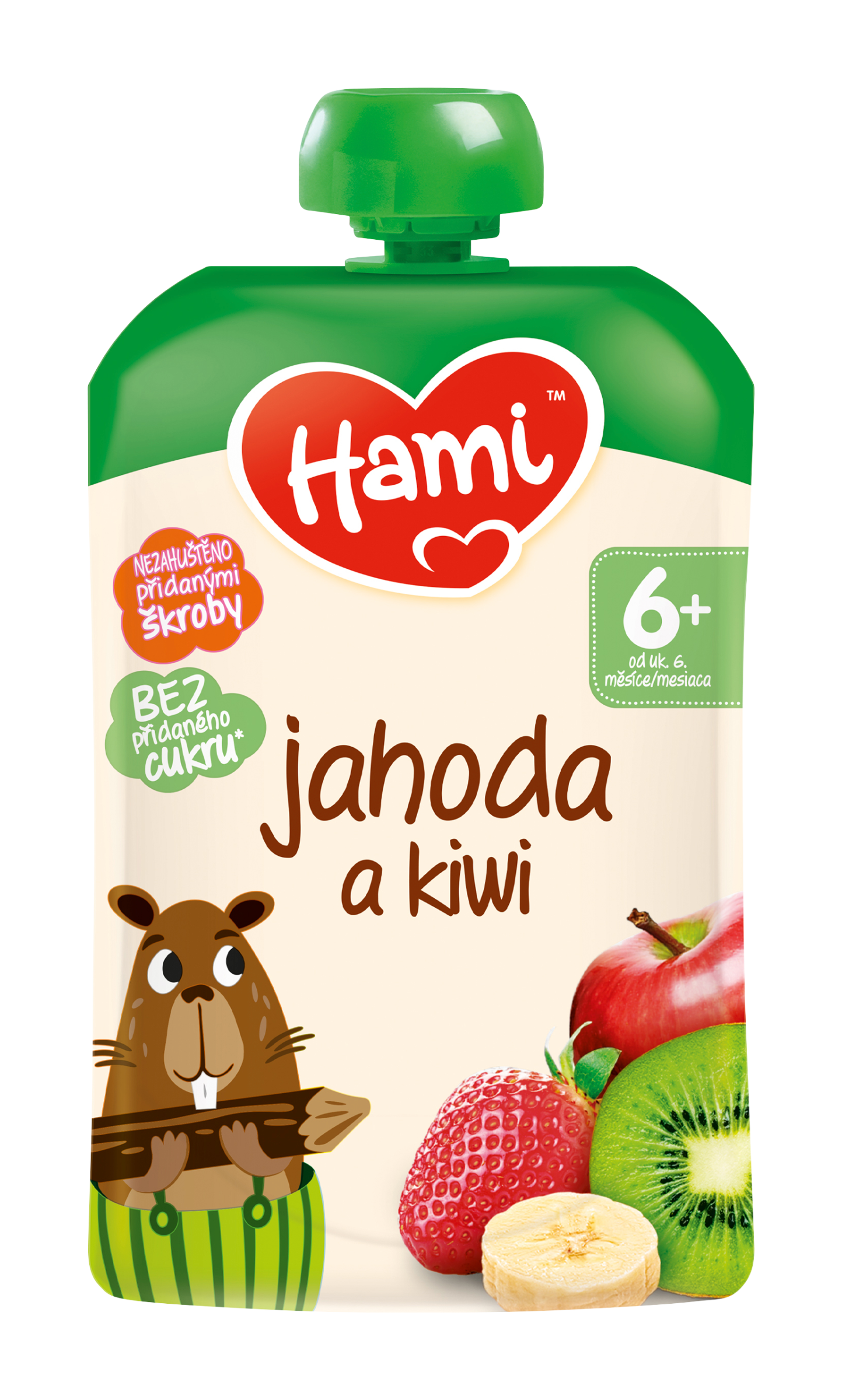 Hami Dovocná kapsička s jahodami a kiwi je ovocná přesnídávka v praktickém balení pro děti od 9. měsíce. 1 kapsička obsahuje 1/3 malého banánu, 1/2 malého jablka, 1,5 jahody a 1/4 kiwi.